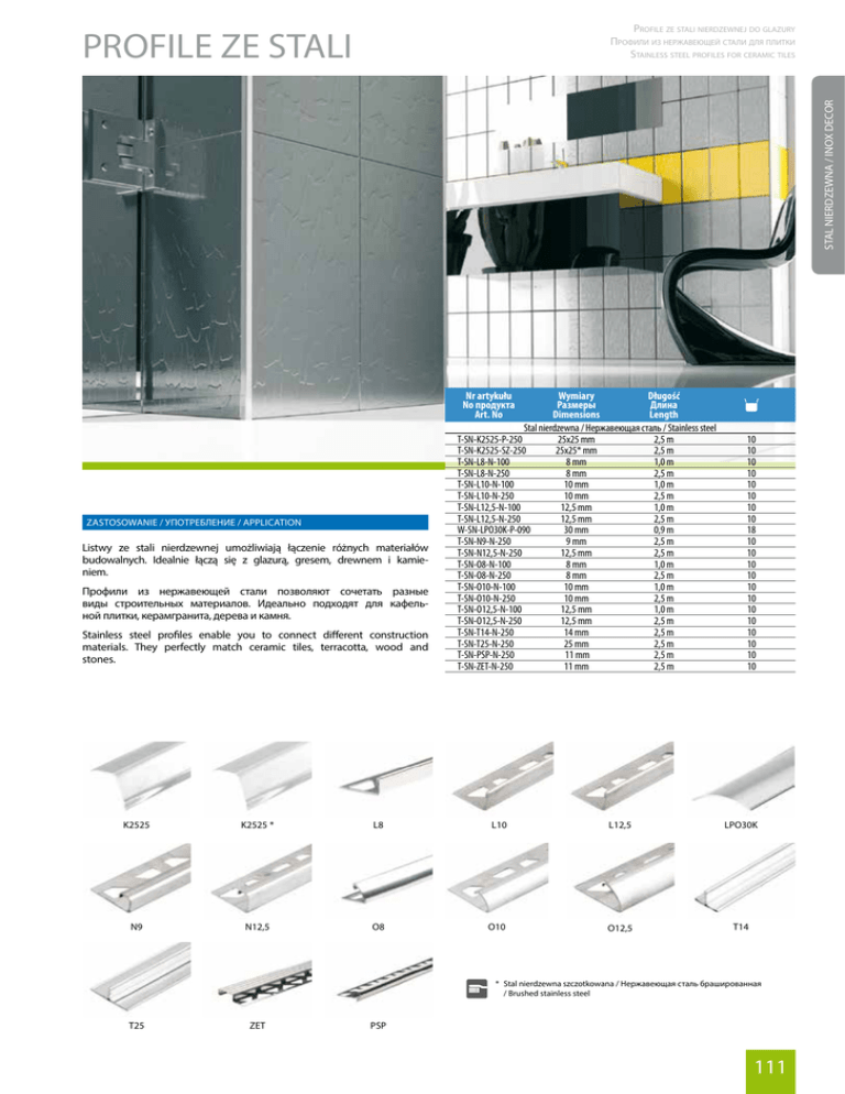 Profile ze stali nierdzewnej do glazury Профили из нержавеющей стали для плитки Stainless steel profiles for ceramic tiles STAL NIERDZEWNA / INOX DECOR PROFILE ZE STALI Nr artykułu No продукта Art. No ZASTOSOWANIE / УПОТРЕБЛЕНИЕ / APPLICATION Listwy ze stali nierdzewnej umożliwiają łączenie różnych materiałów budowalnych. Idealnie łączą się z glazurą, gresem, drewnem i kamieniem. Профили из нержавеющей стали позволяют сочетать разные виды строительных материалов. Идеально подходят для кафельной плитки, керамгранита, дерева и камня. Stainless steel profiles enable you to connect different construction materials. They perfectly match ceramic tiles, terracotta, wood and stones. Wymiary Długość Размеры Длина Dimensions Length Stal nierdzewna / Нержавеющая сталь / Stainless steel T-SN-K2525-P-250 25x25 mm 2,5 m T-SN-K2525-SZ-250 25x25* mm 2,5 m T-SN-L8-N-100 8 mm 1,0 m T-SN-L8-N-250 8 mm 2,5 m T-SN-L10-N-100 10 mm 1,0 m T-SN-L10-N-250 10 mm 2,5 m T-SN-L12,5-N-100 12,5 mm 1,0 m T-SN-L12,5-N-250 12,5 mm 2,5 m W-SN-LPO30K-P-090 30 mm 0,9 m T-SN-N9-N-250 9 mm 2,5 m T-SN-N12,5-N-250 12,5 mm 2,5 m T-SN-O8-N-100 8 mm 1,0 m T-SN-O8-N-250 8 mm 2,5 m T-SN-O10-N-100 10 mm 1,0 m T-SN-O10-N-250 10 mm 2,5 m T-SN-O12,5-N-100 12,5 mm 1,0 m T-SN-O12,5-N-250 12,5 mm 2,5 m T-SN-T14-N-250 14 mm 2,5 m T-SN-T25-N-250 25 mm 2,5 m T-SN-PSP-N-250 11 mm 2,5 m T-SN-ZET-N-250 11 mm 2,5 m 10 10 10 10 10 10 10 10 18 10 10 10 10 10 10 10 10 10 10 10 10 K2525 K2525 * L8 L10 L12,5 LPO30K N9 N12,5 O8 O10 O12,5 T14 * Stal nierdzewna szczotkowana / Нержавеющая сталь брашированная / Brushed stainless steel T25 ZET PSP 111