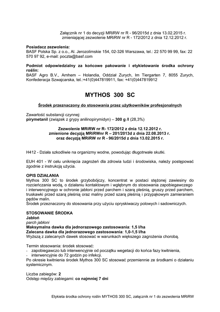 Załącznik nr 1 do decyzji MRiRW nr R - 96/2015d z dnia 13.02.2015 r. zmieniającej zezwolenie MRiRW nr R - 172/2012 z dnia 12.12.2012 r. Posiadacz zezwolenia: BASF Polska Sp. z o.o., Al. Jerozolimskie 154, 02-326 Warszawa, tel.: 22 570 99 99, fax: 22 570 97 92, e-mail: [email protected] Podmiot odpowiedzialny za końcowe pakowanie i etykietowanie środka ochrony roślin: BASF Agro B.V., Arnhem – Holandia, Oddział Zurych, Im Tiergarten 7, 8055 Zurych, Konfederacja Szwajcarska, tel.:+41(0)447819911, fax: +41(0)447819912 MYTHOS 300 SC Środek przeznaczony do stosowania przez użytkowników profesjonalnych Zawartość substancji czynnej: pirymetanil (związek z grypy anilinopirymidyn) – 300 g /l (28,3%) Zezwolenie MRiRW nr R- 172/2012 z dnia 12.12.2012 r. zmienione decyzją MRiRWnr R – 201/2013d z dnia 22.08.2013 r. oraz decyzją MRiRW nr R - 96/2015d z dnia 13.02.2015 r. H412 - Działa szkodliwie na organizmy wodne, powodując długotrwałe skutki. EUH 401 - W celu uniknięcia zagrożeń dla zdrowia ludzi i środowiska, należy postępować zgodnie z instrukcją użycia. OPIS DZIAŁANIA Mythos 300 SC to środek grzybobójczy, koncentrat w postaci stężonej zawiesiny do rozcieńczania wodą, o działaniu kontaktowym i wgłębnym do stosowania zapobiegawczego i interwencyjnego w ochronie jabłoni przed parchem i szarą pleśnią, gruszy przed parchem, truskawki przed szarą pleśnią oraz maliny przed szarą pleśnią i przypąkowym zamieraniem pędów malin. Środek przeznaczony do stosowania przy użyciu opryskiwaczy polowych i sadowniczych. STOSOWANIE ŚRODKA Jabłoń parch jabłoni Maksymalna dawka dla jednorazowego zastosowania: 1,5 l/ha Zalecana dawka dla jednorazowego zastosowania: 1,0-1,5 l/ha Wyższą z zalecanych dawek stosować w warunkach większego zagrożenia chorobą. Termin stosowania: środek stosować: - zapobiegawczo lub interwencyjnie od początku wegetacji do końca fazy kwitnienia, - interwencyjnie do 72 godzin po infekcji. Po okresie kwitnienia środek Mythos 300 SC stosować przemiennie ze środkami o działaniu systemicznym. Liczba zabiegów: 2 Odstęp między zabiegami: co najmniej 7 dni Etykieta środka ochrony roślin MYTHOS 300 SC, załącznik nr 1 do zezwolenia MRiRW Zalecana ilość wody: 500-750 l/ha Zalecane opryskiwanie: drobnokropliste szara pleśń Maksymalna/zalecana dawka dla jednorazowego zastosowania: 1,5 l/ha Termin stosowania: Środek stosować w fazie pełni kwitnienia i w fazie opadania płatków kwiatowych, zwłaszcza podczas deszczowej pogody. Liczba zabiegów: 2 Odstęp między zabiegami: co najmniej 7 dni Zalecana ilość wody: 500-750 l/ha Zalecane opryskiwanie: drobnokropliste Maksymalna liczba zabiegów w sezonie wegetacyjnym w uprawie jabłoni: 2 Grusza parch gruszy Maksymalna/zalecana dawka dla jednorazowego zastosowania: 1,0 l/ha Termin stosowania: środek stosować: - zapobiegawczo lub interwencyjnie od początku wegetacji do końca fazy kwitnienia, - interwencyjnie do 72 godzin po infekcji. Po okresie kwitnienia środek Mythos 300 SC stosować przemiennie ze środkami o działaniu systemicznym. Zalecana ilość wody: 500-750 l/ha Zalecane opryskiwanie: drobnokropliste Maksymalna liczba zabiegów w sezonie wegetacyjnym: 2 Odstęp między zabiegami: co najmniej 7 dni Truskawka szara pleśń Maksymalna/zalecana dawka dla jednorazowego zastosowania: 2,5 l/ha Termin stosowania: Środek stosować od początku do końca fazy kwitnienia. Środek stosować przemiennie z fungicydami należącymi do innych grup chemicznych. Do opryskiwania używać belki typu Fragaria lub opryskiwacza wentylatorowego z kierowanym strumieniem powietrza. Zalecana ilość wody: 500-750 l/ha Zalecane opryskiwanie: drobnokropliste Maksymalna liczba zabiegów w sezonie wegetacyjnym: 2 Odstęp między zabiegami: co najmniej 7 dni Malina przypąkowe zamieranie pędów maliny szara pleśń (środek ogranicza występowanie choroby) Etykieta środka ochrony roślin MYTHOS 300 SC, załącznik do zezwolenia MRiRW Maksymalna/zalecana dawka dla jednorazowego zastosowania: 2,5 l/ha Termin stosowania: Środek stosować w okresie największego zagrożenia chorobami w pełni kwitnienia oraz po zbiorze owoców i wycięciu starych pędów. Środek stosować przemiennie z fungicydami należącymi do innych grup chemicznych. Zalecana ilość wody: 1000 l/ha Zalecane opryskiwanie: drobnokropliste Maksymalna liczba zabiegów w sezonie wegetacyjnym: 3 Odstęp między zabiegami: co najmniej 7 dni Uwaga: Środek po wyschnięciu na powierzchni liści jest odporny na zmywanie przez deszcz. SPORZĄDZANIE CIECZY UŻYTKOWEJ Przed przystąpieniem do sporządzania cieczy użytkowej dokładnie ustalić potrzebną jej ilość. Przed użyciem wstrząsnąć zawartością opakowania. Odmierzoną ilość środka wlać do zbiornika opryskiwacza napełnionego częściowo wodą (z włączonym mieszadłem) i uzupełnić wodą do potrzebnej ilości. Opryskiwać z włączonym mieszadłem. Po wlaniu środka do zbiornika opryskiwacza nie wyposażonego w mieszadło hydrauliczne ciecz mechanicznie wymieszać. Opróżnione opakowania przepłukać trzykrotnie wodą, a popłuczyny wlać do zbiornika z cieczą użytkową. Po przerwie w wykonywaniu zabiegu i przed ponownym przystąpieniem do zabiegu ciecz dokładnie wymieszać. POSTĘPOWANIE Z RESZTKAMI CIECZY UŻYTKOWEJ I MYCIE APARATURY Z resztkami cieczy użytkowej po zabiegu należy postępować w sposób ograniczający ryzyko skażenia wód powierzchniowych i podziemnych w rozumieniu przepisów Prawa wodnego oraz skażenia gruntu, tj.: – po uprzednim rozcieńczeniu zużyć na powierzchni, na której przeprowadzono zabieg, jeżeli jest to możliwe lub – unieszkodliwić z wykorzystaniem rozwiązań technicznych zapewniających biologiczną degradację substancji czynnych środków ochrony roślin, lub – unieszkodliwić w inny sposób, zgodny z przepisami o odpadach. Po pracy aparaturę dokładnie wymyć. Z wodą użytą do mycia aparatury postąpić n