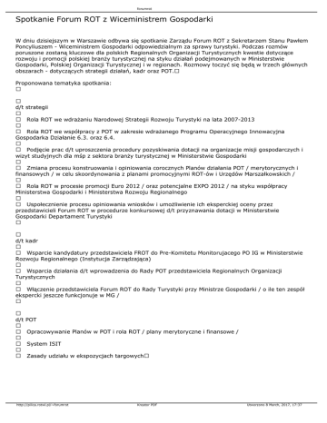 forumrot Spotkanie Forum ROT z Wiceministrem Gospodarki W dniu dzisiejszym w Warszawie odbywa się spotkanie Zarządu Forum ROT z Sekretarzem Stanu Pawłem Poncyliuszem - Wiceministrem Gospodarki odpowiedzialnym za sprawy turystyki. Podczas rozmów poruszone zostaną kluczowe dla polskich Regionalnych Organizacji Turystycznych kwestie dotyczące rozwoju i promocji polskiej branży turystycznej na styku działań podejmowanych w Ministerstwie Gospodarki, Polskiej Organizacji Turystycznej i w regionach. Rozmowy toczyć się będą w trzech głównych obszarach - dotyczących strategii działań, kadr oraz POT. Proponowana tematyka spotkania: d/t strategii · Rola ROT we wdrażaniu Narodowej Strategii Rozwoju Turystyki na lata 2007-2013 · Rola ROT we współpracy z POT w zakresie wdrażanego Programu Operacyjnego Innowacyjna Gospodarka Działanie 6.3. oraz 6.4. · Podjęcie prac d/t uproszczenia procedury pozyskiwania dotacji na organizacje misji gospodarczych i wizyt studyjnych dla mśp z sektora branży turystycznej w Ministerstwie Gospodarki · Zmiana procesu konstruowania i opiniowania corocznych Planów działania POT / merytorycznych i finansowych / w celu skoordynowania z planami promocyjnymi ROT-ów i Urzędów Marszałkowskich / · Rola ROT w procesie promocji Euro 2012 / oraz potencjalne EXPO 2012 / na styku współpracy Ministerstwa Gospodarki i Ministerstwa Rozwoju Regionalnego · Uspołecznienie procesu opiniowania wniosków i umożliwienie ich eksperckiej oceny przez przedstawicieli Forum ROT w procedurze konkursowej d/t przyznawania dotacji w Ministerstwie Gospodarki Departament Turystyki d/t kadr · Wsparcie kandydatury przedstawiciela FROT do Pre-Komitetu Monitorujacego PO IG w Ministerstwie Rozwoju Regionalnego (Instytucja Zarządzająca) · Wsparcia działania d/t wprowadzenia do Rady POT przedstawiciela Regionalnych Organizacji Turystycznych · Włączenie przedstawiciela Forum ROT do Rady Turystyki przy Ministrze Gospodarki / o ile ten zespół ekspercki jeszcze funkcjonuje w MG / d/t · · · POT Opracowywanie Planów w POT i rola ROT / plany merytoryczne i finansowe / System ISIT Zasady udziału w ekspozycjach targowych http://pilica.rotwl.pl/~forumrot Kreator PDF Utworzono 8 March, 2017, 17:37