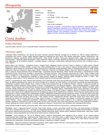 Hiszpania Stolica: Madryt Powierzchnia: 504 645 km² Ludność: 47 150 tys. Waluta: euro (EUR), 1 EUR = 100 centów Napięcie: 230 V Język: hiszpański Wiza: wiza nie jest wymagana Regiony: Andaluzja, Andaluzja - Costa Almeria, Aragonia, Barcelona, Costa Azahar, Costa Blanca, Costa Brava, Costa De La Luz, Costa del Sol, Costa Dorada, El Hierro, Estremadura, Formentera, Fuerteventura, Galicja, Gran Canaria, Ibiza, Kastylia - La Mancha, Kastylia - Leon, Katalonia, La Gomera, La Palma, Lanzarote, Madryt, Majorka, Minorka, Teneryfa, Zielone Wybrzeże Costa Azahar Krótka informacja Lagunowe plaże, lazurowe morze i wspaniałe zabytki „wybrzeża kwiatu pomarańczy”. Informacje ogólne „Wybrzeże Kwiatu Pomarańczy”, jak nazywa się często wybrzeże prowincji Walencja, rozciąga się na odcinku ok. 300 km między deltą Ebru a przylądkiem San Antonio. Wzdłuż całego wybrzeża ciągną się majestatyczne góry Sierra d'Irta będące wspaniałym terenem trekkingowym oraz popularnym miejscem uprawiania sportów ekstremalnych. Costa Azahar to piękne, piaszczyste, lagunowe plaże, ciepłe, lazurowe morze, gaje pomarańczowe i wspaniałe zabytki świadczące o latach świetności regionu. Prowincja, podobnie jak Katalonia czy Kraj Basków podejmowała wiele prób oddzielenia się od Królestwa Hiszpanii, a wszelkie tradycje z przeszłości i podkreślanie odmiennej historii widoczne jest na każdym kroku w całym regionie. Stolicą regionu jest Walencja – przepiękne miasto o bogatej historii sięgającej czasów rzymskich, kiedy to założono tu wielką kolonię Vallentia Edetanorum. Okolice od wieków słynęły z żyznych ziem, które wydawały plony 3-4 razy w roku, przez co stały się również celem wielu najeźdźców. Najdłużej te ziemie należały do muzułmanów, którzy przyczynili się do szybkiego rozwoju głównego miasta. W pierwszej połowie XIII w. miasto zostało ostatecznie odebrane wyznawcom islamu przez Jakuba I Zdobywcę i włączone do królestwa Aragonii. Złoty wiek Walencji przypadł na XV stulecie kiedy to stała się stolicą finansową Morza Śródziemnego i wyprzedziła znacznie Barcelonę. Wtedy również była jednym z najważniejszych portów towarowych Europy Południowej i powstała w niej pierwsza w Hiszpanii drukarnia. Czasy świetności zakończyły się w 1609 r. kiedy z rozkazu króla Filipa III wypędzono z kraju morysków, stanowiących ponad 35% ludności regionu, co bardzo osłabiło tutejszą gospodarkę. Znaczenie miasta spadło również w XVIII w. po zdegradowaniu królestwa do rangi prowincji zależnej od Madrytu. Walencja jednak rozwijała się nadal i w 1982 r. jako największe miasto regionu i trzecie największe miasto Hiszpanii stała się stolicą Comunidad Valenciana. Jednym z najważniejszych miejsc Walencji jest skupiający życie społeczne rynek Plaza del Ayuntamiento nazywany "Placem Narodu Walenckiego". Mimo, że dążenia separatystyczne regionu nie są tak znaczące jak w Katalonii czy Kraju Basków, to Waleńczycy odznaczają się indywidualnością i podkreślają, że główne miasto zdobyło sławę i prestiż na długo przed przyłączeniem go do Królestwa Hiszpanii. Historię, a zwłaszcza pamiątki po największych czasach świetności można znaleźć w ratuszu i mieszczącym się w nim Muzeum Miejskim – zbiory pochodzą głównie z czasów króla Jakuba I, władcy Aragonii, który powszechnie uważany jest za największego wybawcę Walencji. Walencja nazywana jest "Miastem Ceramiki", gdzie rzemiosło zostało podniesione do rangi sztuki i bardzo widoczne jest w tradycjach regionu. Najciekawsze zbiory można podziwiać w Narodowym Muzeum Ceramiki znajdującym się w pałacu del Marques de Dos Aguas. Inne ciekawe miejsce z bogatymi zbiorami to Instituto Valenciano de Arte Moderno, które uważa się za najbardziej dynamicznie rozwijającą się galerię sztuki współczesnej w Hiszpanii. Warto zobaczyć tutejszą katedrę, którą wybudowano w miejscu świątyni Diany i późniejszego meczetu. Najbardziej charakterystyczną jej częścią jest wysoka, XV-wieczna wieża znana jako Miguelete albo w języku walońskim Micalet. W kaplicy katedralnej przechowywany jest purpurowy kielich z agatu, który uważany jest za Święty Gral. Stara część miasta skupia się Barrio del Carmen – sieci wąskich uliczek z zabytkowymi domami, gdzie dziś kwitnie życie nocne miasta. Duże znaczenie dla miasta ma również Plaza de la Virgen, gdzie od stuleci, w czwartki w południe, bez względu na okoliczności spotyka się Trybunał Wodny Walencji – jedna z najbardziej niezwykłych i najstarszych instytucji prawnych świata. Zasiada w nim 8 sędziów reprezentujących jeden z kanałów irygacyjnych wybudowanych ponad dwa tysiące lat temu przez Rzymian, które nadal doprowadzają wodę do wielu gospodarstw miejskich. Obrady odbywają się w języku walenckim, a wszelkie wątpliwości związane z nawadnianiem pól i podziałem ziem zapadają bardzo szybko. Miasto posiada dostęp do pięknej, piaszczystej plaży, która stwarza wspaniałe warunki do wypoczynku i uprawiania sportów wodnych. Pensicola – jeden z najpopularniejszych kurortów Costa Azahar słynący z zamku warownego Castell del Papa Luna usytuowanego na skalistym cyplu. Był on siedzibą Pedra de Luny – uznanego za antypapieża Benedykta XIII podczas tzw. schizmy, która podzieliła Kościół Katolicki. Pensicola jest również miejscowością wypoczynkową, która oferuje szerokie piaszczyste plaże z bardzo dobrym zapleczem rekreacyjnym, wiele hoteli i kwater prywatnych o różnym standardzie, jak również bardzo dobre tawerny z lokalną kuchnią. Alcoceber – kurort położony ok. 100 km od Walencji znany z pięknych piaszczystych plaż ciągnących się na odcinku 10 km i bardzo dobrze zorganizowanej bazy hotelarskiej i gastronomicznej. Miejscowość leży u stóp Sierra d'Irta w pobliżu Parku Narodowego, gdzie można podziwiać wspaniałe zjawi