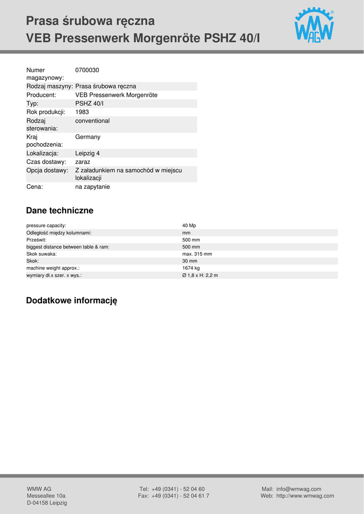 Prasa śrubowa ręczna VEB Pressenwerk Morgenröte PSHZ 40/I Numer magazynowy: Rodzaj maszyny: Producent: Typ: Rok produkcji: Rodzaj sterowania: Kraj pochodzenia: Lokalizacja: Czas dostawy: Opcja dostawy: Cena: 0700030 Prasa śrubowa ręczna VEB Pressenwerk Morgenröte PSHZ 40/I 1983 conventional Germany Leipzig 4 zaraz Z załadunkiem na samochòd w miejscu lokalizacji na zapytanie Dane techniczne pressure capacity: Odległość między kolumnami: Prześwit: biggest distance between table & ram: Skok suwaka: Skok: machine weight approx.: wymiary dł.x szer. x wys.: 40 Mp mm 500 mm 500 mm max. 315 mm 30 mm 1674 kg Ø 1,8 x H: 2,2 m Dodatkowe informację WMW AG Messeallee 10a D-04158 Leipzig Powered by TCPDF (www.tcpdf.org) Tel: +49 (0341) - 52 04 60 Fax: +49 (0341) - 52 04 61 7 Mail: [email protected] Web: http://www.wmwag.com