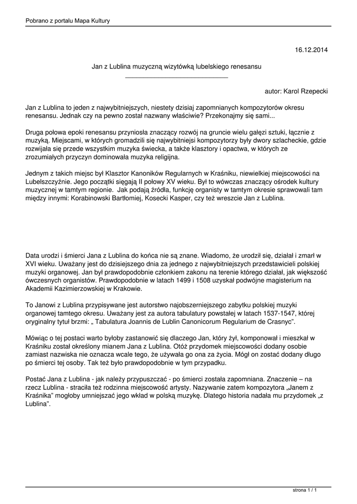 Pobrano z portalu Mapa Kultury 16.12.2014 Jan z Lublina muzyczną wizytówką lubelskiego renesansu ____________________________ autor: Karol Rzepecki Jan z Lublina to jeden z najwybitniejszych, niestety dzisiaj zapomnianych kompozytorów okresu renesansu. Jednak czy na pewno został nazwany właściwie? Przekonajmy się sami... Druga połowa epoki renesansu przyniosła znaczący rozwój na gruncie wielu gałęzi sztuki, łącznie z muzyką. Miejscami, w których gromadzili się najwybitniejsi kompozytorzy były dwory szlacheckie, gdzie rozwijała się przede wszystkim muzyka świecka, a także klasztory i opactwa, w których ze zrozumiałych przyczyn dominowała muzyka religijna. Jednym z takich miejsc był Klasztor Kanoników Regularnych w Kraśniku, niewielkiej miejscowości na Lubelszczyźnie. Jego początki sięgają II połowy XV wieku. Był to wówczas znaczący ośrodek kultury muzycznej w tamtym regionie. Jak podają źródła, funkcję organisty w tamtym okresie sprawowali tam między innymi: Korabinowski Bartłomiej, Kosecki Kasper, czy też wreszcie Jan z Lublina. Data urodzi i śmierci Jana z Lublina do końca nie są znane. Wiadomo, że urodził się, działał i zmarł w XVI wieku. Uważany jest do dzisiejszego dnia za jednego z najwybitniejszych przedstawicieli polskiej muzyki organowej. Jan był prawdopodobnie członkiem zakonu na terenie którego działał, jak większość ówczesnych organistów. Prawdopodobnie w latach 1499 i 1508 uzyskał podwójne magisterium na Akademii Kazimierzowskiej w Krakowie. To Janowi z Lublina przypisywane jest autorstwo najobszerniejszego zabytku polskiej muzyki organowej tamtego okresu. Uważany jest za autora tabulatury powstałej w latach 1537-1547, której oryginalny tytuł brzmi: „ Tabulatura Joannis de Lublin Canonicorum Regularium de Crasnyc”. Mówiąc o tej postaci warto byłoby zastanowić się dlaczego Jan, który żył, komponował i mieszkał w Kraśniku został określony mianem Jana z Lublina. Otóż przydomek miejscowości dodany osobie zamiast nazwiska nie oznacza wcale tego, że używała go ona za życia. Mógł on zostać dodany długo po śmierci tej osoby. Tak też było prawdopodobnie w tym przypadku. Postać Jana z Lublina - jak należy przypuszczać - po śmierci została zapomniana. Znaczenie – na rzecz Lublina - straciła też rodzinna miejscowość artysty. Nazywanie zatem kompozytora „Janem z Kraśnika” mogłoby umniejszać jego wkład w polską muzykę. Dlatego historia nadała mu przydomek „z Lublina”. strona 1 / 1