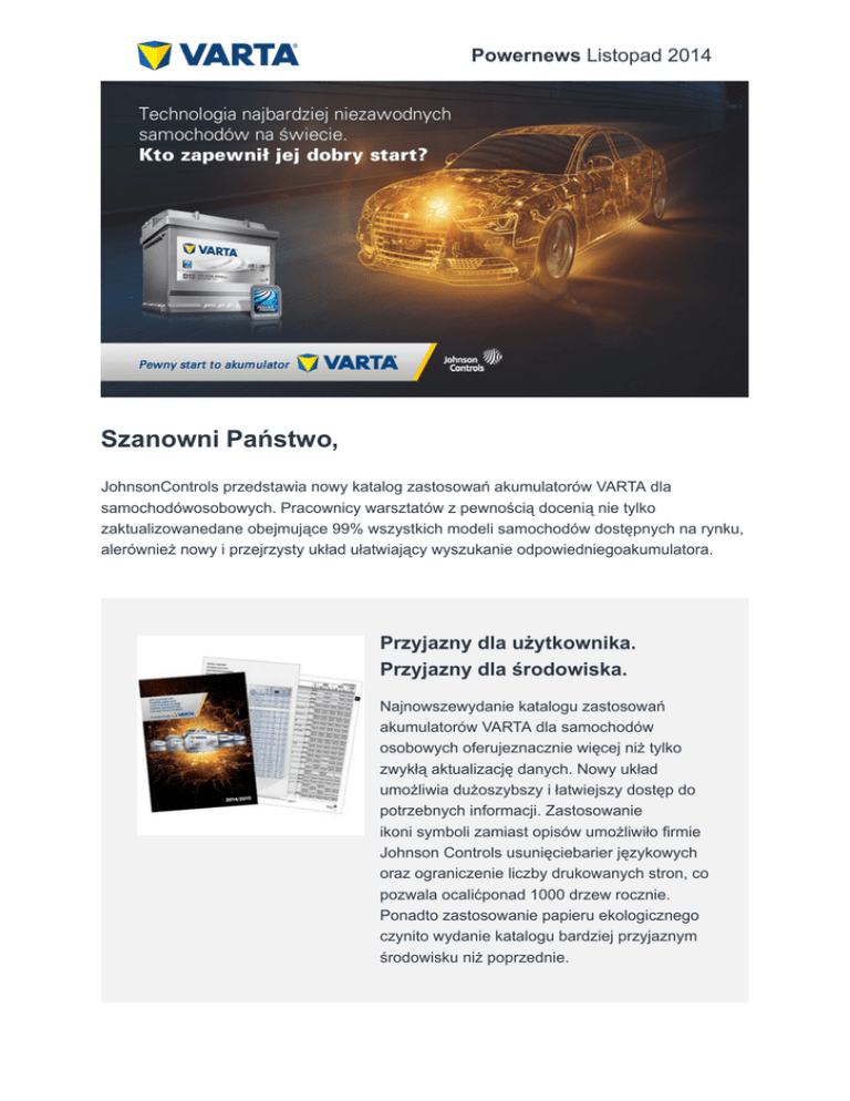 Powernews Listopad 2014 Szanowni Państwo, JohnsonControls przedstawia nowy katalog zastosowań akumulatorów VARTA dla samochodówosobowych. Pracownicy warsztatów z pewnością docenią nie tylko zaktualizowanedane obejmujące 99% wszystkich modeli samochodów dostępnych na rynku, alerównież nowy i przejrzysty układ ułatwiający wyszukanie odpowiedniegoakumulatora. Przyjazny dla użytkownika. Przyjazny dla środowiska. Najnowszewydanie katalogu zastosowań akumulatorów VARTA dla samochodów osobowych oferujeznacznie więcej niż tylko zwykłą aktualizację danych. Nowy układ umożliwia dużoszybszy i łatwiejszy dostęp do potrzebnych informacji. Zastosowanie ikoni symboli zamiast opisów umożliwiło firmie Johnson Controls usunięciebarier językowych oraz ograniczenie liczby drukowanych stron, co pozwala ocalićponad 1000 drzew rocznie. Ponadto zastosowanie papieru ekologicznego czynito wydanie katalogu bardziej przyjaznym środowisku niż poprzednie. Trwała okładka. Szybkie wyniki. Pamiętając, żekatalog zastosowań akumulatorów VARTA dla samochodów osobowych jestw ciągłym użyciu, nowe wydanie ma odporną na przedarcia okładkę, któraprzetrwa najtrudniejsze warunki użytkowania w warsztacie lub punkciesprzedaży. Katalog Johnson Controls umożliwia także zidentyfikowanienowocześniejszej wersji wybranego akumulatora uwzględniając przy tym nowe linieVARTA DYNAMIC BLUE EFB i SILVER AGM. Można w nim znaleźć także akumulatoryprzypisane do pojazdów konwencjonalnych oraz tych z systemem Start-Stop. Certyfikacja TecDoc Dziękioptymalizacji i aktualizacji danych obejmujących aktualnie 99% wszystkichdostępnych na rynku pojazdów, katalog zastosowań akumulatorów VARTA dlasamochodów osobowych stanowi najlepsze kompendium wiedzy o współczesnym rynku –jednocześnie informacje na temat wszystkich akumulatorów VARTA w bazieTecDoc nadal spełniają wszystkie wymagania w zakresie jakości danych. Zdobądź nowykatalog zastosowań akumulatorów VARTA do samochodów osobowych już teraz! Abyuzyskać dostęp do wygodnych opcji pobierania, wystarczy zeskanować kod QR lubprzejść bezpośrednio na stronę: www.varta-automotive.com. > Wyszukiwanie akumulatora > Portal Biznesowy A Johnson Controls Inc. Company Johnson Controls Akumulatory Sp. z o.o. Ul. Ceglana 4 40-514 Katowice Polska Tel: 0048 32 608 69 50 51 Fax: 0048 32 209 55 83 E-mail: [email protected]