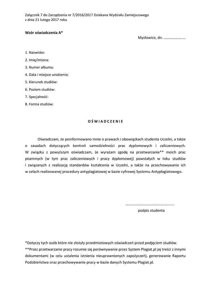 Załącznik 7 do Zarządzenia nr 7/2016/2017 Dziekana Wydziału Zamiejscowego z dnia 21 lutego 2017 roku Wzór oświadczenia A* Mysłowice, dn. ………………….. 1. Nazwisko: 2. Imię/imiona: 3. Numer albumu: 4. Data i miejsce urodzenia: 5. Kierunek studiów: 6. Poziom studiów: 7. Specjalność: 8. Forma studiów: OŚWIADCZENIE Oświadczam, że poinformowano mnie o prawach i obowiązkach studenta Uczelni, a także o zasadach dotyczących kontroli samodzielności prac dyplomowych i zaliczeniowych. W związku z powyższym oświadczam, że wyrażam zgodę na przetwarzanie** moich prac pisemnych (w tym prac zaliczeniowych i pracy dyplomowej) powstałych w toku studiów i związanych z realizacją standardów kształcenia w Uczelni, a także na przechowywanie ich w celach realizowanej procedury antyplagiatowej w bazie cyfrowej Systemu Antyplagiatowego. ……………………………………………. podpis studenta *Dotyczy tych osób które nie złożyły przedmiotowych oświadczeń przed podjęciem studiów. **Przez przetwarzanie pracy rozumie się porównywanie przez System Plagiat.pl jej treści z innymi dokumentami (w celu ustalenia istnienia nieuprawnionych zapożyczeń), generowanie Raportu Podobieństwa oraz przechowywanie pracy w bazie danych Systemu Plagiat.pl.