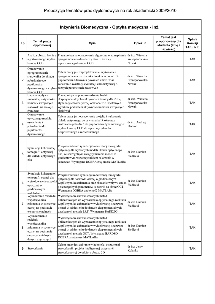 Propozycje tematów prac dyplomowych na rok akademicki 2009/2010 Inżynieria Biomedyczna - Optyka medyczna - inż. Lp 1 2 3 4 5 6 7 8 9 Temat pracy dyplomowej Opis Opiekun Analiza obrazu źrenicy Praca polega na opracowaniu algorytmu oraz napisaniu dr inż. Wioletta rejestrowanego szybka oprogramowania do analizy obrazu źrenicy szczepanowskakamerą CCD rejestrowanego kamerą CCD Nowak Opracowanie i oprogramowanie sterownika do układu pobudzającego pupilometru dynamicznego z szybka kamerą CCD Badanie wpływu samoistnej aktywności komórek zwojowych siatkówki na reakcje źreniczną Opracowanie optycznego modułu oswietlenia i pobudzenia do pupilometru dynamicznego Temat jest proponowany dla studenta (imię i nazwisko): Opinia Komisji TAK / NIE TAK Celem pracy jest zaprojektowanie, wykonanie i oprogramowanie sterownika do układu pobudzeń pupilometru. Sterownik powinien umozliwiać zadawanie świetlnej stymulacji chromatycznej o różnych parametrach czasowych dr inż. Wioletta SzczepanowskaNowak TAK Praca polega na przeprowadzeniu badań eksperymentalnych reaktywnosci źrenicy dla różnej stymulacji chromatycznej oraz analizie uzyskanych wyników pod katem aktywnosci komórek zwojowych siatkówki dr inż.. Wioletta SzczepanowskaNowak TAK Celem pracy jest opracowanie projeltu i wykonanie układu optycznego do oswietlenia IR oka oraz rzutowania pobudzeń do pupilometru dynamicznego z szybka kamerą CCD do rejestracji odruchu bezposredniego i konsensualnego dr inż. Andrzej Hachoł TAK Przeprowadzenie symulacji koherentnej tomografii Symulacje koherentnej optycznej dla wybranych modeli układu optycznego tomografii optycznej dr inż. Damian oka, ze szczególnym uwzględnieniem modeli z dla układu optycznego Siedlecki gradientowym współczynnikiem załamania w oka soczewce. Wymagana DOBRA znajomość MATLABa TAK Symulacja koherentnej tomografii ocznej dla wyizolowanej soczewki optycznej o gradientowym rozkładzie Wyznaczanie rozkładu współczynnika załamania w soczewce ocznej na podstawie eksperymentalnych danych uzyskanych Wyznaczanenie rozkładu współczynnika załamania w soczewce ocznej na podstawie eksperymentalnych danych uzyskanych metodą koherentnej Stereoskopia Przeprowadzenie symulacji koherentnej tomografii optycznej dla soczewki ocznej o gradientowym dr inż. Damian współczynniku załamania oraz zbadanie wpływu zmian Siedlecki poszczególnych parametrów soczewki na obraz OCT. Wymagana DOBRA znajomość MATLABa Wykorzystanie zaawansowanych metod obliczeniowych do wyznaczenia optymalnego rozkładu współczynnika załamania w wyizolowanej soczewce ocznej w odniesieniu do danych eksperymentalnych uzyskanych metodą LRT. Wymagana BARDZO DOBRA znajomosc MATLABa. Wykorzystanie zaawansowanych metod obliczeniowych do wyznaczenie optymalnego rozkładu współczynnika załamania w wyizolowanej soczewce ocznej w odniesieniu do danych eksperymentalnych uzyskanych metodą OCT. Wymagana BARDZO DOBRA znajomosc MATLABa. Celem pracy jest zebranie wiadomości o sztucznej stereoskopii i projekt inteligentnej przystawki stereoskopowej do odbioru obrazu 3D TAK dr inż. Damian Siedlecki TAK dr inż. Damian Siedlecki TAK dr inż. Jerzy Kolanko TAK Propozycje tematów prac dyplomowych na rok akademicki 2009/2010 Badanie właściwości optycznych srebra i 10 dwutlenku tytanu w zolu krzemionkowym Poszukiwanie korelacji pomiędzy właściwościami optycznymi materiałow krzemiokowych otrzymywanych metodą przejścia zolu w żel a stężeniem nanocząstek srebra i stężeniem dwutlenku tytanu w zolu krzemionkowym. Praca w laboratorium "mokrej chemii" oraz samodzielne pomiary spektroskopowe. Temat przeznaczony dla osób cierpliwych ze znajomością języka angielskiego. dr inż. Agnieszka Ulatowska-Jarża TAK Mikroskopia sond skanujących na 11 przykładzie Kelvin Probe Microscopy Podstawy teoretyczne skaningowej mikroskopii bliskich oddziaływań. Zastosowania. Technika przygotowanie próbek i wykonywania badań w Kelvin dr inż. Agnieszka Probe Microscopy. Temat przeznaczony wyłącznie dla Ulatowska-Jarża osób ze znajomością języka angielskiego (udokumentowaną egzaminem, może byc na PWr.). TAK Rodzaje optycznych czujników medycznych.Podstawy Optyczne czujniki w dr inż. Agnieszka konstrukcji czujników medycznych. Czujniki diagnostyce medycznej Ulatowska-Jarża inwazyjne i nieinwazyjne. Miniaturyzacja. Bioczujniki. TAK 12 Zastosowanie pokryć zol- żelowych domieszkowanych 13 tytanem do konstrukcji aplikatorów światłowodowych Zagadnienia interstycjalnej terapii laserowej. Wytwarzanie aplikatorów światłowodowych z różnymi dr inż. Iwona pokryciami. Ocena powtarzalności wytworzonych Hołowacz aplikatorów na podstawie analizy dystrybucji światła na wyjściu z aplikatorów. TAK Nowoczesne materiały stosowane w 14 konstrukcji czujników medycznych Charakterystka materiałów stosowanych jako matryce do konstrukcji optoelektronicznych czujników medycznych. Sposoby wytwarzania matryc czujnikowych. Właściwości materiałów stosowanych na matryce. Badania właściwości fizycznych wybranych materiałów. dr inż. Iwona Hołowacz TAK Antybakteryjne właściwości dwutlenku tytanu na przykładzie 15 zastosowania w urządzeniach medycznych Nanomateriały - sposoby ich wytwarzania i badania właściwości strukturalnych oraz biologicznych. Zagadnienia związane z działaniem nanomateriałów na dr inż. Iwona wybrane gatunki bakterii patogennych. Temat Hołowacz przeznaczony dla osób ze znajomością języka angielskiego TAK Antybakteryjne właściwości srebra na przykładzie 16 zastosowania w urządzeniach medycznych Nanomateriały - sposoby ich wytwarzania i badania właściwości strukturalnych oraz biologicznych. Zagadnienia związane z działaniem nanomateriałów na dr inż. Iwona wybrane gatunki bakterii patogennych. Temat Hołowacz przeznaczony dla osób ze znajomością języka angielskiego. TAK Ostatnio wiele zespołów pracuje bardzo intensywnie nad zastosowaniem 