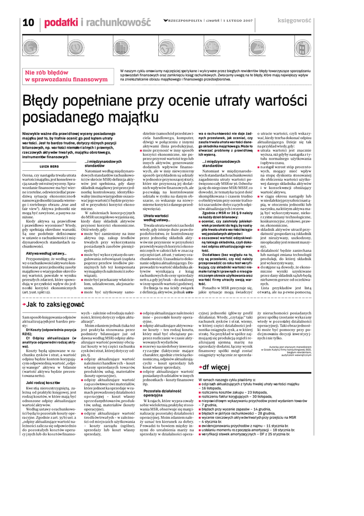10 podatki i rachunkowość Nie rób b∏ędów w sprawozdaniu finansowym ◊rz eczpospolita | czwartek | 1 l ut ego 2007 księgowość W naszym cyklu omaw i a my najczęściej spo t y kane i w y k r y wane przez bieg∏ych rewidentów b∏ędy towarzyszące sporządzaniu s p rawozdań finansowych oraz zamknięciu ksiąg rachunkowych. Zwra ca my uwagę na te b∏ędy, które mają największy wp∏yw na zniekszta∏cenie obrazu majątkowego i finansowego przedsiębiorst wa . B∏ędy pope∏niane przy ocenie utraty wartości posiadanego majątku Niezwykle wa˝ne dla praw i d ł owej wyceny posiadanego m a j ątku jest to, by trafnie ocenić go pod kątem utraty wa r tości. Jest to bardzo trudne, dotyczy ró ˝ nych pozycji b i l a n s ow ych, np. wa r tości niemate r i a l nych i p rawnych, r z e c z ow ych akt y wów trwa ł ych, majątku obro towe g o, inst r u m e n tów fi n a n s ow yc h ...i międzynarodow ych standardów LUIZA BERG Ocena, czy nastąpiła trwała utrata wartości majątku, jest konsekwe ncją zasady ost ro˝nej wyceny. Sprawozdanie finansowe ma być wierne i rzetelne, odzwierciedlać prawdziwą sytuację eko n o m i c z n o-finansową jednostki (zasada wiernego i rzetelnego obrazu „true and fair view”). Aktywa jednostki nie mogą być zawy˝one, a pasywa zani˝one. Kiedy aktywa są praw i d ł owe i prawidłowo wycenione? Wtedy, gdy spełniają określone warunki. Są one podobnie defi n i owane w ustawie o rachunkowości i m i ędzynarodowych standardach rachunkowości. Akt y wa według ust aw y... Przypomnijmy, ˝e według ust awy o rachunkowości aktywa to kontrolowane przez jednostkę zasoby majątkowe o wiarygodnie okre ś l onej wartości, pow stałe w wyniku przeszłych zdarzeń, które spowodują w p r z yszłości wpływ do j e dn o stki korzyści ekonomicznych (art. 3 ust. 1 pkt 12). Natomiast według międzynarodowych standardów rachunkowości (w skrócie MSR) definicja aktywów jest spełniona, gdy dany składnik majątkowy jest przez jednostkę kontrolowany, identyfi kowalny (mo˝na wiarygodnie oszacować jego wartość) i będzie przynosił w przyszłości korzyści eko n omiczne. W zało˝eniach konce p cy j nych do MSR szczegółowo wyjaśnia się, kiedy dany składnik aktywów przynosi korzyści ekonomiczne. Otó˝ wtedy, gdy: ∑ mo˝e być zamieniony na inne aktywa (np. zakup środków trwałych przy wyko r z ystaniu p o s i a d a nych zasobów pienię˝nych), ∑ mo˝e być wyko r z yst a nydo uregulowania zobowiązań (zapłata poprzez przelew środków pienię˝nych lub te˝ kompensata wymagalnych nale˝ności i zobowiązań), ∑ mo˝e być przekazany właścicielom, udziałowcom, akcjonariuszom, ∑ mo˝e być u˝ytkowany samo- dzielnie (samochód przedst aw iciela handlowe g o, komputer, dźwig) w połączeniu z innymi aktywami (linia pro d u kcyjna), ∑ mo˝e przynosić w inny sposób korzyści ekonomiczne, nie poprzez przyrost wartości tego lub innych aktywów, generowanie dodatnich wpływów finansowych, ale w inny niew y m i e r ny sposób (przykładem są udziały w jednostce przynoszącej st ra t y, które nie przynoszą jej dodatnich wpływów finansowych, ale p o z walają na kontrolowanie udziału w rynku na danym obszarze, co wskazuje na n i ew ymierne korzyści z danego przedsięwzięcia). Utrata wartości według ustawy... Trwała utrata wartości zachodzi wtedy, gdy istnieje du˝e praw d op o d o b i e ń st wo, ˝e kontrolowa ny przez jednostkę składnik aktyw ów nie przyniesie w przyszłości przewidywanych korzyści eko n om i c z nych w całości lub w z n a c z ącej części (art. 28 ust. 7 ustawy o rachunkowości). Uzasadnia to dokonanie odpisu aktualizującego. Doprowadzi to wartość składnika aktywów wynikającą z ksiąg rachunkowych do ceny sprzeda˝y nett o, a gdy jej brak – do ustalonej w i n ny sposób wartości godziwej. D e finicja ta ma ścisły związek z definicją aktywów, jednak u st a- wa o ra c h u n kowości nie daje ˝adnych przesłanek, jak oceniać, czy zaszła trwała utrata wa r tości danego składnika mająt kowe g o. Mo˝e to st warzać pro b l e my z p raw i d ł ową ich wyce n ą . ...i m i ę d z y n a ro d ow ych st a n d a rd ów Natomiast w międzynarodowych standardach rachunkowości zagadnieniu utraty wartości poświęcono cały MSR nr 36. Odwo ł ują się do niego inne MSR/MSSF, co dowodzi, ˝e tematyka ta jest dość skomplikowana i czasem trudno o obiektywizm przy ocenie tra f n ości szacunków dotyc z ą cych odpisów aktualizujących i rezerw. Zgodnie z MSR nr 36 § 9 nale˝y na ka˝dy dzieƒ bilansow y : ∑ oceniać, czy zaistniały jakiekolwiek przesłanki do te g o, by nast ąpiła trwała utrata wa r tości ks i ę g owej posiadanych aktywów i ∑ o s z a cować wa r tość odzyskiwa lną takiego składnika, czyli dokonać odpisu aktu a l i z u j ą cego wa rtość. D o d at kowo (bez względu na to, czy są przesłanki, czy nie) nale˝y p r z e p rowadzić co roku test we r y fik u j ą cy, czy składniki wa r tości niem ate r i a l nych i p raw nych o n i e o g ran i c z o nym okresie u˝ytkowania ora z wa r tość fi r my utraciły swoją wa rto ś ć . Ponadto w MSR precyzuje się, jakie sytuacje mogą świadczyć o utracie wartości, czyli wska z ywać, kiedy trzeba dokonać odpisu aktualizujące g o. Dzieje się tak na przykład wtedy, gdy: ∑ utrata wartości jest znacznie wy˝sza, ni˝ gdyby nastąpiła z t ytułu normalnego u˝ytkowania i upływu czasu, ∑ n a stąpił wzrost stóp pro ce n t owych, mogący mieć wpływ na stopę dyskonta st o s owanej do obliczenia wartości u˝ytkowej danego składnika aktywów i w ko n s e k wencji obni˝ający wartość aktywu, ∑ w ciągu okresu nastąpiły lub w niedalekiej przyszłości nast ąpią, w otoczeniu jednostki lub na rynku, na którym aktywa mają być wyko r z ystywane, niekor z ystne zmiany technologiczne, konkurencyjne, rynkowe, prawne, ekonomiczne, ∑ składnik aktywów utracił przydatno