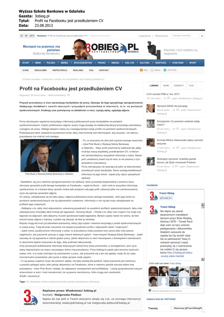 Wy¿sza Szko³a Bankowa w Gdañsku Gazeta: 3obieg.pl Tytu³: Profil na Facebooku jest przed³u¿eniem CV Data: 23.08.2013 23 08 2013 Nowości: Profil na Facebooku jest przedłużeniem CV - dodano 39 minut temu Monopol na przemoc ma państwo Bartłomiej Sienkiewicz START NEWS O NAS REGULAMIN STRONA GŁÓWNA POLSKA Mandaty z tych radarów są bezprawne BIZNES WSPÓŁPRACA HEADLINE Szukaj w serwisie... Logowanie | Rejestracja SPOŁECZEŃSTWO REKLAMA FAQ PRAWO WIEDZA ONA I ON KULTURA KONTAKT PROFIL NA FACEBOOKU JEST PRZEDŁUŻENIEM CV RSS WARTOŚCI EMAIL HYDE PARK SPORT TWITTER LUBIANE NOWE KOMENTY TAGI Profil na Facebooku jest przedłużeniem CV 0,4% wzrostu PKB w I kw. 2013 Napisano 39 minut temu | Brak komentarzy 101 dni temu | 13 | autor: Wiadomosci 3obieg.pl Przyszli pracodawcy w sieci sprawdzają kandydatów do pracy. Używają do tego specjalnego oprogramowania śledzącego działalnoś ć swoich obecnych i przyszłych pracowników w internecie, m.in. na portalach Wymyślił ADHD dla pieniędzy społecnościowych. Analizują czas poświęcony na działalność w sieci, czytają wpisy, oglądają zdjęcia. 65 dni temu | 12 | autor: Wiadomosci 3obieg.pl społecznościowych. Często publikowane zdjęcia i posty mogą zaważyć na ostatecznej decyzji przyszłego pracodawcy Szczepionki: Co powinien wiedzieć każdy rodzic? o przyjęciu do pracy. Dlatego eksperci radzą, by z rozwagą tworzyć swoje profile na portalach społecznościowych. 24 dni temu | 12 Podstawą jest takie ustawienie prywatności konta, żeby mieć kontrolę nad informacjami, aby przyszły - lub obecny - 3obieg.pl Firmy rekrutacyjne regularnie korzystają z informacji publikowanych przez kandydatów na portalach | autor: Wiadomosci pracodawca nie miał do nich dostępu. - To, co wrzucamy do sieci jest czę ścią naszego wizerunku Komisja Millera sfałszowała zapisy czarnych - mówi Piotr Bucki z Wyższej Szkoły Bankowej skrzynek w Gdańsku. - Nasz profil powinniśmy traktować tak, jakby 17 dni temu | 12 3obieg.pl miał być naszą wizytówką, przedłużeniem CV, w którym | autor: Wiadomosci nie zamieścilibyśmy wszystkich informacji o sobie. Nawet Piotr Bucki z Wyższej Szkoły Bankowej w Gdańsku jeśli uwielbiamy bawić s ię do rana, to nie piszemy o tym Szokujące wyznanie: Izraelska gazeta przyszłemu pracodawcy. donosi, jak Żydzi mordowali Polaków Firmy rekrutacyjne nie opierają s ię tylko na dokumentach 43 dni temu | 9 przesłanych przez kandydata. Same szukają dodatkowych 3obieg.pl | autor: Wiadomosci informacji na jego temat - często przy użyciu specjalnych aplikacji. - Spotkałem się już z wieloma oprogramowaniami do aplikacji, które pozwalały bezpośrednio z poziomu biura rekrutacji sprawdzić profil danego kandydata na Facebooku - wyjaśnia Bucki. - Jeśli miał on wszystkie informacje FACEBOOK upublicznione, to w bardzo łatwy sposób można było przejrzeć cały jego profil, zobaczyć jakie ma zainteresowania, Trzeci Obieg czym się zajmuje sprawdzić zdjęcia. Co więcej, odnajdywane są nie tylko wpisy i zdjęcia publikowane przez samego kandydata. Jeśli jego konta na Lubię to! portalach społecznościowych nie są odpowiednio ustawione, informacje o nim są bez trudu odnajdywane na profilach jego znajomych. Trzeci Obieg - Zadbajmy o to, żeby mieć odpowiednio ustawioną prywatność na wszelkich profilach społecznościowych, żeby mieć Nie dajcie się ukarać bezprawnymi mandatami karnymi przez Straż Miejską, Gminną i GITD - Tomek Parol daje wam na tacy wzorzec postępowania i dokumentów. Dostałeś wezwanie do zapłaty bo Cię strzelił radar lub za parkowanie? Każą Ci wskazać sprawcę? Lepiej przeczytaj, by z wykroczenia nie zrobiła Ci się sprawa karna http://3obieg.pl/radary -anuluj-sobie-mandat zabezpieczone chociażby takie funkcje jak tagowanie - tłumaczy Bucki. - Chodzi o to, żeby nasi znajomi nie mogli nas tagować na zdjęciach, albo żebyśmy musieli aprobować każde tagowanie. Bardzo często nawet nie wiemy, że ktoś wrzucił nasze zdjęcia z imprezy, a potem się okazuje, że ktoś je odnalazł. Kłopoty mogą też mieć już zatrudnieni pracownicy, którzy zbyt często i otwarcie korzystają z portali społecznościowych w czasie pracy. Tutaj też duże znaczenie ma stopień prywatności profilu i odpowiedni dobór "znajomych". - Jeżeli mamy upublicznione informacje o sobie, to pracodawca może postawić nam zarzut albo mieć pewne wątpliwości, jak pracownik pracuje w ciągu swoich etatowych godzin - mówi ekspert Wyższej Szkoły Bankowej. - Jeżeli zauważy, że są logowania w trakcie godzin pracy, jakieś aktywności w sieci niezwiązane z obowiązkami zawodowymi, to absolutnie będzie miał prawo do tego, żeby podnieść taką kwestię. Inną sprawą jest publikowanie informacji dotyczących samej firmy przez pracownika, w szczególności, jeśli są to wpisy nieprzychylne czy wręcz naruszające dobre imię pracodawcy. Firmy traktują to często jako łamanie lojalności wobec nich, a to może skończyć s ię zwolnieniem z pracy. Jak pracownik się z tym nie zgadza, może iść do sądu, chociaż trudno przewidzieć, jaki wyrok w takiej sprawie może zapaść. 6 - To są sprawy zupełnie nowe dla polskich sądów, nie tylko zresztą dla polskich, kiedy pracownik jest zwolniony z powodu jakiegoś wpisu albo jakiejś aktywności na Facebooku, która w rzekomy sposób narusza dobre imię 5 2.876 osób lubi obiekt Trzeci Obieg. pracodawcy - mówi Piotr Bucki i dodaje, że najlepszym rozwiązaniem jest profilaktyka. - Lepiej gospodarować naszym wizerunkiem w sieci i mieć świadomość, że są pewne mechanizmy, które mogą nam zaszkodzić. Źródło: newseria.pl Tags: CV, facebook, media społecznościowe, portal, pracodawca, rekrutacja Napisane przez: Wiadomosci 3obieg.pl Wtyczka społecznościowa Facebooka Kontakt: Malgorzata Pietkun Napisz do nas jeśli w Twoim otoczeniu dzieje się c oś, co wymaga interwencji ZOBACZ NAS NA TWITTERZE dzienn
