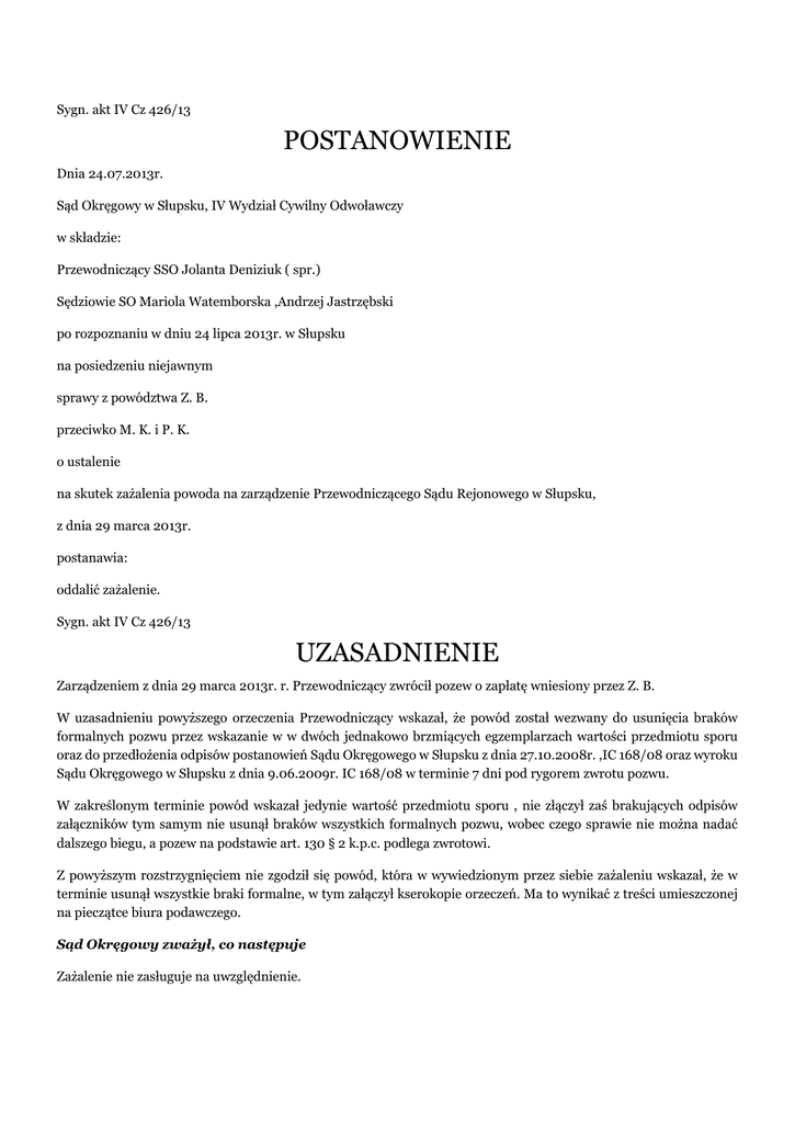 Sygn. akt IV Cz 426/13 POSTANOWIENIE Dnia 24.07.2013r. Sąd Okręgowy w Słupsku, IV Wydział Cywilny Odwoławczy w składzie: Przewodniczący SSO Jolanta Deniziuk ( spr.) Sędziowie SO Mariola Watemborska ,Andrzej Jastrzębski po rozpoznaniu w dniu 24 lipca 2013r. w Słupsku na posiedzeniu niejawnym sprawy z powództwa Z. B. przeciwko M. K. i P. K. o ustalenie na skutek zażalenia powoda na zarządzenie Przewodniczącego Sądu Rejonowego w Słupsku, z dnia 29 marca 2013r. postanawia: oddalić zażalenie. Sygn. akt IV Cz 426/13 UZASADNIENIE Zarządzeniem z dnia 29 marca 2013r. r. Przewodniczący zwrócił pozew o zapłatę wniesiony przez Z. B. W uzasadnieniu powyższego orzeczenia Przewodniczący wskazał, że powód został wezwany do usunięcia braków formalnych pozwu przez wskazanie w w dwóch jednakowo brzmiących egzemplarzach wartości przedmiotu sporu oraz do przedłożenia odpisów postanowień Sądu Okręgowego w Słupsku z dnia 27.10.2008r. ,IC 168/08 oraz wyroku Sądu Okręgowego w Słupsku z dnia 9.06.2009r. IC 168/08 w terminie 7 dni pod rygorem zwrotu pozwu. W zakreślonym terminie powód wskazał jedynie wartość przedmiotu sporu , nie złączył zaś brakujących odpisów załączników tym samym nie usunął braków wszystkich formalnych pozwu, wobec czego sprawie nie można nadać dalszego biegu, a pozew na podstawie art. 130 § 2 k.p.c. podlega zwrotowi. Z powyższym rozstrzygnięciem nie zgodził się powód, która w wywiedzionym przez siebie zażaleniu wskazał, że w terminie usunął wszystkie braki formalne, w tym załączył kserokopie orzeczeń. Ma to wynikać z treści umieszczonej na pieczątce biura podawczego. Sąd Okręgowy zważył, co następuje Zażalenie nie zasługuje na uwzględnienie. Stosownie do treści zacytowanego przez Przewodniczącego przepisu art. 128 § 1 k.p.c., do pisma procesowego należy dołączyć jego odpisy i odpisy załączników dla doręczenia ich uczestniczącym w sprawie osobom, a ponadto, jeżeli w sądzie nie złożono załączników w oryginale, po jednym odpisie każdego załącznika do akt sądowych. Zważyć przy tym należy, iż jest to obowiązek ciążący na stronie postępowania – podobnie jak obowiązek wniesienia pisma procesowego spełniającego wszelkie wymogi formalne czy opłacenia pisma. Strona obowiązku tego nie może scedować na pracowników sądu, zwłaszcza pracowników biura podawczego, którzy przyjmuje pisma kierowane do wszystkich wydziałów i nie jest uprawniony do weryfikacji składanych pism i ich ilości. To same strony decydują jakie pisma wnoszą do sądu i to na stronie ciąży obowiązek staranności, który winien wyrazić się m.in. w załączeniu do pozwu nie tylko kompletu załączników, ale i kompletu odpisów tychże załączników. Z treści pieczęci , na którą powołuje się skarżący, wynika jedynie , że w dniu 20.03.2013r. złożono w oryginale pismo z dnia 20.03.2013r. oraz odpis tego pisma. Nie została zaś odnotwane , że składający pismo jednocześnie złożył brakujące załączniki. W aktach sprawy brak zaś żądanych orzeczeń. Niewątpliwie brak odpisu załącznika stanowi, na co słusznie zwrócił uwagę Przewodniczący, brak formalny pozwu, skutkujący zastosowaniem rygoru z art. 130 § 2 k.p.c. Pod takim zresztą rygorem powód był wzywany do ich usunięcia. Sąd Najwyższy w postanowieniu z dnia 19 grudnia 2006 r. w sprawie V CZ 103/06 (LEX nr 610105) trafnie wskazał, iż określony w art. 128 k.p.c. obowiązek dołączania odpisów pism i ich załączników dotyczy tych pism, co do których przewidziany jest obowiązek doręczenia ich uczestniczącym w sprawie podmiotom. Ratio legis tego przepisu polega na umożliwieniu osobom biorącym udział sprawie zaznajomienia się z materiałem procesowym oraz przygotowanie się do udziału w postępowaniu. W postanowieniu z dnia 16 kwietnia 2009 r. w sprawie I CZ 16/09 (LEX nr 738326) SN wyjaśnił z kolei, że niedołączenie do pisma procesowego odpisów w liczbie wymaganej przez art. 128 k.p.c. stanowi brak formalny, podlegający usunięciu przez wnoszącego pismo zgodnie z przepisem art. 130 k.p.c., pod sankcją w nim określoną. Termin wyznaczony do usunięcia braku formalnego pisma jest niezachowany, jeżeli strona w zakreślonym terminie w ogóle nie podjęła czynności uzupełniającej lub wprawdzie ją podjęła, ale mimo to brak nie został w całości uzupełniony. Także w postanowieniach z dnia 23 grudnia 1968 r. w sprawie I PZ 67/68 (LEX nr 6434) oraz z dnia 21 kwietnia 1966 r. w sprawie II CZ 16/66 (LEX nr 5976) Sąd Najwyższy przyjął, że brak odpisów pozwu z załącznikami dla uczestniczących w sprawie stron jest takim brakiem formalnym pozwu, który uniemożliwia nadanie mu prawidłowego biegu, a niezłożenie odpisów pozwu w ilości odpowiadającej ilości osób oznaczonych w pozwie jako pozwani w terminie określonym w art. 130 § 1 uzasadnia zwrot pozwu w myśl art. 130 § 2 k.p.c. Zasadnie zatem Przewodniczący przyjął, że nie złożenie w terminie zakreślonym dla usunięcia braków formalnych pozwu odpisu orzeczeń sądowych stanowi taki brak formalny pozwu, który uniemożliwia nadanie mu dalszego biegu, wobec czego pozew z mocy art. 130 § 2 k.p.c. winien zostać zwrócony. Jednocześnie wskazać należy ,że zwrot pozwu nie wywołuje żadnych skutków prawnych , jakie ustawodawca wiąże z wniesieniem sprawy, w tym powagi rzeczy osądzonej .W tej sytuacji pozwany może ponownie wnieść uzupełniony już prawidłowo pozew. W związku z powyższym zażalenie powoda na mocy art. 385 w zw. z art. 397 § 2 k.p.c. podlegało oddaleniu.