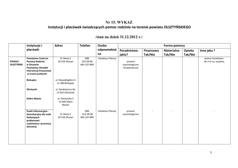 Nr 15. WYKAZ instytucji i placówek świadczących pomoc rodzinie na terenie powiatu OLSZTYŃSKIEGO /stan na dzień 31.12.2012 r./ Instytucje i placówki POWIAT OLSZTYŃSKI Powiatowe Centrum Pomocy Rodzinie w Olsztynie Powiatowy Ośrodek Interwencji Kryzysowej w trzech punktach: Adres Pl. Bema 5 10-516 Olsztyn Biskupiec ul. Niepodległości 4 11-300 Biskupiec Olsztynek ul. Sienkiewicza 26, 11-015 Olsztynek Dobre Miasto Punkt Informacyjno Konsultacyjny dla osób Dotkniętych problemami uzależniena i przemocy domowej Telefon Osoba odpowiedzial Poradnictwona jakie? (89) 523-28-08 665-237-899 Arkadiusz Paturej (89) 523-28-08 665-237-899 Arkadiusz Paturej Finansowa Tak/Nie Forma pomocy Materialna Opieka Tak/Nie Tak/Nie Inna jaka ? - - - pomoc hostelowa– do 3 m-cy, socjalna, - - - - - prawne - psychologiczne - terapeutyczne ul. Olsztyńska 3 11-040 Dobre Miasto Pl. Bema 5 10-516 Olsztyn - prawne - psychologiczne 1 Powiatowa Poradnia PsychologicznoPedagogiczna Punkty konsultacyjnodiagnostyczne: Barczewo Biskupiec Dobre Miasto Pl. Bema 5 10-516 Olsztyn ul. Północna 14 11-010 Barczewo (89) 527-03-46 Elżbieta Dorota Hermanowicz -psychologiczne - pedagogiczne - logopedyczne - zawodowe - - - - - - - - -miejsca stacjonarne dla dzieci - praca socjalna z rodziną biologiczną (89) 514-85-25 ul. Armii Krajowej 1B 11-300 Biskupiec ul. Olsztyńska 19 11-040 Dobre Miasto (89) 715 21 67 Olsztynek ul. Klikowicza 4 11-015 Olsztynek (89) 615-19-35 (89) 519 23 08 Domy dla Dzieci „Keja” Biskupiec Al. Broni 1c/30 11-300 Biskupiec (89) 715-22-29 Tadeusz Wolski „Nad Jeziorem” w Olsztynku ul. Sienkiewicza 26 11-015 Olsztynek (89) 519-26-13 Danuta SuchenekPikoluk Im. M. Lengowskiego Gryźliny Gryźliny 64 11-034 Stawiguda (89) 519-18-24 Jolanta Guszczanowska 2 Rodziny zastępcze spokrewnione - 129 - (89) 523 28 00 Arkadiusz Paturej - - - - - pomoc stacjonarna i opiekuńcza dla dzieci - współpraca z rodziną biologiczną ul. Słowackiego 5 11-010 Barczewo (89) 514-97-98 Tomasz Michałowski przyjmowanie zgłoszeń, - konsultacje, -doradztwo, - wsparcie związane z nadużywaniem alkoholu i przemocą w rodzinie - - - przyjmowanie zgłoszeń, - konsultacje, -doradztwo, - wsparcie związane z nadużywaniem alkoholu i przemocą w rodzinie Punkt KonsultacyjnoDoradczy ul. Słowackiego 5 11-010 Barczewo (89) 514-97-98 Jarosław Złotkowski - psychologiczne - psychiatryczne - terapeutyczne - prawne - - - - - - - dotyczące przemocy w rodzinie - poradnictwo dotyczące narkotyków - Dom Dziennego Pobytu przy MOPS w Barczewie ul. Słowackiego 5 11-010 Barczewo (89) 514-97-98 Grażyna Sadowska - socjalne Rodziny zastępcze niezawodowe - 57 Rodziny zastępcze zawodowe -8 Rodziny zastępcze zawodowe specjalistyczne -3 Pogotowia Rodzinne -3 Rodzinne Domy Dziecka -5 BARCZEWO Gminna Komisja Rozwiązywania Problemów Alkoholowych Zespół Interdyscyplinarny BISKUPIEC Miejski Ośrodek 3 Pomocy Społecznej ul. Niepodległości 3 11-300 Biskupiec (89) 715 25 13 Danuta Plucińska Irena Kondrat socjalne tak tak tak (usługi opiekuńcze) - pomoc w rozwiązywaniu trudnych sytuacji rodzinnych -Dom Dziennego Pobytu ul. Niepodległości 4 11-300 Biskupiec (89) 715 26 62 Danuta Plucińska Elżbieta Hupało socjalne - - tak (dzienna) - prowadzenie różnorodnych form aktywności osób starszych i niepełnosprawnych -Ośrodek Wsparcia Rodziny ul. Niepodległości 4 11-300 Biskupiec (89) 715 26 62 Danuta Plucińska Teresa Więckiewicz - psychologiczne - prawne - dotyczące uzależnień i przemocy w rodzinie - - - Klub Integracji Społecznej ul. Niepodległości 4a 11-300 Biskupiec (89) 715 11 36 Danuta Plucińska Ewelina Chodup - zawodowe - - - - świetlice opiekuńczowychowawcze dla dzieci i młodzieży - program edukacyjny dla sprawców przemocy - wsparcia dla ofiar przemocy - pomoc osobom długotrwale bezrobotnym w podejmowaniu zatrudnienia (ocena umiejętności społecznozawodowych, pomóc w przygotowaniu dokumentów aplikacyjnych do pracodawców, wyszukiwanie zatrudnienia przez Internet) Gminna Komisja Rozwiązywania Problemów Alkoholowych ul. Niepodległości 4 11-300 Biskupiec (89) 715 26 62 Teresa Więckiewicz - poradnictwo dotyczące uzależnień i przemocy w rodzinie - - - - Sekcja Pomocy Środowiskowej - motywowanie osób uzależnionych do podjęcia leczenia - kierowanie na badania w zakresie uzależnień - kierowanie wniosków do Sądu o przymusowe leczenie odwykowe - pomoc rodzinie w sytuacji uzależnień i przemocy 4 Polskie Stowarzyszenie na Rzecz Osób z Upośledzeniem Umysłowym Poradnia Zdrowia Psychicznego DOBRE MIASTO - Ośrodek RehabilitacyjnoEdukacyjnoWychowawczy - Warsztaty Terapii Zajęciowej ul. Gdańska 11-300 Biskupiec ul. Armii Krajowej 8 11-300 Biskupiec (89) 715 42 01 Jadwiga Marzjan - medyczne - pedagogiczne - logopedyczne - rehabilitacyjne - - tak - wspieranie osób niepełnosprawnych intelektualnie (edukacja, rehabilitacja, aktywizacja społeczno-zawodowa) (89) 715 20 23 wew. 323 Tomasz Żysko - medyczne i terapeutyczne związane z problemem uzależnień, problemami zdrowia psychicznego - prawne - pedagogiczne - socjalne - - - - terapia uzależnień oraz zaburzeń zdrowia psychicznego - udzielanie wsparcia psychicznego, emocjonalnego - - - - pomoc osobom i rodzinom w przezwyciężeniu sytuacji związanej z przemocą - poradnictwo - terapia - edukacja, informacja Gminny Zespół Interdyscyplinarny ds. Przemoc w Rodzinie ul. Niepodległości 4 11-300 Biskupiec (89) 715 26 62 Weronika Krzyżanek Poradnia Terapii Uzależnienia i Współuzależnienia od Alkoholu Ośrodek Profilaktyki i Pomocy Rodzinie ul. Grunwaldzka 10 11-040 Dobre Miasto (89) 616 82 39 Danuta Werner - profilaktyka - diagnozowanie - leczenie nie nie nie ul. Olsztyńska 3 11-040 Dobre Miasto (89 ) 616 29 99 Józef Grygianiec nie nie nie - grupy wsparcia dla współuzależnionych - konsultacje i poradnictwo ul. Olsztyńska 3 11-040 Dobre Miasto (89) 616 29 99 Józef Grygianiec - psychologiczne - prawne z profilaktyki uzależnień, przemocy w