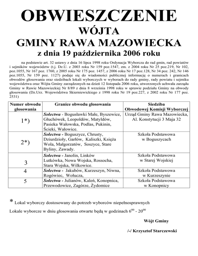 OBWIESZCZENIE WÓJTA GMINY RAWA MAZOWIECKA z dnia 19 października 2006 roku na podstawie art. 32 ustawy z dnia 16 lipca 1998 roku Ordynacja Wyborcza do rad gmin, rad powiatów i sejmików województw (t.j. Dz.U. z 2003 roku Nr 159 poz.1547, zm. z 2004 roku Nr 25 poz.219, Nr 102, poz.1055, Nr 167 poz. 1760, z 2005 roku Nr 175 poz. 1457, z 2006 roku Nr 17 poz.128, Nr 34 poz. 242, Nr 146 poz.1055, Nr 159 poz. 1127) podaje się do wiadomości publicznej informację o numerach i granicach obwodów głosowania oraz siedzibach lokali wyborczych w wyborach do rady gminy, rady powiatu i sejmiku województwa oraz Wójta Gminy zarządzonych na dzień 12 listopada 2006 roku, utworzonych uchwała zarządu Gminy w Rawie Mazowieckiej Nr 8/89 z dnia 8 września 1998 roku w sprawie podziału Gminy na obwody głosowania (Dz.Urz. Województwa Skierniewickiego z 1998 roku Nr 19 poz.227, z 2002 roku Nr 177 poz. 2531) Numer obwodu głosowania 1*) 2*) 3 4 5 Granice obwodu głosowania Siedziba Obwodowej Komisji Wyborczej Sołectwa - Bogusławki Małe, Byszewice, Urząd Gminy Rawa Mazowiecka, Al. Konstytucji 3 Maja 32 Głuchówek, Leopoldów, Matyldów, Pasieka Wałowska, Podlas, Pukinin, Ścieki, Wałowice. Szkoła Podstawowa Sołectwa - Boguszyce, Chrusty, w Boguszycach Dziurdzioły, Garłów, Kaliszki, Księża Wola, Małgorzatów, Soszyce, Stare Byliny, Zawady. Szkoła Podstawowa Sołectwa - Janolin, Linków w Starej Wojskiej Lutkówka, Nowa Wojska, Rossocha, Stara Wojska, Wilkowice. Szkoła Podstawowa Sołectwa - Jakubów, Kurzeszyn, Niwna, w Kurzeszynie Rogówiec, Wołucza, Szkoła Podstawowa Sołectwa - Julianów, Kaleń, Konopnica, w Konopnicy Przewodowice, Zagórze, Żydomice * Lokal wyborczy dostosowany do potrzeb wyborców niepełnosprawnych Lokale wyborcze w dniu głosowania otwarte będą w godzinach 600 - 2000 Wójt Gminy /-/ Krzysztof Starczewski