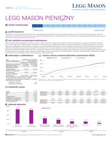 03/16 dane na dzień 29.02.2016 Legg Mason Parasol Fundusz Inwestcyjny Otwarty LEGG MASON PIENIĘŻNY ryzyko inwestycyjne 1 2 3 4 5 6 7 niższe ryzyko profil inwestora wyższe ryzyko Subfundusz jest przeznaczony dla inwestora, który akceptuje jedynie minimalne ryzyko, chce zachować realną wartość inwestycji, zdecydowanie nie chce mieć ekspozycji na rynek akcji oraz akceptuje zysk na poziomie lokat bankowych przy większej płynności. Ocena wyników zarządzania powinna być dokonywana przez inwestora w okresie nie krótszym niż 6 miesięcy. cel i polityka inwestycyjna subfunduszu Celem inwestycyjnym subfunduszu jest ochrona realnej wartości aktywów i osiąganie przychodów z lokat netto subfunduszu. Legg Mason Pieniężny lokuje do 100% wartości aktywów w dłużne papiery wartościowe i instrumenty rynku pieniężnego emitowane przez Skarb Państwa oraz innych emitentów, w tym przedsiębiorstwa. Subfundusz inwestuje również w obligacje o terminie zapadalności powyżej 1 roku oraz obligacje i instrumenty rynku pieniężnego emitowane przez spółki prawa handlowego i samorządy terytorialne. Przy dokonywaniu inwestycji subfundusz kieruje się uzyskaniem możliwie jak najwyższej stopy zwrotu z aktywów, przy istotnej redukcji ryzyka zmienności cen papierów wartościowych, ograniczeniu ryzyka stopy procentowej, ryzyka niewypłacalności emitenta, ryzyka kursowego walut, ryzyka utraty wartości papieru wartościowego oraz przy utrzymywaniu wysokiej płynności. Modelowa alokacja aktywów subfunduszu zakłada inwestowanie do 100% udziału w aktywach instrumentów rynku pieniężnego. informacje o subfunduszu wykres zmiany wartości jednostki uczestnictwa (PLN) jednostka A Typ Aktywa subfunduszu subfundusz gotówkowy 446,4 mln PLN Jednostka A Jednostka E 4 sty 1999 24 sie 2010 Data pierwszej wyceny 10 PLN 100 PLN Minimalna wpłata Maksymalna opłata 0,00% 0,50% manipulacyjna Opłata za zarządzanie 0,50% 0,80% (w skali roku) Wartość jednostki 263,05 PLN 268,11 PLN uczestnictwa Udział papierów wartościowych o ratingu 91,44% na poziomie inwestycyjnym w portfelu Efektywny czas trwania: 0,7 portfela (w latach) 0,125 benchmark (w latach) benchmark jednostka E 300 250 200 150 100 sty 99 cze 01 lis 03 kwi 06 paź 08 mar 11 sie 13 lut 16 Benchmark: 100% – indeks “JP Morgan Emerging Local Markets Index Plus (ELMI+) Poland” (prezentujący ważoną stopę zwrotu inwestycji w depozyty jedno-, dwu- i trzymiesięczne na rynku międzybankowym) wskaźniki ryzyka Alpha Beta R2 Tracking Error Odchylenie standardowe Współczynnik Sharpe'a Information Ratio 1 rok 0,3% -1,88 5,8% 0,1% 0,1% -0,27 -0,05 3 lata -0,1% 1,34 26,2% 0,1% 0,1% -0,06 0,07 alokacja aktywów jednostka A jednostka E benchmark 1m 0,15% 0,17% 0,13% 3m 0,58% 0,65% 0,33% 6m 0,98% 1,14% 0,68% 12m 1,36% 1,66% 1,42% 36m 6,82% 7,80% 6,50% 60m 17,38% 19,22% 15,53% 120m 40,28% 42,41% YTD 0,39% 0,44% 0,23% jednostka A jednostka E benchmark 2009 3,87% 3,59% 2010 3,49% 3,01% 2011 3,76% 4,18% 3,55% 2012 5,75% 6,08% 4,52% 2013 2,61% 2,92% 2,97% 2014 2,57% 2,88% 2,37% 2015 1,52% 1,83% 1,47% max 163,05% 20,89% 120,12% 40% 33,45% subfundusz 31,94% 30% 20% 12,71% 9,27% 10% 5,64% 5,07% 1,92% 0% skarbowe o stałym kuponie skarbowe o zmiennym kuponie obligacje nieskarbowe komercyjne (finanse) udział papierów skarbowych i gwarantowanych przez Skarb Państwa 71,03% obligacje nieskarbowe komercyjne (przemysł) obligacje nieskarbowe gwarantowane przez Skarb Państwa listy zastawne gotówka udział papierów nieskarbowych gotówka i ekwiwalenty 27,05% 1,92% Materiał przygotowany przez Analizy Online S.A. (www.analizyonline.pl) www.leggmason.pl 03/16 dane na dzień 29.02.2016 Legg Mason Parasol Fundusz Inwestcyjny Otwarty LEGG MASON PIENIĘŻNY słownik ważne informacje - przeczytaj uważnie Jednostki uczestnictwa kategorii A - oferowane są wszystkim Uczestnikom funduszu. Opłata manipulacyjna pobierana jest przy zbyciu jednostek. Jednostki uczestnictwa kategorii E - są oferowane wyłącznie Uczestnikom w ramach planów i programów inwestycyjnych i emerytalnych, przy czym w odniesieniu do tych jednostek fundusz nie pobiera opłaty manipulacyjnej z tytułu ich zbycia i odkupienia. Alpha - mierzy związek między aktualnymi wynikami funduszu a wynikami, które zostałyby osiągnięte z racji samych ruchów rynkowych. Innymi słowy Alpha mierzy wartość dodaną uzyskiwaną z zarządzania portfelem przez specjalistów. Beta - mierzy zależność pomiędzy zmiennością funduszu a benchmarkiem. Fundusz z betą 1.00 jest uznawany za fundusz o podobnej zmienności do zmienności benchmarku. Fundusz z betą wyższą jest uznawany za bardziej zmienny niż benchmark, podczas gdy fundusz z betą niższą może wzrastać i spadać wolniej niż benchmark. R2 - mierzy w jakim zakresie „charakter” wyników funduszu jest kierowany przez benchmark. Np. fundusz z R2 na poziomie 0,8 oznacza, że 80% historycznego zachowania funduszu jest przypisywane benchmarkowi. Tracking Error - oczekiwane bądź aktualne maksymalne odchylenie standardowe zysków funduszu od benchmarku w okresie 12 i 36 miesięcy. Odchylenie standardowe - odchylenie standardowe zysków funduszu pokazuje, jak bardzo całkowite zyski funduszu zmieniały się w przeszłości. Odchylenie standardowe jest szeroko używane jako podstawowa miara ryzyka. Pokazuje, jak roczne zwroty funduszu mogą się różnić od średniego rocznego zwrotu w dłuższym okresie. Jest szczególnie przydatne przy porównywaniu dwóch funduszy, aby pokazać, który jest bardziej zmienny. Im większe odchylenie standardowe, tym większa zmienność funduszu. Współczynnik Sharpe’a - mierzy zwrot funduszu w odniesieniu do ryzyka. Pokazuje współczynnik dodatkowego zwrotu funduszu (tj. zwrot ponad osiągany z aktywów wolnych od ryzyka, np. papierów skarbowych) do ryzyka funduszu (tj. odchylenia standardowego funduszu). Im wyższy ten współczynnik, tym lepsze wyniki funduszu w stosunku do ponoszonego p