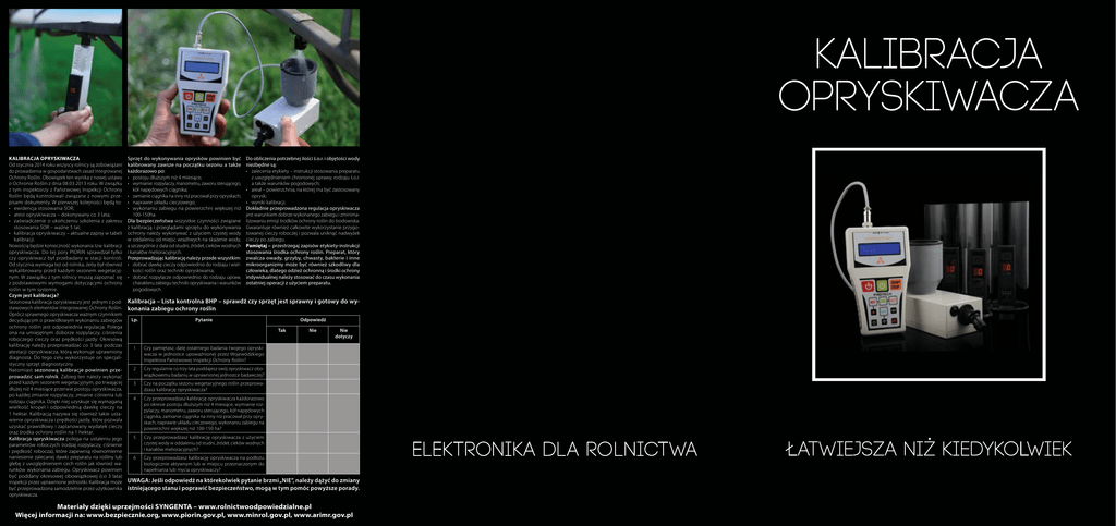 KALIBRACJA OPRYSKIWACZA Kalibracja opryskiwacza Od stycznia 2014 roku wszyscy rolnicy są zobowiązani do prowadzenia w gospodarstwach zasad Integrowanej Ochrony Roślin. Obowiązek ten wynika z nowej ustawy o Ochronie Roślin z dnia 08.03.2013 roku. W związku z tym inspektorzy z Państwowej Inspekcji Ochrony Roślin będą kontrolowali związane z nowymi przepisami dokumenty. W pierwszej kolejności będą to: • ewidencja stosowania ŚOR; • atest opryskiwacza – dokonywany co 3 lata; • zaświadczenie o ukończeniu szkolenia z zakresu stosowania ŚOR – ważne 5 lat; • kalibracja opryskiwaczy – aktualne zapisy w tabeli kalibracji. Nowością będzie konieczność wykonania tzw. kalibracji opryskiwacza. Do tej pory PIORiN sprawdzał tylko czy opryskiwacz był przebadany w stacji kontroli. Od stycznia wymaga też od rolnika, żeby był również wykalibrowany przed każdym sezonem wegetacyjnym. W zawiązku z tym rolnicy muszą zapoznać się z podstawowymi wymogami dotyczącymi ochrony roślin w tym systemie. Czym jest kalibracja? Sezonowa kalibracja opryskiwaczy jest jednym z podstawowych elementów Integrowanej Ochrony Roślin. Oprócz sprawnego opryskiwacza ważnym czynnikiem decydującym o prawidłowym wykonaniu zabiegów ochrony roślin jest odpowiednia regulacja. Polega ona na umiejętnym doborze rozpylaczy, ciśnienia roboczego cieczy oraz prędkości jazdy. Okresową kalibrację należy przeprowadzać co 3 lata podczas atestacji opryskiwacza, którą wykonuje uprawniony diagnosta. Do tego celu wykorzystuje on specjalistyczny sprzęt diagnostyczny. Natomiast sezonową kalibracje powinien przeprowadzić sam rolnik. Zabieg ten należy wykonać przed każdym sezonem wegetacyjnym, po trwającej dłużej niż 4 miesiące przerwie postoju opryskiwacza, po każdej zmianie rozpylaczy, zmianie ciśnienia lub rodzaju ciągnika. Dzięki niej uzyskuje się wymaganą wielkość kropel i odpowiednią dawkę cieczy na 1 hektar. Kalibracją nazywa się również takie ustawienie opryskiwacza i prędkości jazdy, które pozwala uzyskać prawidłowy i zaplanowany wydatek cieczy oraz środka ochrony roślin na 1 hektar. Kalibracja opryskiwacza polega na ustaleniu jego parametrów roboczych (rodzaj rozpylaczy, ciśnienie i prędkość robocza), które zapewnią równomierne naniesienie zalecanej dawki preparatu na rośliny lub glebę z uwzględnieniem cech roślin jak również warunków wykonania zabiegu. Opryskiwacz powinien być poddany okresowej obowiązkowej (co 3 lata) inspekcji przez uprawnione jednostki. Kalibracja może być przeprowadzona samodzielnie przez użytkownika opryskiwacza. Sprzęt do wykonywania oprysków powinien być kalibrowany zawsze na początku sezonu a także każdorazowo po: • postoju dłuższym niż 4 miesiące; • wymianie: rozpylaczy, manometru, zaworu sterującego, kół napędowych ciągnika; • zamianie ciągnika na inny niż pracował przy opryskach; • naprawie układu cieczowego; • wykonaniu zabiegu na powierzchni większej niż 100-150ha. Dla bezpieczeństwa wszystkie czynności związane z kalibracją i przeglądami sprzętu do wykonywania ochrony należy wykonywać z użyciem czystej wody w oddaleniu od miejsc wrażliwych na skażenie wody, a szczególnie z dala od studni, źródeł, cieków wodnych i kanałów melioracyjnych. Przeprowadzając kalibrację należy przede wszystkim: • dobrać dawkę cieczy odpowiednio do rodzaju i wielkości roślin oraz techniki opryskiwania; • dobrać rozpylacze odpowiednio do rodzaju upraw, charakteru zabiegu techniki opryskiwania i warunków pogodowych. Do obliczenia potrzebnej ilości ś.o.r. i objętości wody niezbędne są: • zalecenia etykiety – instrukcji stosowania preparatu z uwzględnieniem chronionej uprawy, rodzaju ś.o.r. a także warunków pogodowych; • areał – powierzchnia, na której ma być zastosowany oprysk; • wyniki kalibracji. Dokładnie przeprowadzona regulacja opryskiwacza jest warunkiem dobrze wykonanego zabiegu i zminimalizowaniu emisji środków ochrony roślin do środowiska. Gwarantuje również całkowite wykorzystanie przygotowanej cieczy roboczej i pozwala uniknąć nadwyżek cieczy po zabiegu. Pamiętaj – przestrzegaj zapisów etykiety-instrukcji stosowania środka ochrony roślin. Preparat, który zwalcza owady, grzyby, chwasty, bakterie i inne mikroorganizmy może być również szkodliwy dla człowieka, dlatego odzież ochronną i środki ochrony indywidualnej należy stosować do czasu wykonania ostatniej operacji z użyciem preparatu. Kalibracja – Lista kontrolna BHP – sprawdź czy sprzęt jest sprawny i gotowy do wykonania zabiegu ochrony roślin Lp. Pytanie Odpowiedź Tak 1 Czy pamiętasz, datę ostatniego badania twojego opryskiwacza w jednostce upoważnionej przez Wojewódzkiego Inspektora Państwowej Inspekcji Ochrony Roślin? 2 Czy regularnie co trzy lata poddajesz swój opryskiwacz obowiązkowemu badaniu w uprawnionej jednostce badawczej? 3 Czy na początku sezonu wegetacyjnego roślin przeprowadzasz kalibrację opryskiwacza? 4 Czy przeprowadzasz kalibrację opryskiwacza każdorazowo po okresie postoju dłuższym niż 4 miesiące, wymianie rozpylaczy, manometru, zaworu sterującego, kół napędowych ciągnika, zamianie ciągnika na inny niż pracował przy opryskach, naprawie układu cieczowego, wykonaniu zabiegu na powierzchni większej niż 100-150 ha? 5 Czy przeprowadzasz kalibrację opryskiwacza z użyciem czystej wody w oddaleniu od studni, źródeł, cieków wodnych i kanałów melioracyjnych? 6 Czy przeprowadzasz kalibrację opryskiwacza na podłożu biologicznie aktywnym lub w miejscu przeznaczonym do napełniania lub mycia opryskiwaczy? Nie Nie dotyczy UWAGA: Jeśli odpowiedź na którekolwiek pytanie brzmi „NIE”, należy dążyć do zmiany istniejącego stanu i poprawić bezpieczeństwo, mogą w tym pomóc powyższe porady. Materiały dzięki uprzejmości SYNGENTA – www.rolnictwoodpowiedzialne.pl Więcej informacji na: www.bezp