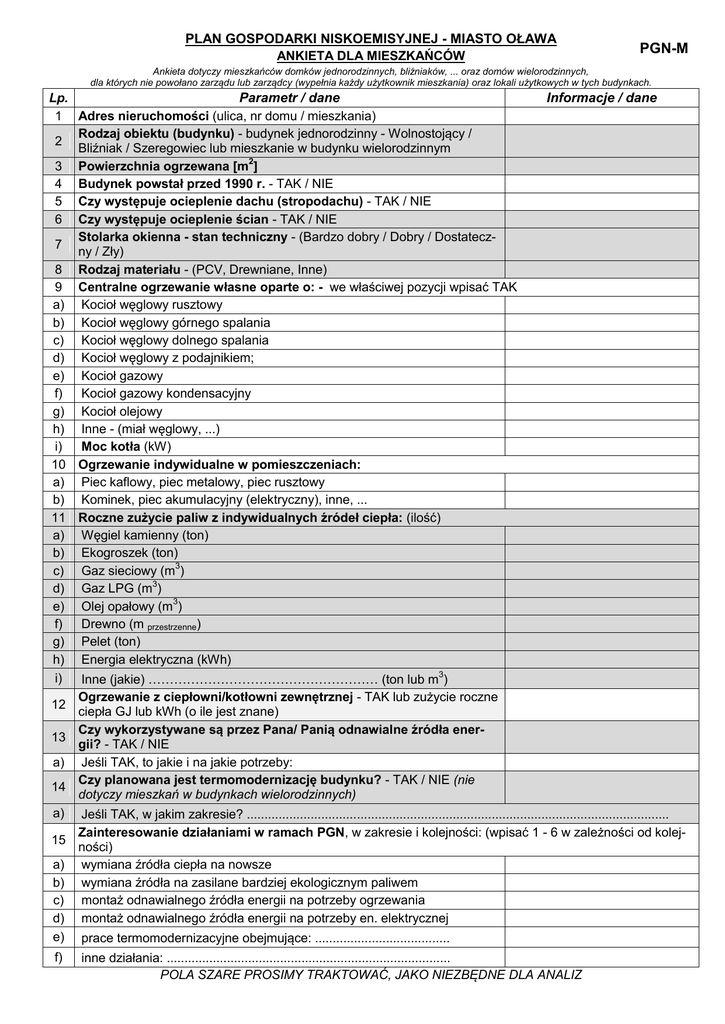 PLAN GOSPODARKI NISKOEMISYJNEJ - MIASTO OŁAWA ANKIETA DLA MIESZKAŃCÓW PGN-M Ankieta dotyczy mieszkańców domków jednorodzinnych, bliźniaków, ... oraz domów wielorodzinnych, dla których nie powołano zarządu lub zarządcy (wypełnia każdy użytkownik mieszkania) oraz lokali użytkowych w tych budynkach. Lp. Parametr / dane Informacje / dane 1 Adres nieruchomości (ulica, nr domu / mieszkania) Rodzaj obiektu (budynku) - budynek jednorodzinny - Wolnostojący / 2 Bliźniak / Szeregowiec lub mieszkanie w budynku wielorodzinnym 3 Powierzchnia ogrzewana [m2] 4 Budynek powstał przed 1990 r. - TAK / NIE 5 Czy występuje ocieplenie dachu (stropodachu) - TAK / NIE 6 Czy występuje ocieplenie ścian - TAK / NIE Stolarka okienna - stan techniczny - (Bardzo dobry / Dobry / Dostatecz7 ny / Zły) 8 Rodzaj materiału - (PCV, Drewniane, Inne) 9 Centralne ogrzewanie własne oparte o: - we właściwej pozycji wpisać TAK a) Kocioł węglowy rusztowy b) Kocioł węglowy górnego spalania c) Kocioł węglowy dolnego spalania d) Kocioł węglowy z podajnikiem; e) Kocioł gazowy f) Kocioł gazowy kondensacyjny g) Kocioł olejowy h) Inne - (miał węglowy, ...) i) Moc kotła (kW) 10 Ogrzewanie indywidualne w pomieszczeniach: a) Piec kaflowy, piec metalowy, piec rusztowy b) Kominek, piec akumulacyjny (elektryczny), inne, ... 11 Roczne zużycie paliw z indywidualnych źródeł ciepła: (ilość) a) Węgiel kamienny (ton) b) Ekogroszek (ton) c) Gaz sieciowy (m3) d) Gaz LPG (m3) e) Olej opałowy (m3) f) Drewno (m przestrzenne) g) Pelet (ton) h) Energia elektryczna (kWh) i) Inne (jakie) ……………………………………………… (ton lub m3) Ogrzewanie z ciepłowni/kotłowni zewnętrznej - TAK lub zużycie roczne 12 ciepła GJ lub kWh (o ile jest znane) Czy wykorzystywane są przez Pana/ Panią odnawialne źródła ener13 gii? - TAK / NIE a) Jeśli TAK, to jakie i na jakie potrzeby: Czy planowana jest termomodernizację budynku? - TAK / NIE (nie 14 dotyczy mieszkań w budynkach wielorodzinnych) a) Jeśli TAK, w jakim zakresie? ....................................................................................................................... Zainteresowanie działaniami w ramach PGN, w zakresie i kolejności: (wpisać 1 - 6 w zależności od kolej15 ności) a) wymiana źródła ciepła na nowsze b) wymiana źródła na zasilane bardziej ekologicznym paliwem c) montaż odnawialnego źródła energii na potrzeby ogrzewania d) montaż odnawialnego źródła energii na potrzeby en. elektrycznej e) prace termomodernizacyjne obejmujące: ...................................... f) inne działania: ................................................................................ POLA SZARE PROSIMY TRAKTOWAĆ, JAKO NIEZBĘDNE DLA ANALIZ