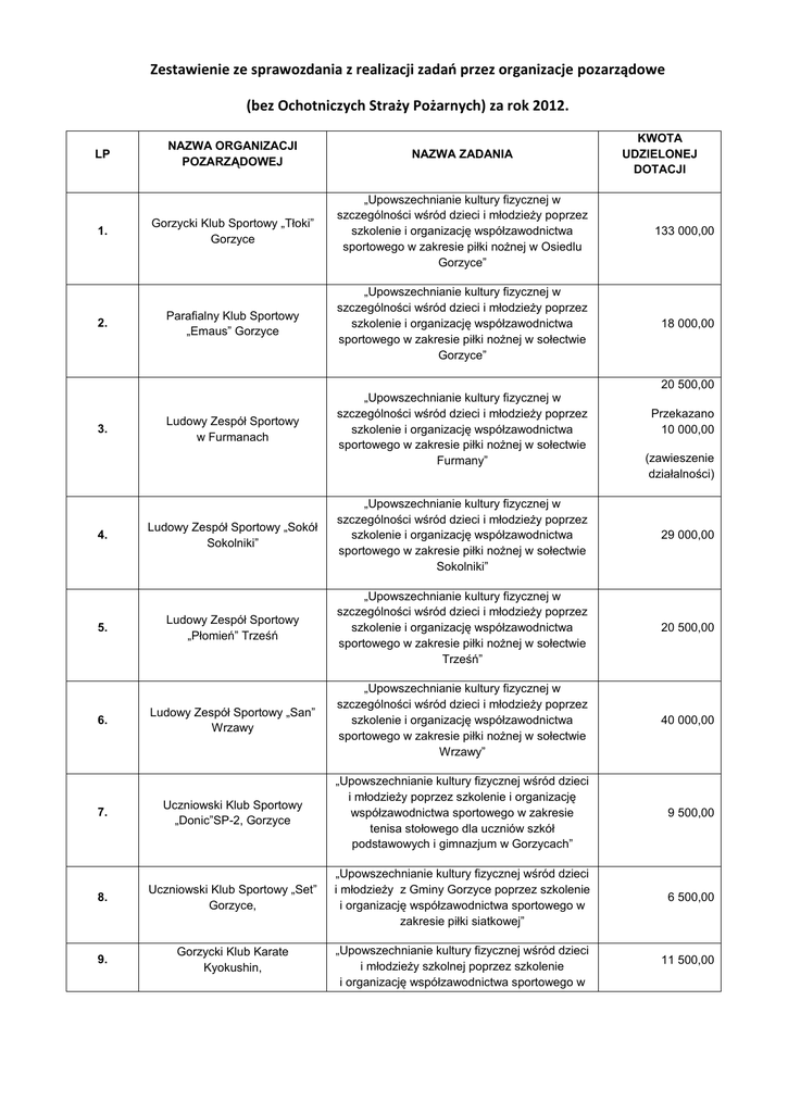 Zestawienie ze sprawozdania z realizacji zadań przez organizacje pozarządowe (bez Ochotniczych Straży Pożarnych) za rok 2012. LP 1. 2. KWOTA UDZIELONEJ DOTACJI NAZWA ORGANIZACJI POZARZĄDOWEJ NAZWA ZADANIA Gorzycki Klub Sportowy „Tłoki” Gorzyce „Upowszechnianie kultury fizycznej w szczególności wśród dzieci i młodzieży poprzez szkolenie i organizację współzawodnictwa sportowego w zakresie piłki nożnej w Osiedlu Gorzyce” 133 000,00 Parafialny Klub Sportowy „Emaus” Gorzyce „Upowszechnianie kultury fizycznej w szczególności wśród dzieci i młodzieży poprzez szkolenie i organizację współzawodnictwa sportowego w zakresie piłki nożnej w sołectwie Gorzyce” 18 000,00 Ludowy Zespół Sportowy w Furmanach „Upowszechnianie kultury fizycznej w szczególności wśród dzieci i młodzieży poprzez szkolenie i organizację współzawodnictwa sportowego w zakresie piłki nożnej w sołectwie Furmany” 20 500,00 3. Przekazano 10 000,00 (zawieszenie działalności) Ludowy Zespół Sportowy „Sokół Sokolniki” „Upowszechnianie kultury fizycznej w szczególności wśród dzieci i młodzieży poprzez szkolenie i organizację współzawodnictwa sportowego w zakresie piłki nożnej w sołectwie Sokolniki” 29 000,00 Ludowy Zespół Sportowy „Płomień” Trześń „Upowszechnianie kultury fizycznej w szczególności wśród dzieci i młodzieży poprzez szkolenie i organizację współzawodnictwa sportowego w zakresie piłki nożnej w sołectwie Trześń” 20 500,00 Ludowy Zespół Sportowy „San” Wrzawy „Upowszechnianie kultury fizycznej w szczególności wśród dzieci i młodzieży poprzez szkolenie i organizację współzawodnictwa sportowego w zakresie piłki nożnej w sołectwie Wrzawy” 40 000,00 7. Uczniowski Klub Sportowy „Donic”SP-2, Gorzyce „Upowszechnianie kultury fizycznej wśród dzieci i młodzieży poprzez szkolenie i organizację współzawodnictwa sportowego w zakresie tenisa stołowego dla uczniów szkół podstawowych i gimnazjum w Gorzycach” 9 500,00 8. Uczniowski Klub Sportowy „Set” Gorzyce, „Upowszechnianie kultury fizycznej wśród dzieci i młodzieży z Gminy Gorzyce poprzez szkolenie i organizację współzawodnictwa sportowego w zakresie piłki siatkowej” 6 500,00 9. Gorzycki Klub Karate Kyokushin, „Upowszechnianie kultury fizycznej wśród dzieci i młodzieży szkolnej poprzez szkolenie i organizację współzawodnictwa sportowego w 11 500,00 4. 5. 6. LP NAZWA ORGANIZACJI POZARZĄDOWEJ NAZWA ZADANIA KWOTA UDZIELONEJ DOTACJI zakresie sportów obronnych” 10. Uczniowski Klub Sportowy „Zeus” Trześń „Upowszechnianie kultury fizycznej wśród dzieci i młodzieży poprzez szkolenie i organizację współzawodnictwa sportowego w zakresie tenisa stołowego dla dzieci ze Szkoły Podstawowej w Trześni” 6 000,00