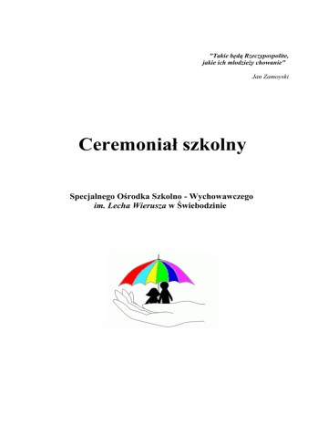"Takie będą Rzeczypospolite, jakie ich młodzieży chowanie" Jan Zamoyski Ceremoniał szkolny Specjalnego Ośrodka Szkolno - Wychowawczego im. Lecha Wierusza w Świebodzinie Spis treści strona I. Wstęp…………………………………………………………………… 3 II. Patron ośrodka…………………………………………………………. 4 III. Logo ośrodka………………………………………………………...… 4 IV. Sztandar ośrodka………………………………………………………. 5 V. Poczet sztandarowy……………………………………………………. 6 VI. Postawy sztandaru i pocztu sztandarowego…………………………… 7 VII. Udział sztandaru w uroczystościach na terenie ośrodka……………… 8 VIII. Przebieg uroczystości z udziałem sztandaru………………………….. 8 1. Ceremoniał uroczystości szkolnych z udziałem sztandaru................................. 8 a) wprowadzenie sztandaru........................................................................ 8 b) wyprowadzenie sztandaru...................................................................... 9 2. Ceremoniał ślubowania klas pierwszych........................................................9 3. Ceremoniał przekazania sztandaru............................................................... 10 IX. Udział sztandaru w uroczystościach poza terenem ośrodka………… 11 X. Dekoracja budynku szkoły flagą państwową………………………... 12 2 I. Wstęp Wstęp do Ustawy z dnia 7 września 1991 r. o systemie oświaty: „Kształcenie i wychowanie służy rozwijaniu u młodzieży poczucia odpowiedzialności, miłości ojczyzny oraz poszanowania dla polskiego dziedzictwa kulturowego, przy jednoczesnym otwarciu się na wartości kultur Europy i świata. Szkoła winna zapewnić każdemu uczniowi warunki niezbędne do jego rozwoju, przygotować go do wypełniania obowiązków rodzinnych i obywatelskich w oparciu o zasady solidarności, demokracji, tolerancji, sprawiedliwości i wolności.” Artykuł 4 ustawy: „Nauczyciel w swoich działaniach dydaktycznych, wychowawczych i opiekuńczych ma obowiązek kierowania się dobrem uczniów, troską o ich zdrowie, postawę moralną i obywatelską z poszanowaniem godności osobistej ucznia”. Celowym wydaje się zdefiniowanie i określenie we współczesnej szkole najważniejszych pojęć oraz zachowań uczniów tworzących ceremoniał szkolny. Najważniejszym zadaniem szkoły jest nauczanie dzieci i młodzieży oraz wychowywanie jej na świadomych obywateli. Podstawą funkcjonowania w społeczeństwie, obok wiedzy i umiejętności, przekazywanych na zajęciach lekcyjnych są: kultura języka, właściwe zachowanie i szacunek dla tradycji. Dlatego należy uczyć młodzież zasad postępowania w różnych sytuacjach, takich jak organizacja obchodów świąt państwowych i uroczystości szkolnych. Jednym z dokumentów stanowiącym zbiór obowiązujących w szkole norm zachowania się jest Ceremoniał szkolny. Dokument zawiera wykaz stałych uroczystości szkolnych i elementy tradycji szkoły. Określa symbole, opisuje uroczystości z udziałem sztandaru szkolnego i formy jego celebracji. Dzięki temu dokumentowi szkoła ma możliwość kształtowania i wpajania podstawowych wzorców postaw i zachowań. Stwarza również uczniom okazję do przeżywania doniosłych chwil w życiu. 3 II. Patron ośrodka Ośrodek posiada patrona , którym jest Lech Wierusz. Uroczystość nadania ośrodkowi imienia odbyła się 4 grudnia 2009 r. Lech Wierusz był człowiekiem prawym, uczciwym, zaangażowanym w świebodzińskie życie kulturalne i spieszącym z pomocą potrzebującym. Jego droga i postawa życiowa jest ze wszech miar godna szacunku i stanowi wzór do naśladowania dla społeczności szkolnej. Dzień patrona ośrodka obchodzony jest w szkole w dniu jego urodzin tj. 18 kwietnia. W tym dniu ośrodek obchodzi swoje święto. III. Godło ośrodka (logo) Godło szkoły (logo) jest znakiem rozpoznawczym szkoły. Logo naszego ośrodka przedstawia otwartą dłoń, na której znajduje się postać dzieci (dziewczynki i chłopca) stojących pod otwartym, kolorowym parasolem. Logo ośrodka umieszczane jest na oficjalnych pismach urzędowych, dyplomach, zaproszeniach itp. 4 IV. Sztandar ośrodka Sztandar szkoły dla społeczności szkolnej jest symbolem Polski, narodu, małej Ojczyzny, jaką jest szkoła i jej najbliższe otoczenie. Od 4 grudnia 2009 r. ośrodek posiada sztandar. Płat sztandaru stanowi tkanina o wymiarach: 100 x 100 cm obszyta złotymi frędzlami. Awers sztandaru to tkanina w kolorze niebieskim. W jej centralnym punkcie znajduje się portret Lecha Wierusza. Wizerunek patrona otacza wyhaftowana złotymi nićmi pełna nazwa naszej szkoły , to jest : Specjalny Ośrodek Szkolno – Wychowawczy im. Lecha Wierusza w Świebodzinie. W lewym, górnym rogu widnieje logo ośrodka, a w prawym herb miasta Świebodzina. Rewers - druga strona sztandaru to tkanina w kolorze biało-czerwonym z wizerunkiem Orła Białego, haftowanego srebrną nicią. W złotym kolorze są korona, dziób i szpony orła. Rozpostarte orle skrzydła symbolizują dążenie do pokonywania przeszkód i trudności. Czerwień i biel lewej strony sztandaru to symbol ofiarności i gotowości służenia Ojczyźnie. W uroczystościach pogrzebowych i w czasie ogłoszonej żałoby narodowej sztandar ozdabia się czarnym kirem. Sztandar ośrodka przechowywany jest w specjalnej gablocie znajdującej się na parterze, w holu szkoły zawodowej. 5 V. Poczet sztandarowy Sztandarem opiekuje się poczet sztandarowy, którego skład osobowy tworzą: chorąży (sztandarowy) - uczeń asysta (przyboczni) - dwie uczennice Niezwykły honor i zaszczyt spotyka uczniów, którzy stanowią poczet sztandarowy, dlatego w jego składzie winni znaleźć się uczniowie o nienagannej postawie i godni takiej funkcji. Wyboru pocztu sztandarowego oraz 