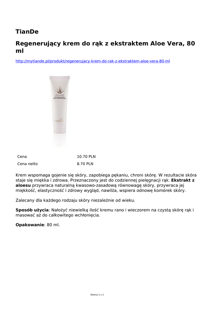 TianDe Regenerujący krem do rąk z ekstraktem Aloe Vera, 80 ml http://mytiande.pl/produkt/regenerujacy-krem-do-rak-z-ekstraktem-aloe-vera-80-ml Cena 10.70 PLN Cena netto 8.70 PLN Krem wspomaga gojenie się skóry, zapobiega pękaniu, chroni skórę. W rezultacie skóra staje się miękka i zdrowa. Przeznaczony jest do codziennej pielęgnacji rąk. Ekstrakt z aloesu przywraca naturalną kwasowo-zasadową równowagę skóry, przywraca jej miękkość, elastyczność i zdrowy wygląd, nawilża, wspiera odnowę komórek skóry. Zalecany dla każdego rodzaju skóry niezależnie od wieku. Sposób użycia: Nałożyć niewielką ilość kremu rano i wieczorem na czystą skórę rąk i masować aż do całkowitego wchłonięcia. Opakowanie: 80 ml. Strona 1 z 1 Powered by TCPDF (www.tcpdf.org)