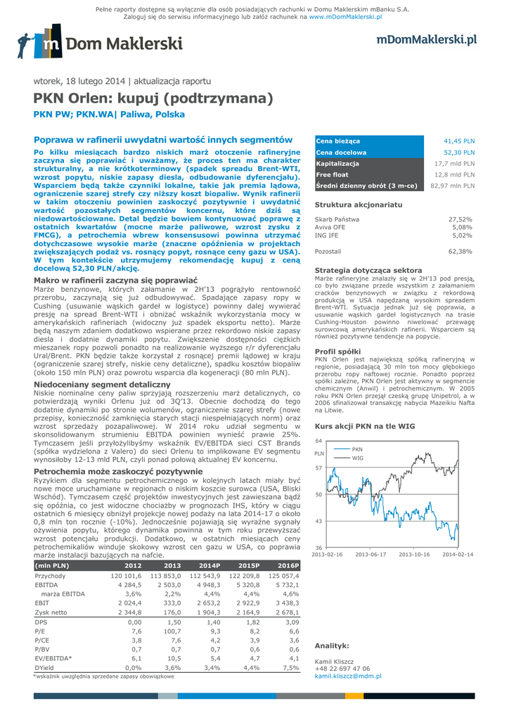 Pełne raporty dostępne są wyłącznie dla osób posiadających rachunki w Domu Maklerskim mBanku S.A. Zaloguj się do serwisu informacyjnego lub załóż rachunek na www.mDomMaklerski.pl wtorek, 18 lutego 2014 | aktualizacja raportu PKN Orlen: kupuj (podtrzymana) PKN PW; PKN.WA| Paliwa, Polska Poprawa w rafinerii uwydatni wartość innych segmentów Cena bieżąca Po kilku miesiącach bardzo niskich marż otoczenie rafineryjne zaczyna się poprawiać i uważamy, że proces ten ma charakter strukturalny, a nie krótkoterminowy (spadek spreadu Brent-WTI, wzrost popytu, niskie zapasy diesla, odbudowanie dyferencjału). Wsparciem będą także czynniki lokalne, takie jak premia lądowa, ograniczenie szarej strefy czy niższy koszt biopaliw. Wynik rafinerii w takim otoczeniu powinien zaskoczyć pozytywnie i uwydatnić wartość pozostałych segmentów koncernu, które dziś są niedowartościowane. Detal będzie bowiem kontynuować poprawę z ostatnich kwartałów (mocne marże paliwowe, wzrost zysku z FMCG), a petrochemia wbrew konsensusowi powinna utrzymać dotychczasowe wysokie marże (znaczne opóźnienia w projektach zwiększających podaż vs. rosnący popyt, rosnące ceny gazu w USA). W tym kontekście utrzymujemy rekomendację kupuj z ceną docelową 52,30 PLN/akcję. Cena docelowa Makro w rafinerii zaczyna się poprawiać Marże benzynowe, których załamanie w 2H’13 pogrążyło rentowność przerobu, zaczynają się już odbudowywać. Spadające zapasy ropy w Cushing (usuwanie wąskich gardeł w logistyce) powinny dalej wywierać presję na spread Brent-WTI i obniżać wskaźnik wykorzystania mocy w amerykańskich rafineriach (widoczny już spadek eksportu netto). Marże będą naszym zdaniem dodatkowo wspierane przez rekordowo niskie zapasy diesla i dodatnie dynamiki popytu. Zwiększenie dostępności ciężkich mieszanek ropy pozwoli ponadto na realizowanie wyższego r/r dyferencjału Ural/Brent. PKN będzie także korzystał z rosnącej premii lądowej w kraju (ograniczenie szarej strefy, niskie ceny detaliczne), spadku kosztów biopaliw (około 150 mln PLN) oraz powrotu wsparcia dla kogeneracji (80 mln PLN). Niedoceniany segment detaliczny Niskie nominalne ceny paliw sprzyjają rozszerzeniu marż detalicznych, co potwierdzają wyniki Orlenu już od 3Q’13. Obecnie dochodzą do tego dodatnie dynamiki po stronie wolumenów, ograniczenie szarej strefy (nowe przepisy, konieczność zamknięcia starych stacji niespełniających norm) oraz wzrost sprzedaży pozapaliwowej. W 2014 roku udział segmentu w skonsolidowanym strumieniu EBITDA powinien wynieść prawie 25%. Tymczasem jeśli przyłożylibyśmy wskaźnik EV/EBITDA sieci CST Brands (spółka wydzielona z Valero) do sieci Orlenu to implikowane EV segmentu wynosiłoby 12-13 mld PLN, czyli ponad połową aktualnej EV koncernu. Ryzykiem dla segmentu petrochemicznego w kolejnych latach miały być nowe moce uruchamiane w regionach o niskim koszcie surowca (USA, Bliski Wschód). Tymczasem część projektów inwestycyjnych jest zawieszana bądź się opóźnia, co jest widoczne chociażby w prognozach IHS, który w ciągu ostatnich 6 miesięcy obniżył projekcje nowej podaży na lata 2014-17 o około 0,8 mln ton rocznie (-10%). Jednocześnie pojawiają się wyraźne sygnały ożywienia popytu, którego dynamika powinna w tym roku przewyższać wzrost potencjału produkcji. Dodatkowo, w ostatnich miesiącach ceny petrochemikaliów winduje skokowy wzrost cen gazu w USA, co poprawia marże instalacji bazujących na nafcie. 2012 2013 2014P 2015P 2016P 120 101,6 113 853,0 112 543,9 122 209,8 125 057,4 4 284,5 2 503,0 4 948,3 5 320,8 5 732,1 3,6% 2,2% 4,4% 4,4% 4,6% EBIT 2 024,4 333,0 2 653,2 2 922,9 3 438,3 Zysk netto 2 344,8 176,0 1 904,3 2 164,9 2 678,1 0,00 1,50 1,40 1,82 3,09 P/E 7,6 100,7 9,3 8,2 6,6 P/CE 3,8 7,6 4,2 3,9 3,6 P/BV 0,7 0,7 0,7 0,6 0,6 Przychody EBITDA marża EBITDA DPS EV/EBITDA* DYield 6,1 10,5 5,4 4,7 4,1 0,0% 3,6% 3,4% 4,4% 7,5% *wskaźnik uwzględnia sprzedane zapasy obowiązkowe 52,30 PLN Kapitalizacja 17,7 mld PLN Free float 12,8 mld PLN Średni dzienny obrót (3 m-ce) 82,97 mln PLN Struktura akcjonariatu Skarb Państwa Aviva OFE ING IFE 27,52% 5,08% 5,02% Pozostali 62,38% Strategia dotycząca sektora Marże rafineryjne znalazły się w 2H’13 pod presją, co było związane przede wszystkim z załamaniem cracków benzynowych w związku z rekordową produkcją w USA napędzaną wysokim spreadem Brent-WTI. Sytuacja jednak już się poprawia, a usuwanie wąskich gardeł logistycznych na trasie Cushing-Houston powinno niwelować przewagę surowcową amerykańskich rafinerii. Wsparciem są również pozytywne tendencje na popycie. Profil spółki PKN Orlen jest największą spółką rafineryjną w regionie, posiadającą 30 mln ton mocy głębokiego przerobu ropy naftowej rocznie. Ponadto poprzez spółki zależne, PKN Orlen jest aktywny w segmencie chemicznym (Anwil) i petrochemicznym. W 2005 roku PKN Orlen przejął czeską grupę Unipetrol, a w 2006 sfinalizował transakcję nabycia Mazeikiu Nafta na Litwie. Kurs akcji PKN na tle WIG 64 PLN PKN WIG 57 Petrochemia może zaskoczyć pozytywnie (mln PLN) 41,45 PLN 50 43 36 2013-02-16 2013-06-17 Analityk: Kamil Kliszcz +48 22 697 47 06 [email protected] 2013-10-16 2014-02-14 Wyjaśnienia użytych terminów i skrótów: EV - dług netto + wartość rynkowa (EV- wartość ekonomiczna) EBIT - Zysk operacyjny EBITDA - zysk operacyjny przed operacjami finansowymi, opodatkowaniem i amortyzacją BOOK VALUE - wartość księgowa WNDB - wynik na działalności bankowej P/CE - cena do zysku wraz z amortyzacją MC/S - wartość rynkowa do przychodów ze sprzedaży EBIT/EV- zysk operacyjny do wartości ekonomicznej P/E - (Cena/Zysk) - Cena dzielona przez roczny zysk netto przypadający na jedną akcję ROE - (Return on Equity - Zwrot na kapitale własnym) - Roczny zysk netto dzielony przez średni stan kapitałów własnych P/BV - (Cena/Wartość księgowa) - Cena dzielon