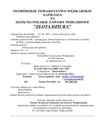 OSTRÓDZKIE TOWARZYSTWO WĘDKARSKIE ZAPRASZA NA OGÓLNO POLSKIE ZAWODY PODLODOWE "ZŁOTA DZIURA" –Zapraszamy do Ostródy – 23 .02 .2013 , Jezioro Drwęckie część Samborowska (Buraki ) –Zbiórka godzina 8.00 – parking przy drodze krajowej nr 16 kierunek z Ostródy do Iławy. (poniżej mapka dojazdu z Ostródy) –Metoda połowu mormyszka lub spławik –Startowe 50 ,- zł –Startowe proszę wpłacać na konto Ostródzkie Towarzystwo Wędkarskie 14-100 Ostróda ul. Mickiewicza 24 Nr konta: Bank Pekao S.A. Oddział w Ostródzie 30 1240 1620 1111 0000 1361 3255 Z dopiskiem "Złota Dziura " Zgłoszenia i wpłaty proszę dokonywać do 18 lutego 2013 Kontakt Jacek Lipiński mail – [email protected] - [email protected] lub Janusz Dawidko tel. 797 285 234 –Zawody odbędą się w klasyfikacji indywidualnej drużynowej (składy drużyn muszą być podane organizatorowi przed rozpoczęciem zawodów) Zawody zaliczane są do rozgrywek o Puchar Krajowej Federacji Towarzystw Wędkarskich, zapraszamy jednak wszystkich, bez względu na przynależność organizacyjną. Gwarantujemy sympatyczną atmosferę. Po zawodach zapewniamy ciepły posiłek ------------------------------------------------------------------------------------------------------- Regulamin zawodów –Zawody odbędą się w czterech turach po 1 godzinie na żywej rybie bez wymiarów ochronnych. –Ryby złowione wkładamy do wiaderka z wodą. –Wiaderka zapewnia organizator. –Przed rozpoczęciem pierwszej tury, będą losowane przez uczestników numery otworu w którym będą łowić w pierwszej turze. –Po turze ryby będą ważone i wypuszczane do wody a zawodnik losuje numer dziury do następnej tury i tak po każdej turze. –Zawody rozgrywane w trzech konkurencjach: Klasyfikacja: indywidualnie – po każdej turze największa waga ryb w turze – odwrotność punktacji czyli 1p indywidualnie - najmniejsza ilość punktów z czterech tur drużynowo – najmniejsza ilość punktów w drużynie ze wszystkich tur Zapraszamy : Zarząd OTW Ostróda
