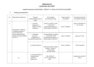 PROGRAM „Kulturalna zima 2009” organizowanego przez Dom Kultury „PRAGA” w okresie od 19 do 30 stycznia 2009 r I. Lp. Propozycje programowe: Bezpośredni organizator 1. Dom Kultury „PRAGA” ul. Dąbrowszczaków 2 03-474 Warszawa; Osoba odpowiedzialna: Dyrektor Tomasz Kaliński 618 41 51 Program (rodzaj proponowanych zajęć) Dni i godziny prowadzonych zajęć 1. warsztaty plastyczne w zakresie: rzeźby, malarstwa, wtorki i czwartki w godz. 11.00-14.00 pracownie plastyczne w Domu Kultury „PRAGA” 2. działalność pracowni komputerowej i kawiarenki internetowej od poniedziałku do piątku od 12.00 do 16.00 kawiarenka internetowa w Domu Kultury „PRAGA” 3. projekcje filmowe Grupy wiekowe uczestników Przewidywana liczba uczestników dziennie grupy uczestników po ok. 12 osób dzieci i młodzież dzieci i młodzież grupy po 8 osób dzieci i młodzież . 100 uczestników Sala Koncertowa w Domu Kultury „ PRAGA” środy i piątki od 14.00- 16.00 j.w. 4. warsztaty naukowe „Eksperymenty szalonych naukowców” DK „PRAGA” 20 i 27 stycznia godz. 14.00 każdorazowo około 25 dzieci 5. Zajecia twórczologiczne 6. wycieczka autokarowa do Kampinosu 22 i 29 stycznia godz. 14.00 Kulig, ognisko 26 stycznia dzieci każdorazowo około 25 dzieci dzieci 50 osób Imprezy artystyczne: 1. 20 stycznia 2009 r godz. 11.00 impreza artystyczna „Karnawałowe hopsasanki” 2. 21 stycznia 2009 r godz. 11.00 przedstawienie teatralne „Święto dywanów” 3. 22 stycznia 2009 r godz. 11.00 impreza artystyczna „Rumba, samba w karnawale” 4. 23 stycznia 2009 r godz. 11.00 Dyskoteka karnawałowa, konkursy z nagrodami 5. 26 stycznia 2009 r. godz. 9.00 wycieczka autokarowa do Kampinosu: kulig i ognisko z pieczeniem kiełbasek 6. 27 stycznia 2009 r godz. 11.00 przedstawienie teatralne „Kufer Pana Andersena” 7. 27 stycznia godz. 13.00 przedstawienie teatralne „Ganga – rzeka życia” 8. 28 stycznia 2009 r godz. 11.00 impreza artystyczna „Wesołe krasnale grają niezłe bale” 9. 29 stycznia 2009 r godz. 11.00 Bal karnawałowy, zabawy i konkursy 10. 30 stycznia 2009 r godz. 11.00 Impreza artystyczna z konkursami i niespodziankami