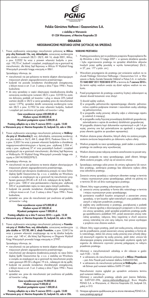Polskie Górnictwo Naftowe i Gazownictwo S.A. z siedzibą w Warszawie 01-224 Warszawa, ul Marcina Kasprzaka 25 OGŁASZA NIEOGRANICZONE PRZETARGI USTNE (LICYTACJE) NA SPRZEDAŻ: 1. Prawa użytkowania wieczystego nieruchomości położonej w Miliczu przy ulicy Kościuszki 15a, woj. dolnośląskie, oznaczonej ewidencyjnie jako działki o numerach 28/2 i 28/3, AM 16, obręb 0001, Milicz, o pow. 0,2052 ha wraz z prawem własności budynku o pow. użyt. 193,70 m2, budowli i urządzeń, znajdujących się w granicach tej nieruchomości, dla której Sąd Rejonowy w Miliczu IV Wydział Ksiąg Wieczystych prowadzi księgę wieczystą nr 8861. WARUNKI PRZETARGU: 1. Przetarg prowadzony jest na podstawie przepisów Rozporządzenia Rady Ministrów z dnia 13 lutego 2007 r. w sprawie określenia sposobu i trybu organizowania przetargu na sprzedaż składników aktywów trwałych przez spółkę powstałą w wyniku komercjalizacji (Dz.U., nr 27, poz. 177 z późn. zm.). Sprzedający informuje, że: • nieruchomość nie jest położona na terenie objętym obowiązującym miejscowym planem zagospodarowania przestrzennego; • budynek nie posiada świadectwa charakterystyki energetycznej, o którym mowa w art. 5 ust. 3 ustawy z dnia 7 lipca 1994 r. Prawo budowlane; • do ceny sprzedaży w części obejmującej niezabudowaną działkę oznaczoną ewidencyjnie numerem 28/2 o pow. 0,0100 ha zostanie doliczony podatek od towarów i usług w stawce 22% (udział wartości działki nr 28/2 w cenie sprzedaży praw do nieruchomości wynosi 1,97%), sprzedaż działki oznaczonej ewidencyjnie numerem 28/3 o pow. 0,1952 ha oraz własności budynku, budowli i urządzeń jest zwolniona od podatku od towarów i usług. 2. Warunkiem przystąpienia do przetargu jest wniesienie wadium na rachunek Polskiego Górnictwa Naftowego i Gazownictwa S.A. w Warszawie w Banku Societe Generale Oddział w Polsce S.A. nr rachunku: 73 1840 0007 2211 9220 0810 5719 w terminie do 7 czerwca 2010 r. Za termin wpłaty wadium uważa się dzień wpływu wadium na ww. konto. 3. Przed przystąpieniem do przetargu uczestnicy licytacji zobowiązani są okazać dowód tożsamości oraz złożyć: 1) dowód wpłaty wadium, 2) w przypadku pełnomocnika reprezentującego oferenta: pełnomocnictwo czytelnie podpisane imieniem i nazwiskiem osoby udzielającej pełnomocnictwa, 3) w przypadku osoby prawnej: aktualny odpis z właściwego rejestru (z ostatnich 6 miesięcy), 4) w przypadku osoby fizycznej prowadzącej działalność gospodarczą: zaświadczenie o wpisie do ewidencji działalności gospodarczej. W przypadku złożenia kopii dokumentów wymienionych w pkt 1-4 powyżej, powinny one być poświadczone za zgodność z oryginałem przez oferenta zgodnie ze sposobem reprezentacji. Cena wywoławcza wynosi 420.000,00 zł. Wadium wynosi 42.000,00 zł. Wysokość postąpienia wynosi 5.000,00 zł. Przetarg odbędzie się w dniu 9 czerwca 2010 r. o godz. 12.00 w Warszawie przy ul. Marcina Kasprzaka 25, budynek C6, sala nr 206. 2. Prawa użytkowania wieczystego nieruchomości położonej w Wałbrzychu przy ul. Wrocławskiej 2, woj. dolnośląskie, oznaczonej ewidencyjnie jako działka nr 56/2, AM 3, obręb 0013, Piaskowa Góra nr 13, o pow. 0,3031 ha wraz z prawem własności budynków o charakterze magazynowo-administracyjnym o łącznej pow. użytkowej 2.504 m2, wiaty o pow. użytkowej 37 m2 oraz pozostałych budowli i urządzeń znajdujących się w granicach nieruchomości, dla której Sąd Rejonowy w Wałbrzychu VII Wydział Ksiąg Wieczystych prowadzi księgę wieczystą nr SW1W/00022978/5. Sprzedający informuje, że: • nieruchomość nie jest położona na terenie objętym obowiązującym miejscowym planem zagospodarowania przestrzennego, • nieruchomość jest obciążona służebnością przesyłu na rzecz Dolnośląskiej Spółki Gazownictwa Sp. z o.o. z siedzibą we Wrocławiu w związku ze znajdującym się w granicach tej nieruchomości przyłączem gazowym DN 40 o dł. 6,8 m.b. należącym do tej Spółki, • grunt o pow. 1200 m2 oraz pomieszczenia o łącznej pow. użytkowej 320 m2 są przedmiotem najmu na rzecz pięciu różnych podmiotów, • budynek nie posiada świadectwa charakterystyki energetycznej, o którym mowa w art. 5 ust. 3 ustawy z dnia 7 lipca 1994 r. Prawo budowlane, • sprzedaż ww. praw do nieruchomości jest zwolniona od podatku od towarów i usług. Cena wywoławcza wynosi 675.000,00 zł. Wadium wynosi 67.500,00 zł. Wysokość postąpienia wynosi 7.000,00 zł. Przetarg odbędzie się w dniu 9 czerwca 2010 r. o godz. 12.30 w Warszawie przy ul. Marcina Kasprzaka 25, budynek C6, sala nr 206. 3. Prawa użytkowania wieczystego nieruchomości położonej w Przemkowie przy ul. Wielkie Piece, woj. dolnośląskie, oznaczonej ewidencyjnie jako działka nr 137/30, AM 3, obręb Przemków, o pow. 0,0415 ha wraz z prawem własności znajdującego się na tej działce budynku o pow. użyt. 140 m2, dla której Sąd Rejonowy w Głogowie Wydział Ksiąg Wieczystych prowadzi księgę wieczystą nr 27997. Sprzedający informuje, że: • nieruchomość nie jest położona na terenie objętym obowiązującym miejscowym planem zagospodarowania przestrzennego; • nieruchomość jest obciążona służebnością przesyłu na rzecz Dolnośląskiej Spółki Gazownictwa Sp. z o.o. z siedzibą we Wrocławiu w związku ze znajdującym się w granicach tej nieruchomości przyłączem gazowym DN 50 o długości 19 m.b., należącymi do tej spółki; • budynek nie posiada świadectwa charakterystyki energetycznej, o którym mowa w art. 5 ust. 3 ustawy z dnia 7 lipca 1994 r. Prawo budowlane; • sprzedaż ww. praw do nieruchomości jest zwolniona od podatku od towarów i usług. Cena wywoławcza wynosi 95.000,00 zł. Wadium wynosi 9.500,00 zł. Wysokość postąpienia wynosi 1.000,00 zł. Przetarg odbędzie się w dniu 9 czerwca 2010 r. o godz. 13.00 w Warszawie przy ul. Marcina Kasprzaka 25, budynek C6, sala nr 206. 4. Wadium złożone przez 