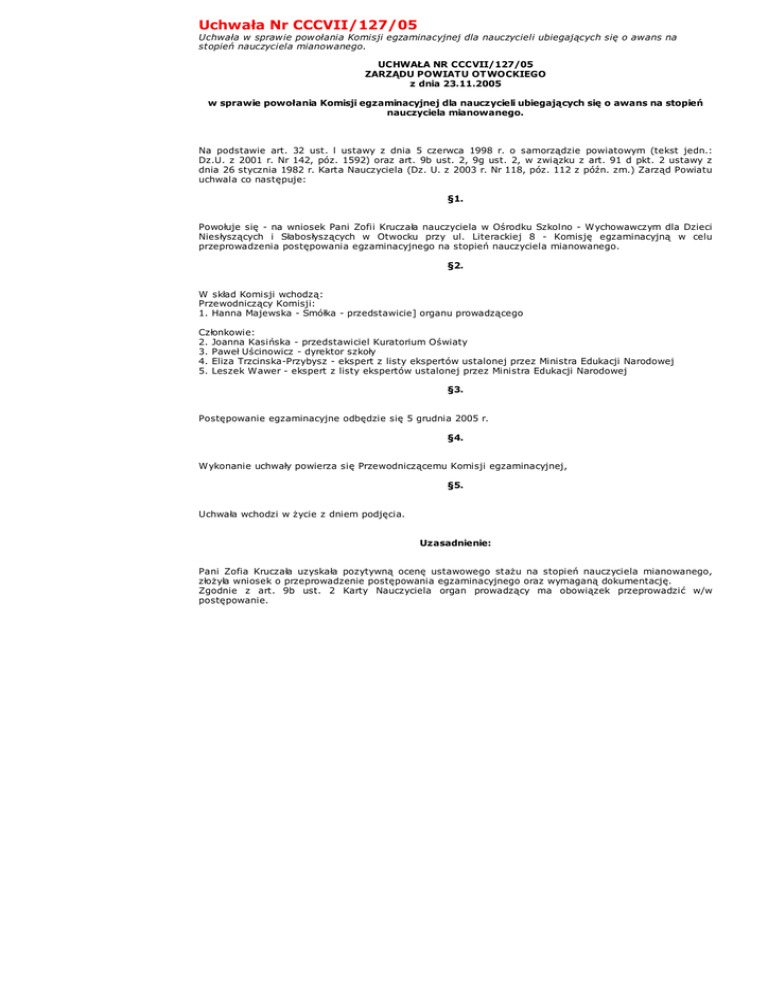 Uchwała Nr CCCVII/127/05 Uchwała w sprawie powołania Komisji egzaminacyjnej dla nauczycieli ubiegających się o awans na stopień nauczyciela mianowanego. UCHWAŁA NR CCCVII/127/05 ZARZĄDU POWIATU OTWOCKIEGO z dnia 23.11.2005 w sprawie powołania Komisji egzaminacyjnej dla nauczycieli ubiegających się o awans na stopień nauczyciela mianowanego. Na podstawie art. 32 ust. l ustawy z dnia 5 czerwca 1998 r. o samorządzie powiatowym (tekst jedn.: Dz.U. z 2001 r. Nr 142, póz. 1592) oraz art. 9b ust. 2, 9g ust. 2, w związku z art. 91 d pkt. 2 ustawy z dnia 26 stycznia 1982 r. Karta Nauczyciela (Dz. U. z 2003 r. Nr 118, póz. 112 z późn. zm.) Zarząd Powiatu uchwala co następuje: §1. Powołuje się - na wniosek Pani Zofii Kruczała nauczyciela w Ośrodku Szkolno - Wychowawczym dla Dzieci Niesłyszących i Słabosłyszących w Otwocku przy ul. Literackiej 8 - Komisję egzaminacyjną w celu przeprowadzenia postępowania egzaminacyjnego na stopień nauczyciela mianowanego. §2. W skład Komisji wchodzą: Przewodniczący Komisji: 1. Hanna Majewska - Smółka - przedstawicie] organu prowadzącego Członkowie: 2. Joanna Kasińska - przedstawiciel Kuratorium Oświaty 3. Paweł Uścinowicz - dyrektor szkoły 4. Eliza Trzcinska-Przybysz - ekspert z listy ekspertów ustalonej przez Ministra Edukacji Narodowej 5. Leszek Wawer - ekspert z listy ekspertów ustalonej przez Ministra Edukacji Narodowej §3. Postępowanie egzaminacyjne odbędzie się 5 grudnia 2005 r. §4. Wykonanie uchwały powierza się Przewodniczącemu Komisji egzaminacyjnej, §5. Uchwała wchodzi w Ŝycie z dniem podjęcia. Uzasadnienie: Pani Zofia Kruczała uzyskała pozytywną ocenę ustawowego staŜu na stopień nauczyciela mianowanego, złoŜyła wniosek o przeprowadzenie postępowania egzaminacyjnego oraz wymaganą dokumentację. Zgodnie z art. 9b ust. 2 Karty Nauczyciela organ prowadzący ma obowiązek przeprowadzić w/w postępowanie.