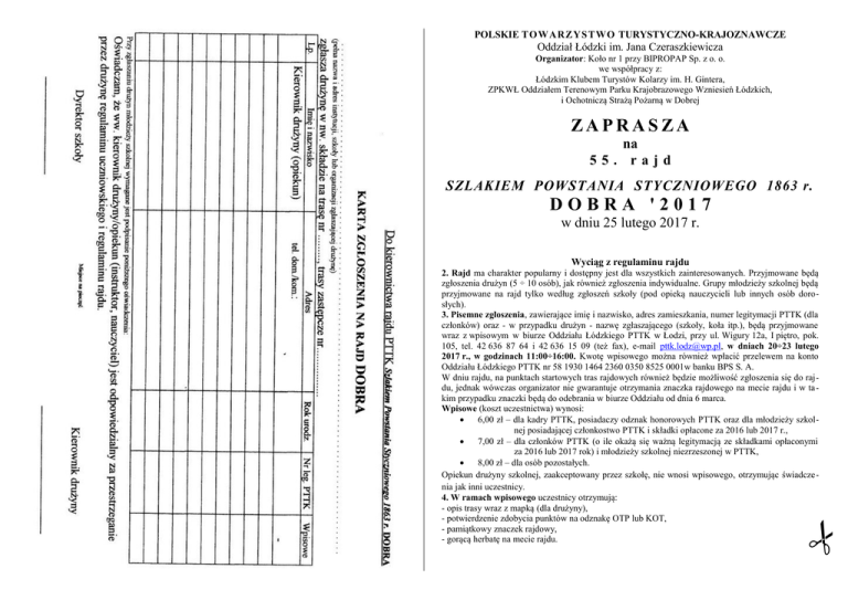 POLSKIE TO WARZYS T WO TURYSTYCZNO-KRAJOZNAWCZE Oddział Łódzki im. Jana Czeraszkiewicza Organizator: Koło nr 1 przy BIPROPAP Sp. z o. o. we współpracy z: Łódzkim Klubem Turystów Kolarzy im. H. Gintera, ZPKWŁ Oddziałem Terenowym Parku Krajobrazowego Wzniesień Łódzkich, i Ochotniczą Strażą Pożarną w Dobrej ZAPRASZA na 55. rajd SZLAKIEM POWSTANIA STYCZNIOWEGO 1863 r. DOBRA '2017 w dniu 25 lutego 2017 r. Wyciąg z regulaminu rajdu 2. Rajd ma charakter popularny i dostępny jest dla wszystkich zainteresowanych. Przyjmowane będą zgłoszenia drużyn (5 ÷ 10 osób), jak również zgłoszenia indywidualne. Grupy młodzieży szkolnej będą przyjmowane na rajd tylko według zgłoszeń szkoły (pod opieką nauczycieli lub innych osób dorosłych). 3. Pisemne zgłoszenia, zawierające imię i nazwisko, adres zamieszkania, numer legitymacji PTTK (dla członków) oraz - w przypadku drużyn - nazwę zgłaszającego (szkoły, koła itp.), będą przyjmowane wraz z wpisowym w biurze Oddziału Łódzkiego PTTK w Łodzi, przy ul. Wigury 12a, I piętro, pok. 105, tel. 42 636 87 64 i 42 636 15 09 (też fax), e-mail [email protected], w dniach 20÷23 lutego 2017 r., w godzinach 11:00÷16:00. Kwotę wpisowego można również wpłacić przelewem na konto Oddziału Łódzkiego PTTK nr 58 1930 1464 2360 0350 8525 0001w banku BPS S. A. W dniu rajdu, na punktach startowych tras rajdowych również będzie możliwość zgłoszenia się do raj du, jednak wówczas organizator nie gwarantuje otrzymania znaczka rajdowego na mecie rajdu i w ta kim przypadku znaczki będą do odebrania w biurze Oddziału od dnia 6 marca. Wpisowe (koszt uczestnictwa) wynosi: 6,00 zł – dla kadry PTTK, posiadaczy odznak honorowych PTTK oraz dla młodzieży szkolnej posiadającej członkostwo PTTK i składki opłacone za 2016 lub 2017 r., 7,00 zł – dla członków PTTK (o ile okażą się ważną legitymacją ze składkami opłaconymi za 2016 lub 2017 rok) i młodzieży szkolnej niezrzeszonej w PTTK, 8,00 zł – dla osób pozostałych. Opiekun drużyny szkolnej, zaakceptowany przez szkołę, nie wnosi wpisowego, otrzymując świadcze nia jak inni uczestnicy. 4. W ramach wpisowego uczestnicy otrzymują: - opis trasy wraz z mapką (dla drużyny), - potwierdzenie zdobycia punktów na odznakę OTP lub KOT, - pamiątkowy znaczek rajdowy, - gorącą herbatę na mecie rajdu. Poniższa, orientacyjna mapka ma służyć wyłącznie do wyboru trasy przed zapisem. Dokładniejszą, wraz z opisem, dostaniecie na starcie do rajdu. Przebieg tras oznaczono cyframi arabskimi, odpowiadającymi numerom tras wg programu. Program rajdu 1. Zbiórka uczestników poszczególnych tras w dniu 25.02.2017 r. (sobota) w wyznaczonym miejscu i czasie startu. 2. Od startu do godz. 12:00 – przejście (przejazd) tras z miejsc startu do Dobrej. 3. Godz. 12:00 – spotkanie uczestników z wszystkich tras w świetlicy OSP w Dobrej, gdzie wydawane będą potwierdzenia zdobytych punktów na odznaki OTP i KOT, a także gorąca herbata i inne świadczenia, oraz zakończony będzie konkurs nt. Powstania Styczniowego 1863 r. i Parku Krajobrazowego Wzniesień Łódzkich. 4. Godz. 12:30 ÷ 13:00 – przejście na cmentarz, zapalenie zniczy i złożenie kwiatów pod pomnikiem poległych powstańców. 5. Po uroczystości: – turyści piesi – przejście do autobusów* i powrót do Łodzi, – turyści-kolarze – II etap rajdu – powrót do Łodzi. Trasy rajdowe Nr trasy Rodzaj Trasa nr 1 piesza Trasa nr 2 Trasa nr 3 Trasa nr 4 II etap dla skiej Dług. Trasa 7 km Start o godz. 10:15 z przystanku „Borchówka Las” aut. MPK linii 88 (odjazd z Dworca Północnego PKS o 9:31) Borchówka – Dobieszków – Michałówek – Dobra piesza 7 km Start ok. godz. 9:10 z przystanku w Łagiewnikach (przy szpitalu) aut. MPK linii 51 (odjazd z Dworca Fabrycznego o godz. 8:41, ze Zgierza – Plac Kilińskiego ok. godz. 8:22) i linii 66 (odjazd z Ronda Powstańców 1863 r. o godz. 8:50) Łagiewniki – Skotniki – Klęk – Kiełmina – Dobra piesza 8 km Start o godz. 10:00 z przystanku „Dobieszków O. Sz. i W.” aut. MPK linii 60B (odjazd z Dworca Fabrycznego o godz. 9:04) Dobieszków – Ługi – Orzechówek – Dobra kolarska ~25 km Start o godz. 9:00 z Rynku Starego Miasta w Łodzi Przebieg trasy Łódź – Dobra – Łódź będzie podany w komutrasy kolar~15 km nikacie w biurze Oddziału w dniach zapisu. Zapraszamy Łódź, 3.02.2017 r. Organizatorzy Podczas rajdu rozgrywany będzie konkurs nt. Powstania Styczniowego 1863 r. i Parku Krajobrazowego Wzniesień Łódzkich (PKWŁ), organizowany przez Zespół Parków Krajobrazowych Województwa Łódzkiego - Oddział Terenowy PKWŁ. Pełny regulamin rajdu (wraz z regulaminem konkursu) otrzymają uczestnicy w podanym na odwrocie miejscu (biuro Oddziału Łódzkiego PTTK) i terminie przyjmowania zgłoszeń. * organizatorzy umożliwią uczestnikom powrót do Łodzi specjalnymi autobusami, w których obowiązuje kasowanie biletów MPK.