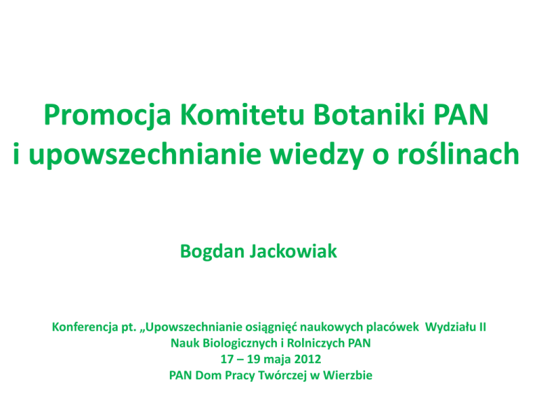 Promocja Komitetu Botaniki PAN i upowszechnianie wiedzy o roślinach Bogdan Jackowiak Konferencja pt. „Upowszechnianie osiągnięć naukowych placówek Wydziału II Nauk Biologicznych i Rolniczych PAN 17 – 19 maja 2012 PAN Dom Pracy Twórczej w Wierzbie • W pięciu ośrodkach akademickich kraju: Poznań, Lublin, Katowice, Olsztyn, Białystok pod auspicjami KB PAN • Cel: zwrócenie uwagi na znaczenie roślin i szaty roślinnej dla funkcjonowania biosfery i samego Człowieka • Uczestnicy: uczniowie, studenci i nauczyciele akademiccy i naukowcy różnych specjalności, osoby starsze, słuchacze Uniwersytetu III wieku Europejska Organizacja Nauki o Roślinach (EPSO) Wydział Biologii Uniwersytetu im. Adama Mickiewicza Komitet Botaniki Polskiej Akademii Nauk Fascynujący świat roślin Aula Lubrańskiego, Collegium Minus, ul. Wieniawskiego 1 w Poznaniu 14 maja 2012 r. Europejska Organizacja Nauki o Roślinach (EPSO) Wydział Biologii Uniwersytetu im. Adama Mickiewicza Komitet Botaniki Polskiej Akademii Nauk 16.00 Powitanie i wprowadzenie Bogdan Jackowiak & Przemysław Wojtaszek 16.05 Muzyka na dobry początek Kameralny zespół muzyczny 16.30 'Niggerhead' - słów kilka o niepoprawnej Radosław Dylewski politycznie nomenklaturze botanicznej 16.45 Plants”ᴙ”Us Przemysław Wojtaszek 17.00 Matematyk nauk w ogrodzie Wojciech Gajda 17.15 Zawsze znajdzie się czas na filiżankę dobrej Czesław Błaszak herbaty 17.30 „Morfologie ciszy” - wystawa prac studentów WP-A w Kaliszu (Pracownia Malarstwa prof. Marka Zaborowskiego i dr Joanny Dudek, mini-koncert, degustacja 18.00 18.15 18.30 O ziemniaku, który się suszy nie kłania Dlaczego fotosynteza fascynuje fizyków Czy pierwsi ludzie byli wegetarianami? Zofia Szweykowska-Kulińska Ryszard Naskręcki Ks. Janusz Nawrot 18.45 Światowa kariera niewielkiego krzewu Jerzy Parysek 19.00 „Morfologie ciszy” – cd. 19.30 Osobliwości świata roślin Justyna Wiland-Szymańska 19.45 Przyroda widziana oczyma poetów Tomasz Pokrzywniak 20.00 Zakończenie Przemysław Wojtaszek & Bogdan Jackowiak 20.15 Pamiętajcie o ogrodach Wyk. Tomasz Hanć Europejska Organizacja Nauki o Roślinach (EPSO) Wydział Biologii Uniwersytetu im. Adama Mickiewicza Komitet Botaniki Polskiej Akademii Nauk Europejska Organizacja Nauki o Roślinach (EPSO) Wydział Biologii Uniwersytetu im. Adama Mickiewicza Komitet Botaniki Polskiej Akademii Nauk Europejska Organizacja Nauki o Roślinach (EPSO) Wydział Biologii Uniwersytetu im. Adama Mickiewicza Komitet Botaniki Polskiej Akademii Nauk Europejska Organizacja Nauki o Roślinach (EPSO) Wydział Biologii Uniwersytetu im. Adama Mickiewicza Komitet Botaniki Polskiej Akademii Nauk Europejska Organizacja Nauki o Roślinach (EPSO) Wydział Biologii Uniwersytetu im. Adama Mickiewicza Komitet Botaniki Polskiej Akademii Nauk Michał Gajda i Konrad Mikołajczyk A. Krzanowski - Taniec Góralski J. S. Bach - Cantata BWV 147 F. Angelis - Paris - Moscou V. Monti - Czardasz Fascynujący świat roślin Europejska Organizacja Nauki o Roślinach (EPSO) Wydział Biologii Uniwersytetu im. Adama Mickiewicza Komitet Botaniki Polskiej Akademii Nauk dr Radosław Dylewski Wydział Anglistyki 'Niggerhead' - słów kilka o niepoprawnej politycznie nomenklaturze botanicznej Fascynujący świat roślin Europejska Organizacja Nauki o Roślinach (EPSO) Wydział Biologii Uniwersytetu im. Adama Mickiewicza Komitet Botaniki Polskiej Akademii Nauk prof. dr hab. Przemysław Wojtaszek Wydział Biologii Plants ‘я’ Us Fascynujący świat roślin Europejska Organizacja Nauki o Roślinach (EPSO) Wydział Biologii Uniwersytetu im. Adama Mickiewicza Komitet Botaniki Polskiej Akademii Nauk prof. dr hab. Wojciech Gajda Wydział Matematyki i Informatyki Matematyk w ogrodzie Fascynujący świat roślin Europejska Organizacja Nauki o Roślinach (EPSO) Wydział Biologii Uniwersytetu im. Adama Mickiewicza Komitet Botaniki Polskiej Akademii Nauk prof. dr hab. dr hc. Czesław Błaszak Wydział Biologii Zawsze znajdzie się czas na filiżankę dobrej herbaty Fascynujący świat roślin Europejska Organizacja Nauki o Roślinach (EPSO) Wydział Biologii Uniwersytetu im. Adama Mickiewicza Komitet Botaniki Polskiej Akademii Nauk prof. dr hab. Marek Zaborowski Dr Joanna Dudek Wydział Pedagogiczno-Artystyczny w Kaliszu Morfologie ciszy Fascynujący świat roślin Europejska Organizacja Nauki o Roślinach (EPSO) Wydział Biologii Uniwersytetu im. Adama Mickiewicza Komitet Botaniki Polskiej Akademii Nauk prof. dr hab. Zofia Szweykowska-Kulińska Wydział Biologii O ziemniaku, który się suszy nie kłania Fascynujący świat roślin Europejska Organizacja Nauki o Roślinach (EPSO) Wydział Biologii Uniwersytetu im. Adama Mickiewicza Komitet Botaniki Polskiej Akademii Nauk prof. dr hab. Ryszard Naskręcki Wydział Fizyki Dlaczego fotosynteza fascynuje fizyków? Fascynujący świat roślin Europejska Organizacja Nauki o Roślinach (EPSO) Wydział Biologii Uniwersytetu im. Adama Mickiewicza Komitet Botaniki Polskiej Akademii Nauk Ks. prof. dr hab. Janusz Nawrot Wydział Teologiczny Czy pierwsi ludzie byli wegetarianami? Fascynujący świat roślin Europejska Organizacja Nauki o Roślinach (EPSO) Wydział Biologii Uniwersytetu im. Adama Mickiewicza Komitet Botaniki Polskiej Akademii Nauk prof. dr hab. Jerzy Parysek Wydział Nauk Geograficznych i Geologicznych Światowa kariera niewielkiego krzewu Fascynujący świat roślin Europejska Organizacja Nauki o Roślinach (EPSO) Wydział Biologii Uniwersytetu im. Adama Mickiewicza Komitet Botaniki Polskiej Akademii Nauk prof. dr hab. Marek Zaborowski Dr Joanna Dudek Wydział Pedagogiczno-Artystyczny w Kaliszu Morfologie ciszy Fascynujący świat roślin Europejska Organizacja Nauki o Roślinach (EPSO) Wydział Biologii Uniwersytetu im. Adama Mickiewicza Komitet Botaniki Polskiej Akademii Nauk dr hab. Justyna Wiland-Szymańska Wydział Biologii – Ogród Botaniczny UAM Osobliwości świata roślin Fascynujący świat roślin Europej