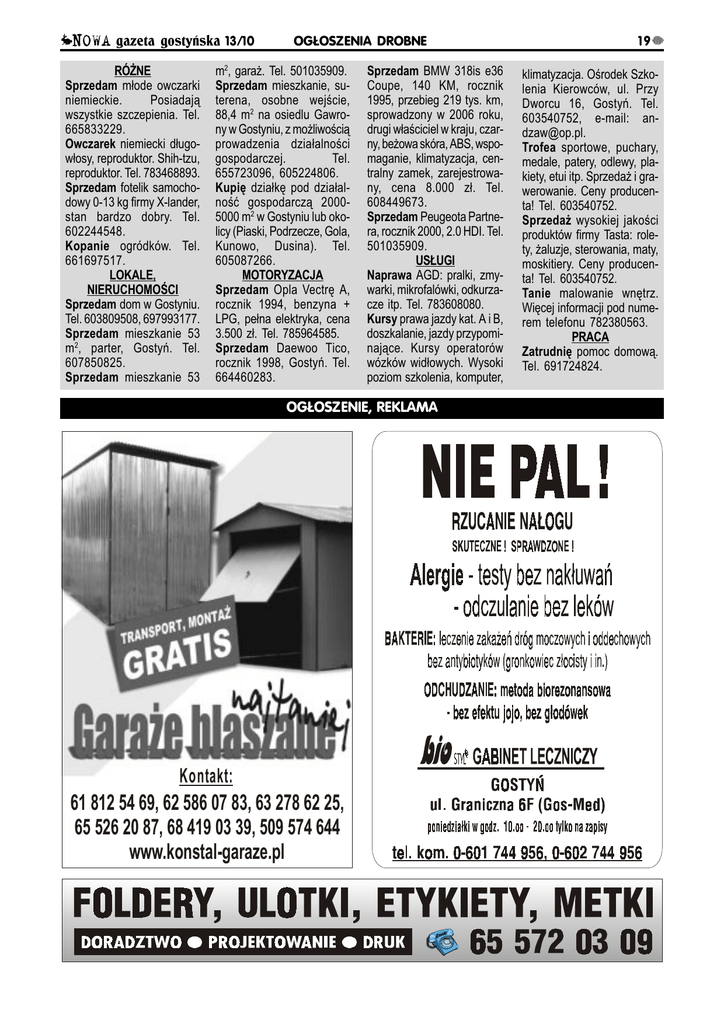 NOWA gazeta gostyñska 13/10 RÓ¯NE Sprzedam m³ode owczarki niemieckie. Posiadaj¹ wszystkie szczepienia. Tel. 665833229. Owczarek niemiecki d³ugow³osy, reproduktor. Shih-tzu, reproduktor. Tel. 783468893. Sprzedam fotelik samochodowy 0-13 kg firmy X-lander, stan bardzo dobry. Tel. 602244548. Kopanie ogródków. Tel. 661697517. LOKALE, NIERUCHOMOCI Sprzedam dom w Gostyniu. Tel. 603809508, 697993177. Sprzedam mieszkanie 53 m2, parter, Gostyñ. Tel. 607850825. Sprzedam mieszkanie 53 OG£OSZENIA DROBNE m2, gara¿. Tel. 501035909. Sprzedam mieszkanie, suterena, osobne wejcie, 88,4 m2 na osiedlu Gawrony w Gostyniu, z mo¿liwoci¹ prowadzenia dzia³alnoci gospodarczej. Tel. 655723096, 605224806. Kupiê dzia³kê pod dzia³alnoæ gospodarcz¹ 20005000 m2 w Gostyniu lub okolicy (Piaski, Podrzecze, Gola, Kunowo, Dusina). Tel. 605087266. MOTORYZACJA Sprzedam Opla Vectrê A, rocznik 1994, benzyna + LPG, pe³na elektryka, cena 3.500 z³. Tel. 785964585. Sprzedam Daewoo Tico, rocznik 1998, Gostyñ. Tel. 664460283. Sprzedam BMW 318is e36 Coupe, 140 KM, rocznik 1995, przebieg 219 tys. km, sprowadzony w 2006 roku, drugi w³aciciel w kraju, czarny, be¿owa skóra, ABS, wspomaganie, klimatyzacja, centralny zamek, zarejestrowany, cena 8.000 z³. Tel. 608449673. Sprzedam Peugeota Partnera, rocznik 2000, 2.0 HDI. Tel. 501035909. US£UGI Naprawa AGD: pralki, zmywarki, mikrofalówki, odkurzacze itp. Tel. 783608080. Kursy prawa jazdy kat. A i B, doszkalanie, jazdy przypominaj¹ce. Kursy operatorów wózków wid³owych. Wysoki poziom szkolenia, komputer, OG£OSZENIE, REKLAMA Kontakt: 61 812 54 69, 62 586 07 83, 63 278 62 25, 65 526 20 87, 68 419 03 39, 509 574 644 www.konstal-garaze.pl 19 klimatyzacja. Orodek Szkolenia Kierowców, ul. Przy Dworcu 16, Gostyñ. Tel. 603540752, e-mail: [email protected]. Trofea sportowe, puchary, medale, patery, odlewy, plakiety, etui itp. Sprzeda¿ i grawerowanie. Ceny producenta! Tel. 603540752. Sprzeda¿ wysokiej jakoci produktów firmy Tasta: rolety, ¿aluzje, sterowania, maty, moskitiery. Ceny producenta! Tel. 603540752. Tanie malowanie wnêtrz. Wiêcej informacji pod numerem telefonu 782380563. PRACA Zatrudniê pomoc domow¹. Tel. 691724824.