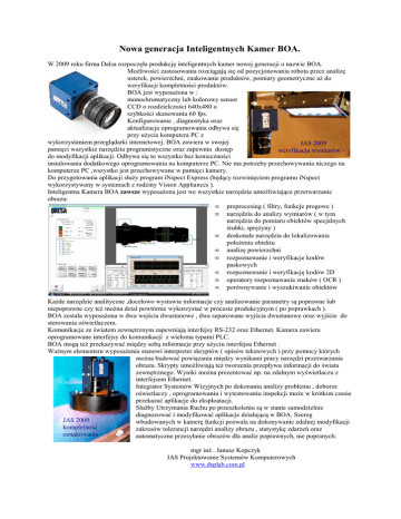Nowa generacja Inteligentnych Kamer BOA. W 2009 roku firma Dalsa rozpoczęła produkcję inteligentnych kamer nowej generacji o nazwie BOA. Możliwości zastosowania rozciągają się od pozycjonowania robota przez analizę usterek, powierzchni, znakowanie produktów, pomiary geometryczne aż do weryfikacji kompletności produktów. BOA jest wyposażona w : monochromatyczny lub kolorowy sensor CCD o rozdzielczości 640x480 o szybkości skanowania 60 fps. Konfigurowanie , diagnostyka oraz aktualizacja oprogramowania odbywa się przy użycia komputera PC z wykorzystaniem przeglądarki internetowej. BOA zawiera w swojej JAS 2009 pamięci wszystkie narzędzia programistyczne oraz zapewnia dostęp weryfikacja wymiarów do modyfikacji aplikacji. Odbywa się to wszystko bez konieczności instalowania dodatkowego oprogramowania na komputerze PC. Nie ma potrzeby przechowywania niczego na komputerze PC ,wszystko jest przechowywane w pamięci kamery. Do przygotowania aplikacji służy program iNspect Express (będący rozwinięciem programu iNspect wykorzystywany w systemach z rodziny Vision Appliances ). Inteligentna Kamera BOA zawsze wyposażona jest we wszystkie narzędzia umożliwiające przetwarzanie obrazu: • preprocesing ( filtry, funkcje progowe ) • narzędzia do analizy wymiarów ( w tym narzędzia do pomiaru obiektów specjalnych śrubki, sprężyny ) • doskonałe narzędzia do lokalizowania położenia obiektu • analizę powierzchni • rozpoznawanie i weryfikacje kodów paskowych • rozpoznawanie i weryfikację kodów 2D • operatory rozpoznawania znaków ( OCR ) • porównywanie i wyszukiwanie obiektów Każde narzędzie analityczne ,docelowo wystawia informacje czy analizowanie parametry są poprawne lub niepoprawne czy też można detal powtórnie wykorzystać w procesie produkcyjnym ( po poprawkach ). BOA została wyposażona w dwa wejścia dwustanowe , dwa separowane wyjścia dwustanowe oraz wyjście do sterowania oświetlaczem. Komunikacje ze światem zewnętrznym zapewniają interfejsy RS-232 oraz Ethernet. Kamera zawiera oprogramowane interfejsy do komunikacji z wieloma typami PLC. BOA mogą też przekazywać między sobą informacje przy użyciu interfejsu Ethernet . Ważnym elementem wyposażenia stanowi interpreter skryptów ( opisów tekstowych ) przy pomocy których można budować powiązania między wynikami pracy narzędzi przetwarzania obrazu. Skrypty umożliwiają też tworzenia przepływu informacji do świata zewnętrznego. Wyniki można prezentować np. na zdalnym wyświetlaczu z interfejsem Ethernet. Integrator Systemów Wizyjnych po dokonaniu analizy problemu , doborze oświetlaczy , oprogramowaniu i wytestowaniu inspekcji może w krótkim czasie przekazać aplikacje do eksploatacji. Służby Utrzymania Ruchu po przeszkoleniu są w stanie samodzielnie diagnozować i modyfikować aplikacje działającą w BOA. Szereg JAS 2009 wbudowanych w kamerę funkcji pozwala na dokonywanie zdalnej modyfikacji kompletność zakresów tolerancji narzędzi analizy obrazu , statystykę zdarzeń oraz oznakowanie automatyczne przesyłanie obrazów dla analiz poprawnych, nie popranych. mgr inż.. Janusz Kopczyk JAS Projektowanie Systemów Komputerowych www.dsplab.com.pl