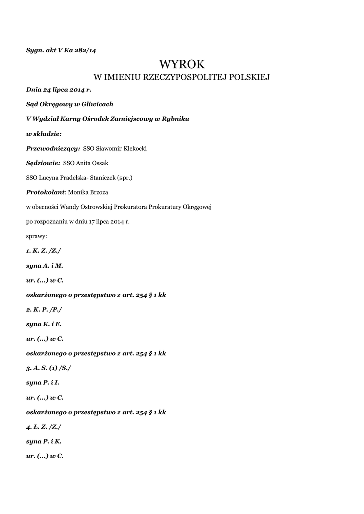 Sygn. akt V Ka 282/14 WYROK W IMIENIU RZECZYPOSPOLITEJ POLSKIEJ Dnia 24 lipca 2014 r. Sąd Okręgowy w Gliwicach V Wydział Karny Ośrodek Zamiejscowy w Rybniku w składzie: Przewodniczący: SSO Sławomir Klekocki Sędziowie: SSO Anita Ossak SSO Lucyna Pradelska- Staniczek (spr.) Protokolant: Monika Brzoza w obecności Wandy Ostrowskiej Prokuratora Prokuratury Okręgowej po rozpoznaniu w dniu 17 lipca 2014 r. sprawy: 1. K. Z. /Z./ syna A. i M. ur. (...) w C. oskarżonego o przestępstwo z art. 254 § 1 kk 2. K. P. /P./ syna K. i E. ur. (...) w C. oskarżonego o przestępstwo z art. 254 § 1 kk 3. A. S. (1) /S./ syna P. i I. ur. (...) w C. oskarżonego o przestępstwo z art. 254 § 1 kk 4. Ł. Z. /Z./ syna P. i K. ur. (...) w C. oskarżonego o przestępstwo z art. 254 § 1 kk 5. R. C. /C./ syna J. i M. ur. (...) w T. oskarżonego o przestępstwo z art. 254 § 1 kk 6. M. W. /W./ syna I. i D. ur. (...) w T. oskarżonego o przestępstwo z art. 254 § 1 kk na skutek apelacji wniesionych przez obrońcę oskarżonych od wyroku Sądu Rejonowego w Żorach z dnia 25 października 2013r. sygn. akt II K 619/11 I. utrzymuje w mocy zaskarżony wyrok, uznając wszystkie apelacje za oczywiście bezzasadne; II. wymierza opłaty za postępowanie odwoławcze od oskarżonych: - K. Z. w kwocie 120,00 (sto dwadzieścia ) złotych, - K. P. w kwocie 120,00 (sto dwadzieścia) złotych, - A. S. (1) w kwocie 120,00 (sto dwadzieścia) złotych, - Ł. Z. w kwocie 180,00 (sto osiemdziesiąt) złotych, - R. C. w kwocie 300,00 (trzysta) złotych, - M. W. w kwocie 120,00 (sto dwadzieścia) złotych, oraz obciąża ich wydatkami za II instancję po 1/6 z 20,00 (dwudziestu) złotych. Sygn. akt V Ka 282/14 UZASADNIENIE Sąd Rejonowy w Żorach wyrokiem z dnia 25 października 2013 roku w sprawie o sygn. II K 619/11 uznał oskarżonych K. Z., K. P., A. S. (1), Ł. Z., R. C. i M. W. za winnych tego, że w dniu 15 kwietnia 2011 roku w Ż. działając wspólnie i w porozumieniu z innymi osobami brali udział w zbiegowisku wiedząc o tym, że uczestnicy wspólnymi siłami dopuszczają się gwałtownego zamachu na małoletnich W. N., J. W. (1) oraz Ł. K. poprzez uderzanie rękami i kopanie ich po całym ciele oraz zamachu na mienie poprzez wybicie szyby w samochodzie osobowym marki (...) własności Z. N., tj. przestępstwa z art. 254 § 1 k.k. i za to na mocy art. 254 § 1 k.k. wymierzył: - K. Z., K. P., A. S. (1) i M. W. karę po 6 miesięcy pozbawienia wolności, - Ł. Z. karę 10 miesięcy pozbawienia wolności, - R. C. karę 1 roku i 3 miesięcy pozbawienia wolności. Na mocy art. 69 § 1 i 2 k.k., art. 70 §1 punkt 1 k.k. i art. 73 § 1 k.k. Sąd Rejonowy warunkowo zawiesił wykonanie orzeczonej wobec K. P. kary pozbawienia wolności na okres próby wynoszący 4 lata, oddając go w tym okresie pod dozór kuratora. Na mocy art. 69 § 1 i 2 k.k., art. 70 § 2 k.k. i art. 73 § 2 k.k. Sąd Rejonowy warunkowo zawiesił wykonanie orzeczonych wobec K. Z., A. S. (1) i M. W. kar pozbawienia wolności na okres próby wynoszący 3 lata, oddając ich w tym okresie pod dozór kuratora. Na mocy art. 69 § 1 i 2 k.k., art. 70 § 2 k.k. i art. 73 § 2 k.k. Sąd Rejonowy warunkowo zawiesił wykonanie orzeczonej wobec Ł. Z. kary pozbawienia wolności na okres próby wynoszący 4 lata, oddając go w tym okresie pod dozór kuratora. Na mocy art. 50 k.k. Sąd Rejonowy orzekł podanie wyroku do publicznej wiadomości poprzez wywieszenie jego treści w budynku Sądu Rejonowego w Żorach przez okres 3 miesięcy. Na mocy art. 63 § 1 k.k. na poczet orzeczonych kar pozbawienia wolności zaliczony został okres rzeczywistego pozbawienia wolności w niniejszej sprawie, tj. okres zatrzymania od dnia 15 do 17 kwietnia 2011 roku, zaś oskarżeni zostali zwolnieni od ponoszenia kosztów postępowania w niniejszej sprawie. Apelację od wyroku złożył obrońca oskarżonych. Działając jako obrońca oskarżonego M. W. na podstawie art. 444 k.p.k. i 425 § 2 k.p.k. zaskarżył wyrok w całości w zakresie dotyczącym tego oskarżonego. Na podstawie art. 427 § 2 k.p.k. i art. 438 pkt 1, 2 i 3 k.p.k. zaskarżonemu wyrokowi zarzucił obrazę przepisów postępowania, mogącą mieć wpływ na treść orzeczenia, a to: - art. 4 k.p.k. poprzez nieuwzględnienie okoliczności przemawiających na korzyść oskarżonego i oparcie stanu faktycznego sprawy wyłącznie na okolicznościach i dowodach obciążających oskarżonego, przy jednoczesnym pominięciu dowodów przemawiających na jego korzyść, a to w szczególności, iż żaden ze świadków zdarzenia, w tym pokrzywdzeni, nie rozpoznali oskarżonego jako sprawcę zamachu i uczestnika zbiegowiska; - art. 7 k.p.k. poprzez odmówienie wiarygodności wyjaśnieniom oskarżonego M. W., podczas gdy dokonana z uwzględnieniem zasady swobodnej oceny dowodów szczegółowa analiza treści tychże wyjaśnień prowadzić winna do wniosku, że są one logiczne i wiarygodne oraz korespondują z pozostałym zgromadzonym materiałem dowodowym z wyłączeniem zeznań współoskarżonego M. K., które złożone zostały w sposób wykluczający uznanie ich za wiarygodne - wobec istnienia wymiernego interesu, zwłaszcza w postaci nadzwyczajnego złagodzenia kary, w składaniu wyjaśnień określonej treści; - art. 74 § 1 k.k. poprzez naruszenie zasady nento se ipsum accusare tenetur, wyrażającej się w założeniu, iż oskarżony nie ma obowiązku dowodzenia swej niewinności, gdyż ciężar udowodnienia jego winy spoczywa na oskarżycielu publicznym; - art. 92 k.p.k. poprzez oparcie orzeczenia jedynie o wybiórcze dowody, przy jednoczesnym pominięciu pozostałych, które z punktu widzenia obrony miały znaczenie dla prawidłowego rozstrzygnięcia, a w szczególności pominięcie iż z notatki służbowej sporządzonej przez Policję bezpośrednio po zdarzeniu oraz z zeznań świadków wynika iż na dworzec w Ż. wjechało 5 samochodów, na miejscu była grupa około 20 osób, a w tym kobieta, co wszystko łącznie po
