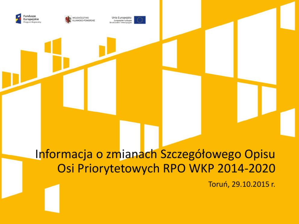 Informacja o zmianach Szczegółowego Opisu Osi Priorytetowych RPO WKP 2014-2020 Toruń, 29.10.2015 r. Oś priorytetowa 1 Wzmocnienie innowacyjności i konkurencyjności gospodarki regionu Działanie 1.1 W przypadku dzielenia projektu na część wykorzystywaną gospodarczo (objętą pomocą publiczną zgodnie ze schematem pomocy publicznej) i niegospodarczą (nieobjętą pomocą publiczna, finansowaną ze środków publicznych), część projektu przeznaczona do wykorzystania gospodarczego jest nie mniejsza niż 60 % wartości kosztów kwalifikowalnych projektu (przed zmianą było 80%). Poddziałanie 1.2.1 Punkt 19 Limity i ograniczenia w realizacji projektów W ramach poddziałania instytucje otoczenia biznesu mogą pozyskać wsparcie jako bezpośredni odbiorcy wsparcia (beneficjenci) jedynie w ramach typu projektu określonego w pkt 10.5. Przesunięto 6 mln euro z 1.3.1 do 1.2.1 Poddziałanie 1.3.1 wykreślono typ projektu Projekty grantowe zakładające wsparcie przedsiębiorstw odpryskowych poprzez udostępnienie wsparcia na: prowadzenie prac badawczorozwojowych,bony na patent. wykreślono typ beneficjenta instytucje otoczenia biznesu Oś priorytetowa 1 Wzmocnienie innowacyjności i konkurencyjności gospodarki regionu Poddziałanie 1.4.1, 1.4.2, 1.5.1, 1.6.1 i 1.6.2 Punkt 19 Limity i ograniczenia w realizacji projektów Inwestycje w zakresie produkcji i pierwszego etapu przetwórstwa produktów rolnych* są wykluczone ze wsparcia *Czynności dokonywane na produkcie rolnym objętym Załącznikiem I do Traktatu o funkcjonowaniu Unii Europejskiej, w wyniku których powstaje produkt będący produktem zawartym w ww. Załączniku. Poddziałanie 1.4.2 Usunięto typ projektu Wspólne przedsięwzięcia i tworzenie powiązań kooperacyjnych pomiędzy przedsiębiorstwami. Poddziałanie 1.5.3 wykreślono typ projektu Projekty grantowe wykreślono typ beneficjenta instytucje otoczenia biznesu Oś priorytetowa 3 Efektywność energetyczna i gospodarka niskoemisyjna w regionie Działanie 3.1 w pkt 19 Limity i ograniczenia dodano zapisy: W przypadku produkcji energii z biomasy lub biogazu: preferowane będą projekty, w których wykorzystywane surowce są produkowane lokalnie, w niewielkich odległościach w stosunku do miejsca wytwarzania energii, nie będą wspierane instalacje wykorzystujące do opalania drewno pełnowartościowe oraz zboże pełnowartościowe w rozumieniu art. 2 ustawy z dnia 20 lutego 2015 r. o odnawialnych źródłach energii (Dz. U. poz. 478), nie będą wspierane instalacje wykorzystujące współspalanie biomasy z węglem. Oś priorytetowa 3 Efektywność energetyczna i gospodarka niskoemisyjna w regionie Działanie 3.3 wykluczono ze wsparcia spółdzielnie mieszkaniowe oraz wspólnoty mieszkaniowe, które będą kwalifikowały się do otrzymania wsparcia w ramach POIiŚ w pkt 19 Limity i ograniczenia dodano informację, że wymiana źródeł ciepła tylko w połączeniu z termomodernizacją Warunkiem uzyskania wsparcia będzie konieczność zastosowania indywidualnych liczników ciepła, ciepłej wody oraz chłodu, o ile wynika to z przeprowadzonego audytu energetycznego. Montaż liczników nie jest obligatoryjny w przypadku, gdy nie jest to technicznie i ekonomicznie uzasadnione lub gdy budynek będący przedmiotem kompleksowej modernizacji energetycznej został uprzednio wyposażony w ww. urządzenia. Działanie 3.4 i poddziałanie 3.5.2 w pkt 19 Limity i ograniczenia dodano informację, że w miastach posiadających transport szynowy (tramwaje) preferowany będzie rozwój tej gałęzi transportu zbiorowego poprzez inwestycje w infrastrukturę szynową. Oś priorytetowa 4 Region przyjazny środowisku Działanie 4.4 W pkt 19 dodano informację, że na imprezy kulturalne przeznaczono maksymalnie 6 mln euro. Oś priorytetowa 5 Spójność wewnętrzna i dostępność zewnętrzna regionu Działanie 5.1 dodano informację o trybie konkursowym dla dróg wojewódzkich w miastach na prawach powiatu w oparciu o kryteria zawarte w Kujawsko-pomorskim planie spójności komunikacji drogowej i kolejowej. wskaźnik nośności drogi został rozdzielony na wskaźnik nośności drogi gminnej, wskaźnik nośności drogi powiatowej i wskaźnik nośności drogi wojewódzkiej, zgodnie z kategoriami dróg objętymi wsparciem w ramach RPO WK-P. Działanie 5.2 w punkcie 19 Limity i ograniczenia doprecyzowano, że priorytetowo traktowany będzie zakup pojazdów dostosowanych do potrzeb osób z niepełnosprawnościami i dysfunkcjami, a przedsięwzięcia muszą być ujęte w KPPSKDiK. Działanie 5.3 w punkcie 19 Limity i ograniczenia doprecyzowano, że przedsięwzięcia muszą być ujęte w KPPSKDiK. Dodano informację o trybie konkursowym w zakresie inwestycji punktowych przeznaczonych do obsługi transportu pasażerskiego Oś priorytetowa 6 Solidarne społeczeństwo i konkurencyjne kadry Poddziałanie 6.3.2 w punkcie 19 Limity i ograniczenia doprecyzowano, że Inwestycje w infrastrukturę wyższych szkół zawodowych mogą być realizowane pod warunkiem wcześniejszego uzyskania dla planowanego do realizacji przedsięwzięcia pozytywnej opinii Ministerstwa Nauki i Szkolnictwa Wyższego. Oś priorytetowa 7 Rozwój lokalny kierowany przez społeczność Działanie 7.1 Punkt 19 Limity i ograniczenia w realizacji projektów Dodano informację, że realizowane przedsięwzięcia muszą wynikać i być powiązane ze zrealizowanymi, realizowanymi lub planowanymi do realizacji działaniami objętymi wsparciem EFS w ramach osi priorytetowej 11. Inwestycje w zakresie produkcji i pierwszego etapu przetwórstwa produktów rolnych* są wykluczone ze wsparcia *Czynności dokonywane na produkcie rolnym objętym Załącznikiem I do Traktatu o funkcjonowaniu Unii Europejskiej, w wyniku których powstaje produkt będący produktem zawartym w ww. Załączniku. Projekty z zakresu wsparcia mikro i małych przedsiębiorstw będą realizowane wyłącznie w formie projektów grantowych Oś priorytetowa 9 Solidarne sp