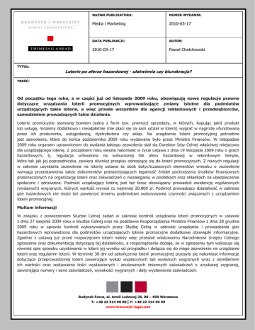 NAZWA PUBLIKATORA: NUMER WYDANIA: Media i Marketing 2010-03-17 DATA PUBLIKACJI: AUTOR: 2010-03-17 Paweł Chełchowski TYTUŁ: Loterie po aferze hazardowej - ułatwienia czy biurokracja? TREŚĆ: Od początku tego roku, a w części już od listopada 2009 roku, obowiązują nowe regulacje prawne dotyczące urządzania loterii promocyjnych wprowadzające zmiany istotne dla podmiotów urządzających takie loterie, a więc przede wszystkim dla agencji reklamowych i przedsiębiorców, samodzielnie prowadzących takie działania. Loterie promocyjne stanowią bowiem jedną z form tzw. promocji sprzedaży, w których, kupując jakiś produkt lub usługę, możemy dodatkowo i nieodpłatnie (nie płaci się za sam udział w loterii) wygrać w nagrodę ufundowaną przez ich producenta, usługodawcę, dystrybutora czy sklep. Na urządzenie loterii promocyjnej potrzebne jest zezwolenie, które do końca października 2009 roku wydawane było przez Ministra Finansów. W listopadzie 2009 roku organem uprawnionym do wydania takiego zezwolenia stał się Dyrektor Izby Celnej właściwej miejscowo dla urządzającego loterię. Z początkiem roku weszła natomiast w życie ustawa z dnia 19 listopada 2009 roku o grach hazardowych, tj. regulacja uchwalona na wzburzonej fali afery hazardowej w rekordowym tempie, która tak jak jej poprzedniczka, zawiera również przepisy odnoszące się do loterii promocyjnych. Z nowych regulacji w zakresie uzyskania zezwolenia na loterię ustawa ta obok dotychczasowych elementów wniosku o zezwolenie wymaga przedstawienia także dokumentów potwierdzających legalność źródeł pochodzenia środków finansowych przeznaczonych na organizację loterii oraz zaświadczeń o niezaleganiu w podatkach oraz składkach na ubezpieczenie społeczne i zdrowotne. Podmiot urządzający loterię jest też teraz obowiązany prowadzić ewidencję wypłaconych (wydanych) wygranych, których wartość wynosi co najmniej 20.000 zł. Podmiot prowadzący działalność w zakresie gier hazardowych nie może też powierzyć innemu podmiotowi wykonywania czynności związanych z urządzaniem loterii promocyjnej. Multum informacji W związku z powierzeniem Służbie Celnej zadań w zakresie kontroli urządzania loterii promocyjnych w ustawie z dnia 27 sierpnia 2009 roku o Służbie Celnej oraz na podstawie Rozporządzenia Ministra Finansów z dnia 28 grudnia 2009 roku w sprawie kontroli wykonywanych przez Służbę Celną w zakresie urządzania i prowadzenia gier hazardowych wprowadzono dla podmiotów urządzających loterie promocyjne dodatkowe obowiązki informacyjne. Zgodnie z ustawą już przed rozpoczęciem loterii należy więc przesłać właściwemu Naczelnikowi Urzędu Celnego zgłoszenie oraz dokumentację dotyczącą tej działalności, a rozporządzenie dodaje, że w zgłoszeniu tym wskazuje się również opis sposobu uzyskiwania w loterii jej wyniku od przypadku i dołącza się do niego zezwolenie na urządzanie loterii oraz regulamin loterii. W terminie 30 dni od zakończenia loterii promocyjnej przesyła się natomiast informacje dotyczące przeprowadzonej loterii zawierające wykaz wypłaconych lub wydanych wygranych wraz z określeniem ich wartości oraz zestawienie ilości wystawionych i anulowanych imiennych zaświadczeń o uzyskanej wygranej, zawierające numery i serie zaświadczeń, wysokości wygranych i daty wystawienia zaświadczeń. Budynek Focus, al. Armii Ludowej 26, 00 – 609 Warszawa T: +48 22 314 90 00 | F: +48 22 314 90 99 www.krawczyk-legal.com Multum informacji W związku z powierzeniem Służbie Celnej zadań w zakresie kontroli urządzania loterii promocyjnych w ustawie z dnia 27 sierpnia 2009 roku o Służbie Celnej oraz na podstawie Rozporządzenia Ministra Finansów z dnia 28 grudnia 2009 roku w sprawie kontroli wykonywanych przez Służbę Celną w zakresie urządzania i prowadzenia gier hazardowych wprowadzono dla podmiotów urządzających loterie promocyjne dodatkowe obowiązki informacyjne. Zgodnie z ustawą już przed rozpoczęciem loterii należy więc przesłać właściwemu Naczelnikowi Urzędu Celnego zgłoszenie oraz dokumentację dotyczącą tej działalności, a rozporządzenie dodaje, że w zgłoszeniu tym wskazuje się również opis sposobu uzyskiwania w loterii jej wyniku od przypadku i dołącza się do niego zezwolenie na urządzanie loterii oraz regulamin loterii. W terminie 30 dni od zakończenia loterii promocyjnej przesyła się natomiast informacje dotyczące przeprowadzonej loterii zawierające wykaz wypłaconych lub wydanych wygranych wraz z określeniem ich wartości oraz zestawienie ilości wystawionych i anulowanych imiennych zaświadczeń o uzyskanej wygranej, zawierające numery i serie zaświadczeń, wysokości wygranych i daty wystawienia zaświadczeń. Ustawodawca na fali wszechobecnego potępienia hazardu zdecydował się więc na zaostrzenie wymogów prowadzenia tej formy promocji sprzedaży. Wobec specyfiki loterii promocyjnych wyrażającej się przede wszystkim w tym, że ani jej uczestnicy nie ponoszą dodatkowych kosztów udziału w loterii, ani podmiot urządzający loterię nie osiąga dochodów z hazardu, zasadność takich rozwiązań wydaje się jednak wątpliwa, a staje się dodatkową biurokratyczną przeszkodą dla przedsiębiorców, których podstawowa działalność nie jest wcale związana z hazardem. Pomimo powyższej krytyki, nie można jednak oceniać wyłącznie negatywnie wszystkich wprowadzonych zmian. Krokiem w dobrą stronę jest więc powierzenie wydawania zezwoleń Dyrektorom Izby Celnych, co w dłuższej perspektywie powinno wpłynąć na usprawnienie wydawania zezwoleń na loterie obejmujące swoim zasięgiem większy obszar. Zezwolenia takie będą dostępne bliżej wnioskodawcy, a nie jak dotychczas wydawane wyłącznie w Warszawie (przez Ministra Finansów). W praktyce musi upłynąć jeszcze trochę czasu zanim wytworzy się jednolita praktyka stosowania tych przepisów. Budynek Focus, al