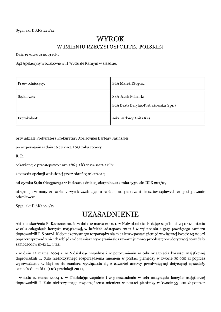 Sygn. akt II AKa 221/12 WYROK W IMIENIU RZECZYPOSPOLITEJ POLSKIEJ Dnia 19 czerwca 2013 roku Sąd Apelacyjny w Krakowie w II Wydziale Karnym w składzie: Przewodniczący: SSA Marek Długosz Sędziowie: SSA Jacek Polański SSA Beata Barylak-Pietrzkowska (spr.) Protokolant: sekr. sądowy Anita Kus przy udziale Prokuratora Prokuratury Apelacyjnej Barbary Jasińskiej po rozpoznaniu w dniu 19 czerwca 2013 roku sprawy R. R. oskarżonej o przestępstwo z art. 286 § 1 kk w zw. z art. 12 kk z powodu apelacji wniesionej przez obrońcę oskarżonej od wyroku Sądu Okręgowego w Kielcach z dnia 23 sierpnia 2012 roku sygn. akt III K 229/09 utrzymuje w mocy zaskarżony wyrok zwalniając oskarżoną od ponoszenia kosztów sądowych za postępowanie odwoławcze. Sygn. akt II AKa 221/12 UZASADNIENIE Aktem oskarżenia R. R.zarzucono, że w dniu 12 marca 2004 r. w N.dwukrotnie działając wspólnie i w porozumieniu w celu osiągnięcia korzyści majątkowej, w krótkich odstępach czasu i w wykonaniu z góry powziętego zamiaru doprowadzili T. S.oraz J. K.do niekorzystnego rozporządzenia mieniem w postaci pieniędzy w łącznej kwocie 63.000 zł poprzez wprowadzenie ich w błąd co do zamiaru wywiązania się z zawartej umowy przedwstępnej dotyczącej sprzedaży samochodów m-ki (...)i tak: - w dniu 12 marca 2004 r. w N.działając wspólnie i w porozumieniu w celu osiągnięcia korzyści majątkowej doprowadzili T. S.do niekorzystnego rozporządzenia mieniem w postaci pieniędzy w kwocie 30.000 zł poprzez wprowadzenie w błąd co do zamiaru wywiązania się z zawartej umowy przedwstępnej dotyczącej sprzedaży samochodu m-ki (...) rok produkcji 2000, - w dniu 12 marca 2004 r. w N.działając wspólnie i w porozumieniu w celu osiągnięcia korzyści majątkowej doprowadzili J. K.do niekorzystnego rozporządzenia mieniem w postaci pieniędzy w kwocie 33.000 zł poprzez wprowadzenie w błąd co do zamiaru wywiązania się z zawartej umowy przedwstępnej dotyczącej sprzedaży samochodu m-ki (...) rok produkcji 2000, tj. popełnienie przestępstwa z art. 286 § 1 kk w zw. z art. 12 kk Wyrokiem z dnia 23 sierpnia 2012 roku sygn. akt III K 229/09 Sąd Okręgowy w Kielcach uznał oskarżoną R. R.w ramach zarzucanego jej aktem oskarżenia czynu za winną tego, że w okresie od 12 marca 2004 roku do 31 marca 2004 roku w N.i K.działając wspólnie i w porozumieniu z ustaloną osobą, co do której wyłączono materiały do odrębnego rozpoznania, w celu osiągnięcia korzyści majątkowej w ramach prowadzonej działalności gospodarczej Towarzystwo (...)w K.ul. (...), doprowadziła do niekorzystnego rozporządzenia mieniem: T. S.w postaci pieniędzy w kwocie 30 000 złotych po uprzednim wprowadzeniu w błąd co do zamiaru wywiązania się z zawartej 12 marca 2004 roku umowy przedwstępnej dotyczącej sprzedaży samochodu marki (...)i J. K.w postaci pieniędzy w kwocie 33 000 złotych po uprzednim wprowadzeniu w błąd co do zamiaru wywiązania się z zawartej 12 marca 2004 roku umowy przedwstępnej dotyczącej sprzedaży samochodu marki (...). Czyn ten Sąd Okręgowy zakwalifikował jako przestępstwo z art. 286 § 1 kk i na podstawie art. 286 § 1 kk wymierzył oskarżonej karę 1 roku pozbawienia wolności. Na mocy art. 46 § 1 kk orzeczono wobec oskarżonej R. R.środek karny w postaci obowiązku naprawienia wyrządzonej przestępstwem szkody w części przez zapłatę na rzecz J. K.kwoty 33 000 złotych, Zasądzono od oskarżonej R. R. na rzecz Skarbu Państwa koszty sądowe w części, a w pozostałym zakresie zwolniono oskarżoną od ich ponoszenia. Od powyższego wyroku apelację złożył obrońca oskarżonej, który na zasadzie art. 444 kpk zaskarżył go w całości na korzyść oskarżonej R. R. i w oparciu o 438 pkt 2, 3, 4 k.p.k. zarzucił: 1. błąd w ustaleniach faktycznych polegający na mylnym przyjęciu, iż oskarżona dopuściła się występków z art. 286 § 1 k.k.; 2. obrazę przepisów postępowania mającą wpływ na treść wyroku, a mianowicie: a) art. 424 § 1 kpk, art. 410 kpk, art. 5 kpk, art. 7 kpk, art. 4 kpk, art. 2 § 2 kpk, art. 366 § 1 kpk, polegające na: 1) wydaniu orzeczenia wyłącznie na podstawie dowodów dla oskarżonej niekorzystnych oraz pozostawieniu poza podstawą orzeczenia szeregu istotnych wynikających ze zgromadzonych dowodów okoliczności faktycznych sprawy przemawiających za tym, iż oskarżona nie dopuściła się zarzucanych jej występków, bez należytego umotywowania takiego stanowiska w uzasadnieniu zaskarżonego wyroku, 2) całkowicie arbitralnym, nie znajdującym potwierdzenia w materiale dowodowym sprawy − opartym na niezasadnych domniemaniach − przyjęciu, iż oskarżona działała umyślnie (uzasadnienie wyroku pozbawione jest jakichkolwiek rozważań na temat zamiaru oskarżonej oraz dowodów, które wskazywałyby na istnienie elementów podmiotowych, pozwalających na przypisanie oskarżonej odpowiedzialności za występki z art. 286 § 1 kk), 3) rozstrzyganiu nie dającym się usunąć wątpliwości na niekorzyść oskarżonej, 4) dokonaniu oceny dowodów w sposób dowolny, z pominięciem zasad prawidłowego rozumowania oraz wskazań wiedzy i doświadczenia życiowego, 5) niewyjaśnieniu okoliczności faktycznych mających znaczenie dla rozstrzygnięcia sprawy i zastąpienie inicjatywy dowodowej ustaleniami opartymi na niekorzystnych dla oskarżonej domniemaniach, b) art. 6 kpk w związku z art. 406 kpk poprzez nieuwzględnienie przez Sąd wniosku obrońcy będącego realizacją woli oskarżonej w kwestii umożliwienia jej wzięcia udziału w głosach stron w innym terminie i tym samym pozbawienie jej prawa do obrony, c) art. 6 kpk poprzez niewezwanie ponownie świadków przesłuchiwanych pod nieobecność oskarżonej i w związku z tym pozbawienie jej możliwości realizacji prawa do obrony w sensie materialnym oraz poprzez niewskazanie podstawy prawnej przez Sąd I instancji w oparciu, o którą oddalono wniosek (k.1002) i niesporząd