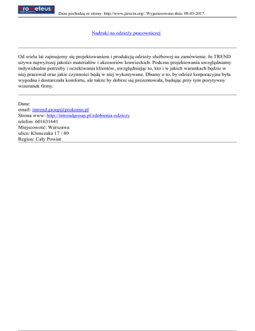 Dane pochodzą ze strony: http://www.jarocin.org/. Wygenerowano dnia: 08-03-2017. Nadruki na odzieży pracowniczej Od wielu lat zajmujemy się projektowaniem i produkcją odzieży służbowej na zamówienie. In TREND używa najwyższej jakości materiałów i akcesoriów krawieckich. Podczas projektowania uwzględniamy indywidualne potrzeby i oczekiwania klientów, uwzględniając to, kto i w jakich warunkach będzie w niej pracował oraz jakie czynności będą w niej wykonywane. Dbamy o to, by odzież korporacyjna była wygodna i dostarczała komfortu, ale także by dobrze się prezentowała, budując przy tym pozytywny wizerunek firmy. Dane: email: [email protected] Strona www: http://intrendgroup.pl/zdobienia-odziezy telefon: 601631641 Miejscowość: Warszawa ulica: Klimczaka 17 / 80 Region: Cały Powiat