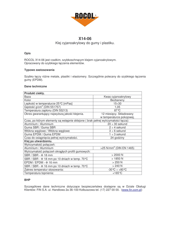 X14-06 Klej cyjanoakrylowy do gumy i plastiku. Opis ROCOL X14-06 jest rzadkim, szybkoschn cym klejem cyjanoakrylowym. Opracowany do szybkiego ł czenia elementów. Typowe zastosowania Szybko ł czy ró ne metale, plastiki i elastomery. Szczególnie polecany do szybkiego ł czenia gumy (EPDM). Dane techniczne Produkt ciekły. Baza Kolor Lepko w temperaturze 25°C [mPas] G sto g/cm3 (DIN 551757) Temperatura zapłonu (DIN 55213) Okres gwarantuj cy najwy sz jako klejenia. Kwas cyjanoakrylowy Bezbarwny 15÷30 1,05 87°C 12 miesi cy. Składowany w temperaturze pokojowej. Czas, po którym elementy s wst pnie sklejone ( brak pełnej wytrzymało ci ł cza): Aluminium / Aluminium 20 ÷ 30 sekund Guma SBR / Guma SBR 2 ÷ 4 sekund Włókna w glowe / Włókna w glowe 3 ÷ 6 sekund Guma EPDM / Guma EPDM 1 ÷ 3 sekund Czas do osi gni cia pełnej wytrzymało ci. 24 godziny Klej po utwardzeniu. Wytrzymało poł cze : Aluminium / Aluminium >25 N/mm2 (DIN EN 1465) Wytrzymało poł cze okr głych profili gumowych: > 2000 N SBR / SBR - Φ 18 mm > 1850 N SBR / SBR - Φ 18 mm po 10 dniach w temp. 70°C > 250 N EPDM / EPDM - Φ 16 mm > 240 N SBR / SBR - Φ 16 mm po 10 dniach w temp. 70°C Zakres temperatur stosowania: -30°C ÷ +80°C Temperatura topnienia: +165°C BHP Szczegółowe dane techniczne dotycz ce bezpiecze stwa dost pne s w Dziale Obsługi Klientów: FIN S.A. ul. Handlowa 2a 36-100 Kolbuszowa tel. (17) 227 00 00. (www.fin.com.pl)