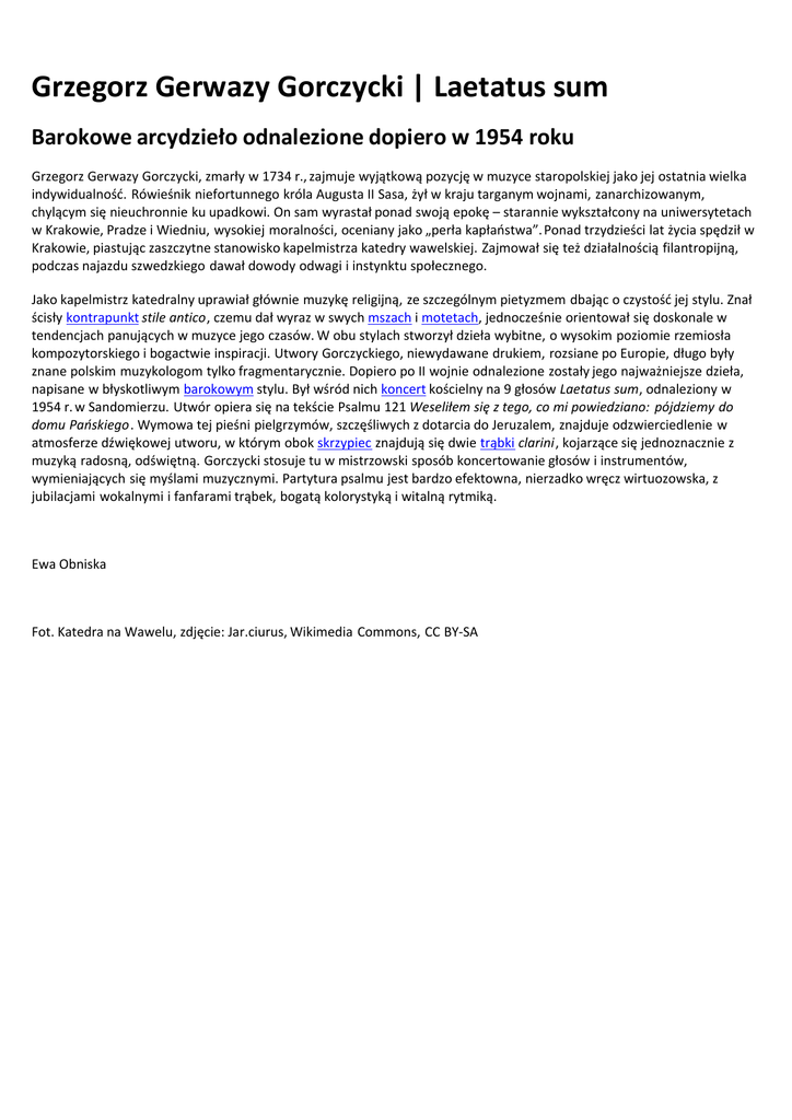 Grzegorz Gerwazy Gorczycki | Laetatus sum Barokowe arcydzieło odnalezione dopiero w 1954 roku Grzegorz Gerwazy Gorczycki, zmarły w 1734 r., zajmuje wyjątkową pozycję w muzyce staropolskiej jako jej ostatnia wielka indywidualność. Rówieśnik niefortunnego króla Augusta II Sasa, żył w kraju targanym wojnami, zanarchizowanym, chylącym się nieuchronnie ku upadkowi. On sam wyrastał ponad swoją epokę – starannie wykształcony na uniwersytetach w Krakowie, Pradze i Wiedniu, wysokiej moralności, oceniany jako „perła kapłaństwa”. Ponad trzydzieści lat życia spędził w Krakowie, piastując zaszczytne stanowisko kapelmistrza katedry wawelskiej. Zajmował się też działalnością filantropijną, podczas najazdu szwedzkiego dawał dowody odwagi i instynktu społecznego. Jako kapelmistrz katedralny uprawiał głównie muzykę religijną, ze szczególnym pietyzmem dbając o czystość jej stylu. Znał ścisły kontrapunkt stile antico, czemu dał wyraz w swych mszach i motetach, jednocześnie orientował się doskonale w tendencjach panujących w muzyce jego czasów. W obu stylach stworzył dzieła wybitne, o wysokim poziomie rzemiosła kompozytorskiego i bogactwie inspiracji. Utwory Gorczyckiego, niewydawane drukiem, rozsiane po Europie, długo były znane polskim muzykologom tylko fragmentarycznie. Dopiero po II wojnie odnalezione zostały jego najważniejsze dzieła, napisane w błyskotliwym barokowym stylu. Był wśród nich koncert kościelny na 9 głosów Laetatus sum, odnaleziony w 1954 r. w Sandomierzu. Utwór opiera się na tekście Psalmu 121 Weseliłem się z tego, co mi powiedziano: pójdziemy do domu Pańskiego. Wymowa tej pieśni pielgrzymów, szczęśliwych z dotarcia do Jeruzalem, znajduje odzwierciedlenie w atmosferze dźwiękowej utworu, w którym obok skrzypiec znajdują się dwie trąbki clarini, kojarzące się jednoznacznie z muzyką radosną, odświętną. Gorczycki stosuje tu w mistrzowski sposób koncertowanie głosów i instrumentów, wymieniających się myślami muzycznymi. Partytura psalmu jest bardzo efektowna, nierzadko wręcz wirtuozowska, z jubilacjami wokalnymi i fanfarami trąbek, bogatą kolorystyką i witalną rytmiką. Ewa Obniska Fot. Katedra na Wawelu, zdjęcie: Jar.ciurus, Wikimedia Commons, CC BY-SA