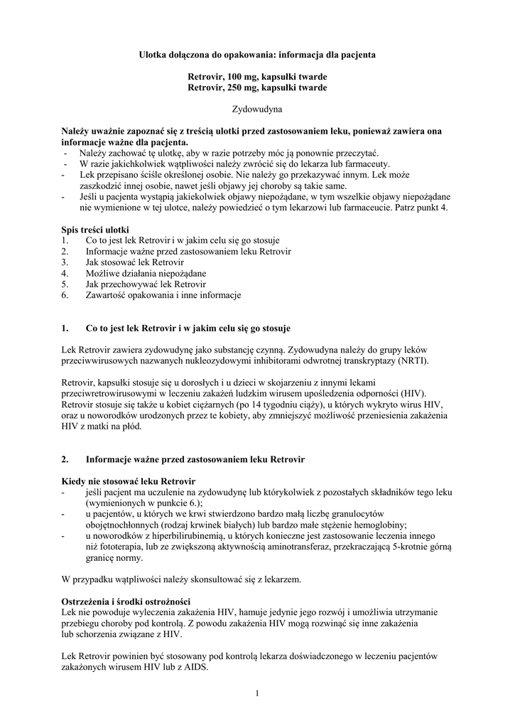 Ulotka dołączona do opakowania: informacja dla pacjenta Retrovir, 100 mg, kapsułki twarde Retrovir, 250 mg, kapsułki twarde Zydowudyna Należy uważnie zapoznać się z treścią ulotki przed zastosowaniem leku, ponieważ zawiera ona informacje ważne dla pacjenta. - Należy zachować tę ulotkę, aby w razie potrzeby móc ją ponownie przeczytać. - W razie jakichkolwiek wątpliwości należy zwrócić się do lekarza lub farmaceuty. Lek przepisano ściśle określonej osobie. Nie należy go przekazywać innym. Lek może zaszkodzić innej osobie, nawet jeśli objawy jej choroby są takie same. Jeśli u pacjenta wystąpią jakiekolwiek objawy niepożądane, w tym wszelkie objawy niepożądane nie wymienione w tej ulotce, należy powiedzieć o tym lekarzowi lub farmaceucie. Patrz punkt 4. Spis treści ulotki 1. Co to jest lek Retrovir i w jakim celu się go stosuje 2. Informacje ważne przed zastosowaniem leku Retrovir 3. Jak stosować lek Retrovir 4. Możliwe działania niepożądane 5. Jak przechowywać lek Retrovir 6. Zawartość opakowania i inne informacje 1. Co to jest lek Retrovir i w jakim celu się go stosuje Lek Retrovir zawiera zydowudynę jako substancję czynną. Zydowudyna należy do grupy leków przeciwwirusowych nazwanych nukleozydowymi inhibitorami odwrotnej transkryptazy (NRTI). Retrovir, kapsułki stosuje się u dorosłych i u dzieci w skojarzeniu z innymi lekami przeciwretrowirusowymi w leczeniu zakażeń ludzkim wirusem upośledzenia odporności (HIV). Retrovir stosuje się także u kobiet ciężarnych (po 14 tygodniu ciąży), u których wykryto wirus HIV, oraz u noworodków urodzonych przez te kobiety, aby zmniejszyć możliwość przeniesienia zakażenia HIV z matki na płód. 2. Informacje ważne przed zastosowaniem leku Retrovir Kiedy nie stosować leku Retrovir jeśli pacjent ma uczulenie na zydowudynę lub którykolwiek z pozostałych składników tego leku (wymienionych w punkcie 6.); u pacjentów, u których we krwi stwierdzono bardzo małą liczbę granulocytów obojętnochłonnych (rodzaj krwinek białych) lub bardzo małe stężenie hemoglobiny; u noworodków z hiperbilirubinemią, u których konieczne jest zastosowanie leczenia innego niż fototerapia, lub ze zwiększoną aktywnością aminotransferaz, przekraczającą 5-krotnie górną granicę normy. W przypadku wątpliwości należy skonsultować się z lekarzem. Ostrzeżenia i środki ostrożności Lek nie powoduje wyleczenia zakażenia HIV, hamuje jedynie jego rozwój i umożliwia utrzymanie przebiegu choroby pod kontrolą. Z powodu zakażenia HIV mogą rozwinąć się inne zakażenia lub schorzenia związane z HIV. Lek Retrovir powinien być stosowany pod kontrolą lekarza doświadczonego w leczeniu pacjentów zakażonych wirusem HIV lub z AIDS. 1 Retrovir należy przyjmować codziennie. Należy regularnie kontaktować się z lekarzem prowadzącym leczenie. Nie należy przerywać przyjmowania leku bez wcześniejszej konsultacji z lekarzem. Przeniesienie wirusa HIV z matki na dziecko u kobiet w ciąży może nastąpić pomimo stosowania leku w celu zapobieżenia takiemu przeniesieniu. Niedokrwistość i neutropenia Zydowudyna może wpływać na powstawanie czerwonych krwinek, prowadząc do niedokrwistości. Główne objawy takiego stanu to uczucie zmęczenia i skrócenie oddechu. Rzadziej występuje u pacjentów zmniejszenie powstawania pewnego rodzaju białych krwinek, co może spowodować zwiększoną podatność na zakażenia. Lekarz prowadzący może zalecić wykonywanie okresowych badań krwi w celu kontrolowania liczby niektórych krwinek. Zmiany te zazwyczaj są przemijające. Stosowanie leku Retrovir razem z rybawiryną może wywoływać lub nasilać istniejącą niedokrwistość. Jeśli u pacjenta wystąpią objawy niedokrwistości (takie jak zmęczenie i skrócenie oddechu), należy skontaktować się z lekarzem, który zdecyduje czy należy zaprzestać stosowania leku Retrovir. Kwasica mleczanowa Grupa leków, do których należy Retrovir (NRTI) może wywoływać stan zwany kwasicą mleczanową. Kwasica mleczanowa, jeżeli wystąpi, to zazwyczaj rozwija się po kilku miesiącach leczenia. Głębokie, szybkie oddechy, senność i inne niespecyficzne objawy, takie jak nudności, wymioty, ból brzucha, mogą wskazywać na rozwój kwasicy mleczanowej. To rzadkie, ale ciężkie działanie niepożądane występuje częściej u kobiet, zwłaszcza z dużą nadwagą. Choroby wątroby, szczególnie powiększenie wątroby, zapalenie wątroby i stłuszczenie wątroby, mogą również zwiększać ryzyko wystąpienia tego stanu. Podczas stosowania leku Retrovir lekarz prowadzący będzie ściśle kontrolował stan pacjenta, aby wykryć wszelkie objawy, które mogą świadczyć o rozwoju kwasicy mleczanowej. Rozmieszczenie tkanki tłuszczowej Zmiana rozmieszczenia, gromadzenie się lub utrata tkanki tłuszczowej ciała mogą wystąpić u pacjentów poddawanych skojarzonemu leczeniu przeciwretrowirusowemu. Jeśli u pacjenta wystąpią zmiany dotyczące tkanki tłuszczowej, należy skontaktować się z lekarzem (patrz punkt: „Możliwe działania niepożądane”). Choroby wątroby (zapalenie wątroby) Jeśli u pacjenta w przeszłości występowały choroby wątroby, należy porozmawiać z lekarzem. U pacjentów z przewlekłym wirusowym zapaleniem wątroby typu B lub C, leczonych lekami przeciwretrowirusowymi, może wystąpić zwiększone ryzyko ciężkich i stanowiących potencjalne zagrożenie dla życia objawów niepożądanych ze strony wątroby i może być konieczne przeprowadzenie badań krwi w celu kontrolowania czynności wątroby. Zespół reaktywacji immunologicznej U niektórych pacjentów w zaawansowanym stadium zakażenia HIV (AIDS), u których w przeszłości występowało zakażenie oportunistyczne, objawy przedmiotowe i podmiotowe stanu zapalnego spowodowanego wcześniejszym zakażeniem mogą pojawić się wkrótce po rozpoczęciu leczenia antyHIV. Uważa się, że objawy te wynikają