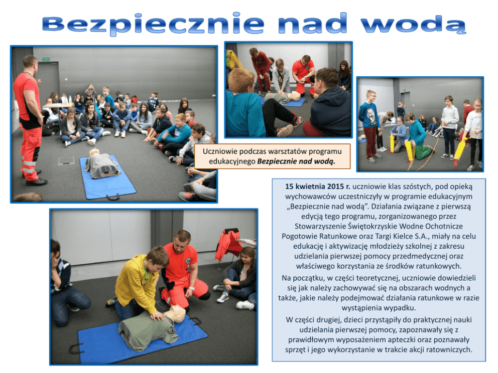Uczniowie podczas warsztatów programu edukacyjnego Bezpiecznie nad wodą. 15 kwietnia 2015 r. uczniowie klas szóstych, pod opieką wychowawców uczestniczyły w programie edukacyjnym „Bezpiecznie nad wodą”. Działania związane z pierwszą edycją tego programu, zorganizowanego przez Stowarzyszenie Świętokrzyskie Wodne Ochotnicze Pogotowie Ratunkowe oraz Targi Kielce S.A., miały na celu edukację i aktywizację młodzieży szkolnej z zakresu udzielania pierwszej pomocy przedmedycznej oraz właściwego korzystania ze środków ratunkowych. Na początku, w części teoretycznej, uczniowie dowiedzieli się jak należy zachowywad się na obszarach wodnych a także, jakie należy podejmowad działania ratunkowe w razie wystąpienia wypadku. W części drugiej, dzieci przystąpiły do praktycznej nauki udzielania pierwszej pomocy, zapoznawały się z prawidłowym wyposażeniem apteczki oraz poznawały sprzęt i jego wykorzystanie w trakcie akcji ratowniczych.