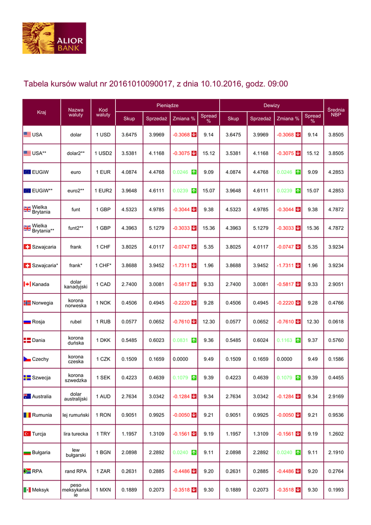 Tabela kursów walut nr 20161010090017, z dnia 10.10.2016, godz. 09:00 Nazwa waluty Kod waluty dolar USA** EUGiW Kraj Pieniądze Spread % Skup Sprzedaż Średnia NBP Sprzedaż 1 USD 3.6475 3.9969 -0.3068 9.14 3.6475 3.9969 -0.3068 9.14 3.8505 dolar2** 1 USD2 3.5381 4.1168 -0.3075 15.12 3.5381 4.1168 -0.3075 15.12 3.8505 euro 1 EUR 4.0874 4.4768 0.0246 9.09 4.0874 4.4768 0.0246 9.09 4.2853 EUGiW** euro2** 1 EUR2 3.9648 4.6111 0.0239 15.07 3.9648 4.6111 0.0239 15.07 4.2853 Wielka Brytania funt 1 GBP 4.5323 4.9785 -0.3044 9.38 4.5323 4.9785 -0.3044 9.38 4.7872 Wielka Brytania** funt2** 1 GBP 4.3963 5.1279 -0.3033 15.36 4.3963 5.1279 -0.3033 15.36 4.7872 Szwajcaria frank 1 CHF 3.8025 4.0117 -0.0747 5.35 3.8025 4.0117 -0.0747 5.35 3.9234 Szwajcaria* frank* 1 CHF* 3.8688 3.9452 -1.7311 1.96 3.8688 3.9452 -1.7311 1.96 3.9234 Kanada dolar kanadyjski 1 CAD 2.7400 3.0081 -0.5817 9.33 2.7400 3.0081 -0.5817 9.33 2.9051 Norwegia korona norweska 1 NOK 0.4506 0.4945 -0.2220 9.28 0.4506 0.4945 -0.2220 9.28 0.4766 Rosja rubel 1 RUB 0.0577 0.0652 -0.7610 12.30 0.0577 0.0652 -0.7610 12.30 0.0618 Dania korona duńska 1 DKK 0.5485 0.6023 0.0831 9.36 0.5485 0.6024 0.1163 9.37 0.5760 Czechy korona czeska 1 CZK 0.1509 0.1659 0.0000 9.49 0.1509 0.1659 0.0000 9.49 0.1586 Szwecja korona szwedzka 1 SEK 0.4223 0.4639 0.1079 9.39 0.4223 0.4639 0.1079 9.39 0.4455 Australia dolar australijski 1 AUD 2.7634 3.0342 -0.1284 9.34 2.7634 3.0342 -0.1284 9.34 2.9169 Rumunia lej rumuński 1 RON 0.9051 0.9925 -0.0050 9.21 0.9051 0.9925 -0.0050 9.21 0.9536 Turcja lira turecka 1 TRY 1.1957 1.3109 -0.1561 9.19 1.1957 1.3109 -0.1561 9.19 1.2602 Bułgaria lew bułgarski 1 BGN 2.0898 2.2892 0.0240 9.11 2.0898 2.2892 0.0240 9.11 2.1910 RPA rand RPA 1 ZAR 0.2631 0.2885 -0.4486 9.20 0.2631 0.2885 -0.4486 9.20 0.2764 peso meksykańsk ie 1 MXN 0.1889 0.2073 -0.3518 9.30 0.1889 0.2073 -0.3518 9.30 0.1993 Meksyk Zmiana % Spread % Skup USA Zmiana % Dewizy Japonia Węgry jen 100 JPY 3.5413 3.8895 0.1287 9.37 3.5413 3.8895 0.1287 9.37 3.7080 forint 100 HUF 1.3406 1.4713 -0.1764 9.30 1.3406 1.4713 -0.1764 9.30 1.4084 Informacja o kursach walutowych stosowanych przez MasterCard - przejdź na stronę MasterCard. Zasady zmieniania i ustalania kursów walut - pobierz PDF Ważne: Spread to wyrażona procentowo różnica pomiędzy kursem sprzedaży a kursem zakupu waluty obcej ogłaszanym przez Bank w tabeli kursów walut, wyliczany według wzoru: Spread = (kurs sprzedaży waluty - kurs kupna waluty) / [0,5*(kurs sprzedaży waluty + kurs kupna waluty)] *100%). Zmiana procentowa oznacza zmianę kursu sprzedaży liczoną względem ostatniego kursu z poprzedniego dnia roboczego. Kursy walut mogą być prezentowane z maksymalnie 30 minutowym opóźnieniem w stosunku do kursów transakcyjnych w systemach Banku. Dla walut AUD, CAD, CHF, CZK, DKK, NOK, RUB, SEK, RON, TRY, BGN, ZAR, MXN, HUF, JPY, Alior Bank obecnie nie prowadzi obsługi gotówkowej. * dotyczy transakcji w ramach Konta oszczędnościowego KANTOR ** dotyczy płatności bezgotówkowych realizowanych kartami klientów indywidualnych *** dotyczy płatności bezgotówkowych realizowanych kartami klientów biznesowych