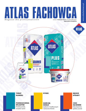 ATLAS FACHOWCA Magazyn dla profesjonalistów numer 2 kwiecień 2014 (13) ISSN 2084-0241 Egzemplarz bezpłatny TEMAT NUMERU RYNEK MĘSKIE SPRAWY POMIESZCZENIA WILGOTNE DUŻO SIĘ DZIAŁO CZAS NA ROWER Produkty, porady, narzędzia i opinie Spotkanie Certyfikowanych Fachowców ATLASA Rady ekspertów, gadżety, wywiad ATLAS ELASTYK KLEJE DO PŁYTEK KLEJ WYSOKOELASTYCZNY 2-10 mm ATLAS ELASTYK Klej Wysokoelastyczny 2-10 mm Zeskanuj i sprawdź szczegóły promocji www.atlasfachowca.pl/promocja-elastyk TYLKO ATLAS! SPODNIE GRATIS 6x ZA 6 KODÓW KRESKOWYCH W NIEBIESKIEJ RAMCE (promocja dotyczy obecnego i nowego opakowania) O szczegóły pytaj Przedstawicieli Handlowych ATLAS Promocja trwa od 1 maja 2014r. do wyczerpania zapasów Regulamin promocji oraz lista Przedstawicieli Handlowych ATLAS dostępna pod adresem: www.atlasfachowca.pl/promocja-elastyk TERAZ dodatkowe 10 punktów Extra w PROGRAMIE FACHOWIEC Promocja trwa do 30 listopada 2014r. Regulamin promocji: www.programfachowiec.pl ATLAS WSPIERA FACHOWCÓW OD REDAKCJI Sezon na wiosnę W tym numerze wstęp będzie wyjątkowo krótki i konkretny. Zbliża się gorący sezon budowlany, a co się z tym wiąże, okres „braku czasu na wszystko” – na przyjemności, na hobby, na rodzinę. Mam tylko nadzieję, że znajdziecie go trochę na przeczytanie tematów tego numeru. Polecam szczególnie artykuły poświęcone pomieszczeniom wilgotnym, a także relacje z imprez branżowych, na których miałam okazję być: z BUDMY 2014 oraz spotkania Certyfikowanych Wykonawców ATLASA. W wiosennym numerze, jak zawsze sporo nowości produktowych i konkursów – m.in. wracamy do zapytań czytelników związanych z farbami wewnętrznymi ATLASA oraz zapraszamy do konkursu Graco-ATLASA. Redaktor naczelna Anna Durajska SPROSTOWANIE W numerze 1/2014 „ATLASA fachowca”, na stronie numer 66, zostało zamieszczone niewłaściwe zdjęcie produktu firmy Teoklin – system szybkiego poziomowania płytek. Redakcja pragnie przeprosić za powstały błąd właścicieli firmy Teoklin oraz Czytelników magazynu. Oliwka RYNEK Rozwiązanie konkursów TEST NA SPOSTRZEGAWCZOŚĆ Brodzik i MONTA Ż PŁYT Do mon Y BRODZIK tażu płyty OWEJ i związan brodzikow iu uzup ej może ełniającej zaprawy my przystąpić po cementow wyschnięc ej (Fot. 10). iu 10 3 Ważne! W celu uszczelkę w syfonie ułatwienia mon tażu króci pokryć wcze ec odpły śniej pastą 4 Po wowy oraz wypo montersk ą. ścią posa ziomowaniu płyty dzki uszc zelnić spec miejsce jej połąc Flex Band zenia z poz ), WiM Supe przyklejaną do jalną taśmą uszc ostałą czępodło zelniającą rflex S1 (Fot. 15-1 ża za pomocą (np. Wim np. WiM 6). Flex lub 15 1 Elasty czną zapra nanieść na wę całą powi klejącą (np. WiM uzupełnien erzchnię Flex lub spodniej ie we wnęc części oraz WiM Superfl wypełniła ex S1) przestrzeń e. Zwrócić uwag na ę, aby zapra wykonane wcze między płytą śniej wa klejow a podłożem (Fot. 11-1 a całkowicie 2). 11 12 Laureaci konkursu „Test na spostrzegawczość”, numer 1/2014 r. 16 2 Umie ścić płytę w wybran w otwór z usz iu czym docis czelką w nasadzitak, by króciec odpływow nąć płytę e y wsunął i wypoziom elementu dysta się nsowego ować (Fot syfonu, . 13-14). po MONTA Ż OKŁ ADZINY Płytki mon CERAM WIM SUPEtować na elasty ICZNEJ cznej zapra szczególni RFLEX S1 lub wie klejąc WIM e do mon ej WIM Zaprawę tażu moza DIAMOND FLEX, klejącą nano FLEX S2 iki ścią wars (zalecana sić na płytęszklanej). twy. brodzikow Przy układ ą jednolitą aniu płyte dopasowa k respe gruboktować nie płyte załamania k do wyty czonych spadków. płyty ułatwiające Adam Pietrasik, Siedlce; Damian Felter, Łomża; Ryszard Matusik, Zgierz; Marcin Rogoźnicki, Biała Podlaska; Andrzej Górnisiewicz, Kielce; Karol Buchwald, Dolsk; Rafał Chruściak, Małogoszcz; Piotr Wieczorek, Pobiedziska; Jarosław Mróz, Żabnica; Michał Kolasiński, Płock; Tomasz Pietrasik, Siedlce; Ireneusz Jarzembiński, Chmielno; Rafał Moc, Nowe Chechło; Bartłomiej Szałachwij, Łąka; Daniel Białecki, Zielona; Daniel Kulesza, Tuchola; Anna Owczarska, Łomża; Mariusz Walczak, Barwice; Piotr Sosnowski, Strzelno; Adam Foryszewski, Dąbrówka-Ług; Łukasz Chodacki, Spytkowice; Janusz Pawłowski, Warszawa; Adam Loda, Terespol; Przemysław Dynak, Tychy; Leszek Wilczek, Imielin; Mariusz Wójcik, Zamość; Piotr Sarna, Głuchów; Artur Kulupa, Budzyń; Przemysław Kuzdak, Łódź; Grzegorz Goss, Brójce. 13 14 Gdzie kup ić? Brodziki posadzkow terenie e WIM całego kraju, w Platte „walk salonach in” możn wybranych z a kupić budowlany płytkami ceram punktach na icznymi, Jeżeli jesteśch. hurtowania handlowych – cie zainte ch mater pytania, resowani iałów dzwońcie 12 55, +48 do biura tego typu produ sprzedaży ktem, macie kompleksow44 744 12 56. WIM – Dorad e dorad całego ztwo techncy WIM zapew tel. (44) 744 kraju, na nią bezpł iczno-hand planowania każdym atne, lowe na etapie handlowy, po wykonaws terenie two. Wska realizacji inwes gdzie możn tycji – żą równ a zrealiz od ież najbli ować ższy punkt zakup brodz Więcej inform ików. www.wim- acji również na stronie: chb.pl 44 Paca została ukryta na stronie 44. QUIZ WYKREŚLANKA Laureaci konkursu „Quiz wykreślanka”, numer 1/2014 r. PRAWIDŁOWE HASŁO: NOWE FARBY ATLAS Roman Rudnicki, Warszawa; Mariusz Banaszkiewicz, Wolbórz; Michał Ścioch, Niemce; Wojciech Barć, Ligota Turawska; Rafał Krukar, Bielawa; Jarosław Mróz, Żabnica; Marcin Borowicz, Janów; Grzegorz Piątkowski, Szczecin; Cezary Górski, Ełk; Andrzej Górnisiewicz, Kielce; Sławomir Lewandowski, Gryfino; Mateusz Mikołajczak, Sianów; Dorota Wróblewska, Ostrzeszów; Paweł Rdzanek, Radom; Piotr Sosnowski, Strzelno; Marcin Legęć, Ryglice; Adam Foryszewski, Dąbrówka-Ług; Paweł Matyja, Poraj; Jerzy Gadziała, Kraków; Radosław Zdrojewski, Stężyca; Grzegorz Światłowski, Łódź; Rafał Moc, Nowe Chechło; Kamil Witkows