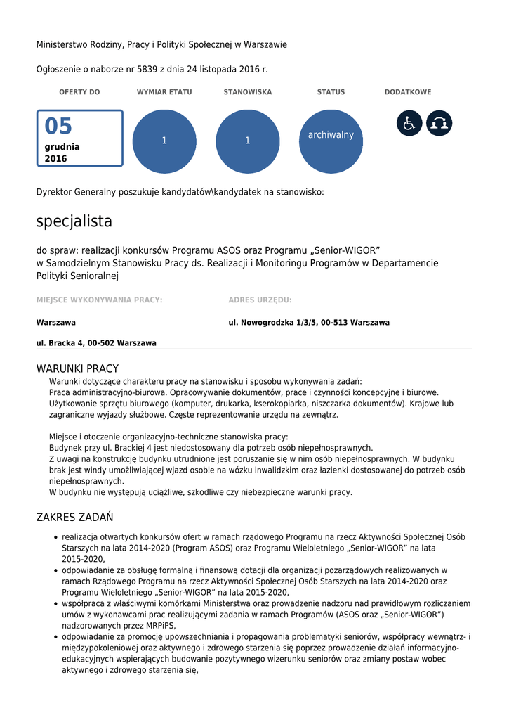 Ministerstwo Rodziny, Pracy i Polityki Społecznej w Warszawie Ogłoszenie o naborze nr 5839 z dnia 24 listopada 2016 r. OFERTY DO WYMIAR ETATU STANOWISKA 1 1 05 grudnia 2016 STATUS DODATKOWE archiwalny Dyrektor Generalny poszukuje kandydatów\kandydatek na stanowisko: specjalista do spraw: realizacji konkursów Programu ASOS oraz Programu „Senior-WIGOR” w Samodzielnym Stanowisku Pracy ds. Realizacji i Monitoringu Programów w Departamencie Polityki Senioralnej MIEJSCE WYKONYWANIA PRACY: ADRES URZĘDU: Warszawa ul. Nowogrodzka 1/3/5, 00-513 Warszawa ul. Bracka 4, 00-502 Warszawa WARUNKI PRACY Warunki dotyczące charakteru pracy na stanowisku i sposobu wykonywania zadań: Praca administracyjno-biurowa. Opracowywanie dokumentów, prace i czynności koncepcyjne i biurowe. Użytkowanie sprzętu biurowego (komputer, drukarka, kserokopiarka, niszczarka dokumentów). Krajowe lub zagraniczne wyjazdy służbowe. Częste reprezentowanie urzędu na zewnątrz. Miejsce i otoczenie organizacyjno-techniczne stanowiska pracy: Budynek przy ul. Brackiej 4 jest niedostosowany dla potrzeb osób niepełnosprawnych. Z uwagi na konstrukcję budynku utrudnione jest poruszanie się w nim osób niepełnosprawnych. W budynku brak jest windy umożliwiającej wjazd osobie na wózku inwalidzkim oraz łazienki dostosowanej do potrzeb osób niepełnosprawnych. W budynku nie występują uciążliwe, szkodliwe czy niebezpieczne warunki pracy. ZAKRES ZADAŃ realizacja otwartych konkursów ofert w ramach rządowego Programu na rzecz Aktywności Społecznej Osób Starszych na lata 2014-2020 (Program ASOS) oraz Programu Wieloletniego „Senior-WIGOR” na lata 2015-2020, odpowiadanie za obsługę formalną i finansową dotacji dla organizacji pozarządowych realizowanych w ramach Rządowego Programu na rzecz Aktywności Społecznej Osób Starszych na lata 2014-2020 oraz Programu Wieloletniego „Senior-WIGOR” na lata 2015-2020, współpraca z właściwymi komórkami Ministerstwa oraz prowadzenie nadzoru nad prawidłowym rozliczaniem umów z wykonawcami prac realizującymi zadania w ramach Programów (ASOS oraz „Senior-WIGOR”) nadzorowanych przez MRPiPS, odpowiadanie za promocję upowszechniania i propagowania problematyki seniorów, współpracy wewnątrz- i międzypokoleniowej oraz aktywnego i zdrowego starzenia się poprzez prowadzenie działań informacyjnoedukacyjnych wspierających budowanie pozytywnego wizerunku seniorów oraz zmiany postaw wobec aktywnego i zdrowego starzenia się, odpowiadanie za monitoring realizacji konkursu dla beneficjentów w ramach Programu ASOS oraz Programu „Senior-WIGOR”, w tym przygotowywanie cyklicznych raportów i opracowań nt. Programu, współpraca z właściwymi komórkami organizacyjnymi Ministerstwa w zakresie planowania i realizacji budżetu Programów oraz budżetu Departamentu, współpraca z Najwyższą Izbą Kontroli (NIK), Biurem Kontroli (BKO), Biurem Budżetu i Finansów (BBF) oraz Stanowiskiem ds. Audytu Wewnętrznego (SAW) w zakresie właściwym dla Departamentu, uczestnictwo w przedsięwzięciach i wydarzeniach związanych z tematyką senioralną, współpracy wewnątrzi międzypokoleniowej oraz aktywnego i zdrowego starzenia się seniorów. WYMAGANIA NIEZBĘDNE Wykształcenie: wyższe doświadczenie zawodowe: 1 rok w administracji publicznej Znajomość ustawy o działalności pożytku publicznego i o wolontariacie Znajomość ustawy o finansach publicznych Znajomość ustawy prawo zamówień publicznych Znajomość problematyki integracji społecznej w krajach UE Wiedza z zakresu ogólnej problematyki społeczno-ekonomicznej oraz znajomość wzajemnych relacji Znajomość polityki społecznej w zakresie osób starszych Znajomość ustawy o służbie cywilnej Znajomość przepisów kodeksu postępowania administracyjnego Znajomość ustawy o odpowiedzialności za naruszenie dyscypliny finansów publicznych Umiejętność obsługi oprogramowania: MS OFFICE Posiadanie obywatelstwa polskiego Korzystanie z pełni praw publicznych Nieskazanie prawomocnym wyrokiem za umyślne przestępstwo lub umyślne przestępstwo skarbowe DOKUMENTY I OŚWIADCZENIA NIEZBĘDNE Życiorys/CV i list motywacyjny Kopie dokumentów potwierdzających spełnienie wymagania niezbędnego w zakresie wykształcenia Kopie dokumentów potwierdzających spełnienie wymagania niezbędnego w zakresie doświadczenia zawodowego / stażu pracy Oświadczenie o posiadaniu obywatelstwa polskiego albo kopia dokumentu potwierdzającego posiadanie polskiego obywatelstwa Oświadczenie o wyrażeniu zgody na przetwarzanie danych osobowych do celów naboru Oświadczenie o korzystaniu z pełni praw publicznych Oświadczenie o nieskazaniu prawomocnym wyrokiem za umyślne przestępstwo lub umyślne przestępstwo skarbowe DOKUMENTY I OŚWIADCZENIA DODATKOWE kopia dokumentu potwierdzającego niepełnosprawność - w przypadku kandydatek/kandydatów, zamierzających skorzystać z pierwszeństwa w zatrudnieniu w przypadku, gdy znajdą się w gronie najlepszych kandydatek/kandydatów TERMINY I MIEJSCE SKŁADANIA DOKUMENTÓW Dokumenty należy złożyć do: 05 grudnia 2016 r. Decyduje data: wpływu oferty do urzędu Miejsce składania dokumentów: Ministerstwo Rodziny, Pracy i Polityki Społecznej Biuro Dyrektora Generalnego ul. Nowogrodzka 1/3/5 00-513 Warszawa z wyraźnym dopiskiem w liście motywacyjnym i na kopercie: DAS-2 INNE INFORMACJE: W miesiącu poprzedzającym datę upublicznienia ogłoszenia wskaźnik zatrudnienia osób niepełnosprawnych w urzędzie, w rozumieniu przepisów o rehabilitacji zawodowej i społecznej oraz zatrudnianiu osób niepełnosprawnych, nie wynosi co najmniej 6%. Etapy, metody oraz techniki naboru: - weryfikacja aplikacji pod względem spełniania wymagań formalnych, - pisemny sprawdzian wiedzy, - rozmowa kwalifikacyjna. Oferujemy: - umowę o pracę (na zastępstwo), ciekawe zadania, pracę w dużej organizacji, doskonalenie zawodowe. Przewidziany mnożnik kwoty bazowej stanowiący wy