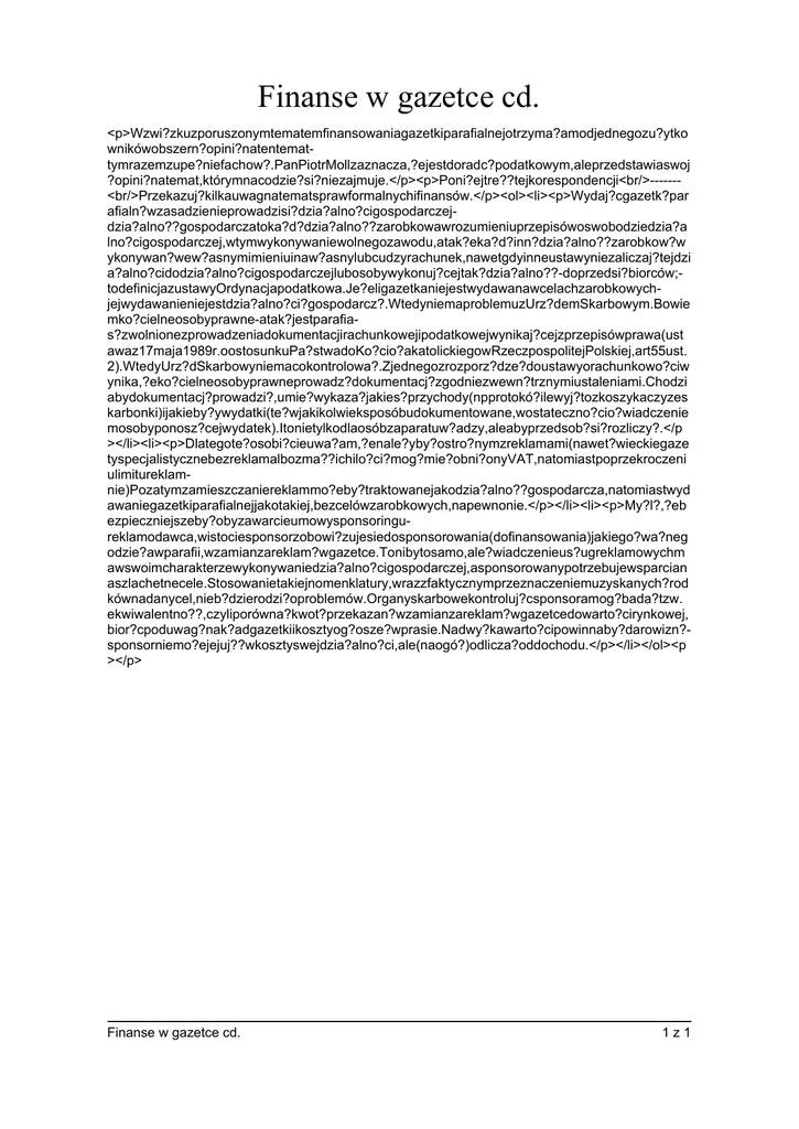 Finanse w gazetce cd. <p>Wzwi?zkuzporuszonymtematemfinansowaniagazetkiparafialnejotrzyma?amodjednegozu?ytko wnikówobszern?opini?natentemattymrazemzupe?niefachow?.PanPiotrMollzaznacza,?ejestdoradc?podatkowym,aleprzedstawiaswoj ?opini?natemat,którymnacodzie?si?niezajmuje.</p><p>Poni?ejtre??tejkorespondencji<br/>------<br/>Przekazuj?kilkauwagnatematsprawformalnychifinansów.</p><ol><li><p>Wydaj?cgazetk?par afialn?wzasadzienieprowadzisi?dzia?alno?cigospodarczejdzia?alno??gospodarczatoka?d?dzia?alno??zarobkowawrozumieniuprzepisówoswobodziedzia?a lno?cigospodarczej,wtymwykonywaniewolnegozawodu,atak?eka?d?inn?dzia?alno??zarobkow?w ykonywan?wew?asnymimieniuinaw?asnylubcudzyrachunek,nawetgdyinneustawyniezaliczaj?tejdzi a?alno?cidodzia?alno?cigospodarczejlubosobywykonuj?cejtak?dzia?alno??-doprzedsi?biorców;todefinicjazustawyOrdynacjapodatkowa.Je?eligazetkaniejestwydawanawcelachzarobkowychjejwydawanieniejestdzia?alno?ci?gospodarcz?.WtedyniemaproblemuzUrz?demSkarbowym.Bowie mko?cielneosobyprawne-atak?jestparafias?zwolnionezprowadzeniadokumentacjirachunkowejipodatkowejwynikaj?cejzprzepisówprawa(ust awaz17maja1989r.oostosunkuPa?stwadoKo?cio?akatolickiegowRzeczpospolitejPolskiej,art55ust. 2).WtedyUrz?dSkarbowyniemacokontrolowa?.Zjednegozrozporz?dze?doustawyorachunkowo?ciw ynika,?eko?cielneosobyprawneprowadz?dokumentacj?zgodniezwewn?trznymiustaleniami.Chodzi abydokumentacj?prowadzi?,umie?wykaza?jakies?przychody(npprotokó?ilewyj?tozkoszykaczyzes karbonki)ijakieby?ywydatki(te?wjakikolwieksposóbudokumentowane,wostateczno?cio?wiadczenie mosobyponosz?cejwydatek).Itonietylkodlaosóbzaparatuw?adzy,aleabyprzedsob?si?rozliczy?.</p ></li><li><p>Dlategote?osobi?cieuwa?am,?enale?yby?ostro?nymzreklamami(nawet?wieckiegaze tyspecjalistycznebezreklamalbozma??ichilo?ci?mog?mie?obni?onyVAT,natomiastpoprzekroczeni ulimitureklamnie)Pozatymzamieszczaniereklammo?eby?traktowanejakodzia?alno??gospodarcza,natomiastwyd awaniegazetkiparafialnejjakotakiej,bezcelówzarobkowych,napewnonie.</p></li><li><p>My?l?,?eb ezpieczniejszeby?obyzawarcieumowysponsoringureklamodawca,wistociesponsorzobowi?zujesiedosponsorowania(dofinansowania)jakiego?wa?neg odzie?awparafii,wzamianzareklam?wgazetce.Tonibytosamo,ale?wiadczenieus?ugreklamowychm awswoimcharakterzewykonywaniedzia?alno?cigospodarczej,asponsorowanypotrzebujewsparcian aszlachetnecele.Stosowanietakiejnomenklatury,wrazzfaktycznymprzeznaczeniemuzyskanych?rod kównadanycel,nieb?dzierodzi?oproblemów.Organyskarbowekontroluj?csponsoramog?bada?tzw. ekwiwalentno??,czyliporówna?kwot?przekazan?wzamianzareklam?wgazetcedowarto?cirynkowej, bior?cpoduwag?nak?adgazetkiikosztyog?osze?wprasie.Nadwy?kawarto?cipowinnaby?darowizn?sponsorniemo?ejejuj??wkosztyswejdzia?alno?ci,ale(naogó?)odlicza?oddochodu.</p></li></ol><p ></p> Finanse w gazetce cd. 1z1