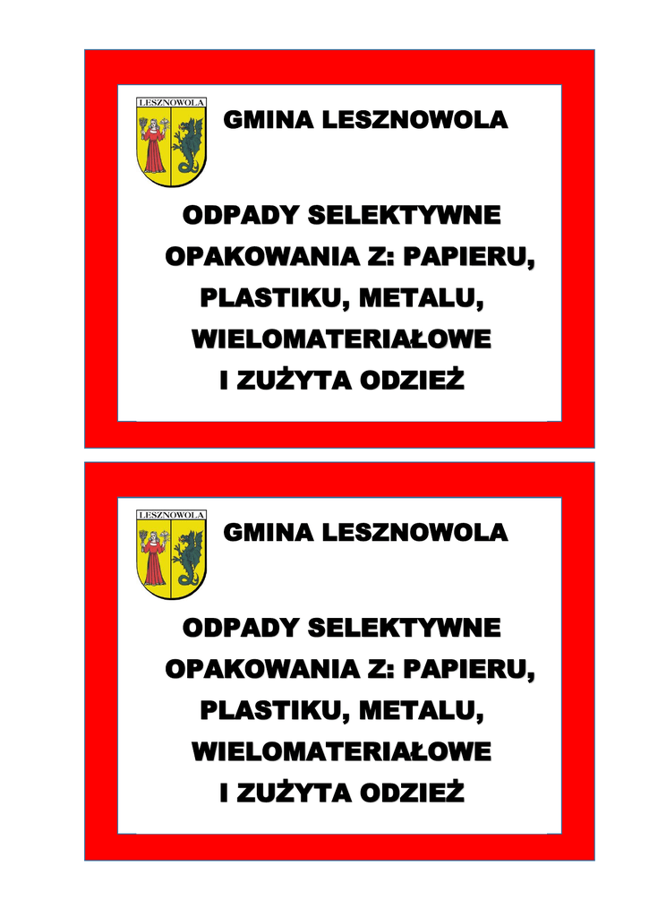 GMINA LESZNOWOLA ODPADY SELEKTYWNE OPAKOWANIA Z: PAPIERU, PLASTIKU, METALU, WIELOMATERIAŁOWE I ZUŻYTA ODZIEŻ GMINA LESZNOWOLA ODPADY SELEKTYWNE OPAKOWANIA Z: PAPIERU, PLASTIKU, METALU, WIELOMATERIAŁOWE I ZUŻYTA ODZIEŻ