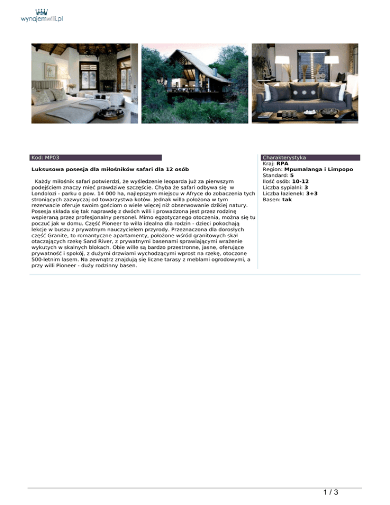 Kod: MP03 Luksusowa posesja dla miłośników safari dla 12 osób Każdy miłośnik safari potwierdzi, że wyśledzenie leoparda już za pierwszym podejściem znaczy mieć prawdziwe szczęście. Chyba że safari odbywa się w Londolozi - parku o pow. 14 000 ha, najlepszym miejscu w Afryce do zobaczenia tych stroniących zazwyczaj od towarzystwa kotów. Jednak willa położona w tym rezerwacie oferuje swoim gościom o wiele więcej niż obserwowanie dzikiej natury. Posesja składa się tak naprawdę z dwóch willi i prowadzona jest przez rodzinę wspieraną przez profesjonalny personel. Mimo egzotycznego otoczenia, można się tu poczuć jak w domu. Część Pioneer to willa idealna dla rodzin - dzieci pokochają lekcje w buszu z prywatnym nauczycielem przyrody. Przeznaczona dla dorosłych część Granite, to romantyczne apartamenty, położone wśród granitowych skał otaczających rzekę Sand River, z prywatnymi basenami sprawiającymi wrażenie wykutych w skalnych blokach. Obie wille są bardzo przestronne, jasne, oferujące prywatność i spokój, z dużymi drzwiami wychodzącymi wprost na rzekę, otoczone 500-letnim lasem. Na zewnątrz znajdują się liczne tarasy z meblami ogrodowymi, a przy willi Pioneer - duży rodzinny basen. Charakterystyka Kraj: RPA Region: Mpumalanga i Limpopo Standard: 5 Ilość osób: 10-12 Liczba sypialni: 3 Liczba łazienek: 3+3 Basen: tak 1/3 Zakwaterowanie: W każdej części do dyspozycji są 3 sypialnie dwuosobowe (łącznie 6). Wszystkie sypialnie są przestronne, luksusowo urządzone, wyposażone w duże łóżka, kominki, klimatyzację, prysznice zewnętrzny i wewnętrzny, wanny i podgrzewane baseny w części Granite. Część wspólna w willi Pioneer oferuje luźną atmosferę, komfort, kolonialne meble. Natomiast Granite to współczesna elegancja w odcieniach srebra i szarości Wyposażenie: Kominki, klimatyzacja, prysznice zewnętrzne, podgrzewane prywatne baseny w Granite, duży rodzinny basen w Pioneer Lokalizacja: Prywatny Rezerwat Londolozi, Sabi Sands, Grater Kruger. Dodatkowe usługi: Profesjonalna obsługa na miejscu, rangerzy organizujący safari autami oraz wędrówki po buszu, kucharz przygotowujący posiłki, napoje i lokalne alkohole, codzienne zajęcia z jogi, program dla dzieci, pralnia. Cena za tydzień wynajmu: Na zapytanie. 2/3 3/3 Powered by TCPDF (www.tcpdf.org)