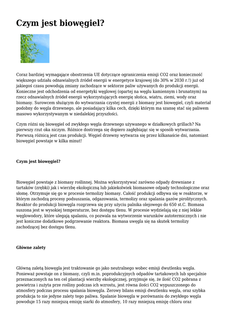Czym jest biowęgiel? Coraz bardziej wymagające obostrzenia UE dotyczące ograniczenia emisji CO2 oraz konieczność większego udziału odnawialnych źródeł energii w energetyce krajowej (do 30% w 2030 r.!) już od jakiegoś czasu powodują zmiany zachodzące w sektorze paliw używanych do produkcji energii. Konieczne jest odchodzenia od energetyki węglowej (opartej na węglu kamiennym i brunatnym) na rzecz odnawialnych źródeł energii wykorzystujących energię słońca, wiatru, ziemi, wody oraz biomasy. Surowcem służącym do wytwarzania czystej energii z biomasy jest biowęgiel, czyli materiał podobny do węgla drzewnego, ale posiadający kilka cech, dzięki którym ma szansę stać się paliwem masowo wykorzystywanym w niedalekiej przyszłości. Czym różni się biowęgiel od zwykłego węgla drzewnego używanego w działkowych grillach? Na pierwszy rzut oka niczym. Różnice dostrzega się dopiero zagłębiając się w sposób wytwarzania. Pierwszą różnicą jest czas produkcji. Węgiel drzewny wytwarza się przez kilkanaście dni, natomiast biowęgiel powstaje w kilka minut! Czym jest biowęgiel? Biowęgiel powstaje z biomasy roślinnej. Można wykorzystywać zarówno odpady drewniane z tartaków (zrębki) jak i wierzbę ekologiczną lub jakiekolwiek biomasowe odpady technologiczne oraz słomę. Otrzymuje się go w procesie termolizy biomasy. Całość produkcji odbywa się w reaktorze, w którym zachodzą procesy podsuszania, odgazowania, termolizy oraz spalania gazów pirolitycznych. Reaktor do produkcji biowęgla rozgrzewa się przy użyciu palnika olejowego do 650 st.C. Biomasa suszona jest w wysokiej temperaturze, bez dostępu tlenu. W procesie wydzielają się z niej lekkie węglowodory, które ulegają spalaniu, co pozwala na wytworzenie warunków autotermicznych i nie jest koniczne dodatkowe podgrzewanie reaktora. Biomasa uwęgla się na skutek termolizy zachodzącej bez dostępu tlenu. Główne zalety Główną zaletą biowęgla jest traktowanie go jako neutralnego wobec emisji dwutlenku węgla. Ponieważ powstaje on z biomasy, czyli m.in. poprodukcyjnych odpadów tartakowych lub specjalnie przeznaczonych na ten cel plantacji wierzby ekologicznej, przyjmuje się, że ilość CO2 pobrana z powietrza i zużyta prze rośliny podczas ich wzrostu, jest równa ilości CO2 wypuszczonego do atmosfery podczas procesu spalania biowęgla. Zerowy bilans emisji dwutlenku węgla, oraz szybka produkcja to nie jedyne zalety tego paliwa. Spalanie biowęgla w porównaniu do zwykłego węgla powoduje 15 razy mniejszą emisję siarki do atmosfery, 10 razy mniejszą emisję chloru oraz kilkakrotnie mniejsze wydzielanie popiołów. Warto wspomnieć, że wartość kaloryczna biowęgla wynosi aż 25 MJ/kg, czyli więcej niż wartość dla węgla brunatnego, a tylko nieznacznie mniej niż węgla kamiennego (28 MJ/kg). Gdzie powstaje biowęgiel? Produkcję biowęgla można prowadzić w zasadzie w każdym miejscu, gdzie jest pod dostatkiem biomasy lub odpadów drzewnych. Obecnie produkcja biowęgla ma miejsce m.in. w Azji, gdzie węgiel powstaje z odpadów drzewnych powstałych na ogromnych plantacjach oleju palmowego. Jest to kolejną zaletą tego paliwa - recykling odpadów drzewnych i przetworzenie ich na nowe źródło energii. Tak wytworzony węgiel można z zyskiem sprzedawać w Europie, która naciskana wymaganiami Unii Europejskiej, jest już coraz bliżej prawie całkowitej rezygnacji ze spalania węgla kamiennego oraz brunatnego. Opracowanie inż. Mateusz Zduniak www.klimatyzacja.pl, www.ogrzewnictwo.pl Źródło: Fluid SA Materiał objęty prawem autorskim. Publikacja w części lub w całości wyłącznie za zgodą redakcji KONTAKT Biuro Obsługi Klienta E-mail: [email protected] WWW: www.ogrzewnictwo.pl Tel: +48 42 653 57 03 Fax: +48 42 252 94 74 Adres: Morgowa 4 90-950 Łódź