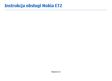 Instrukcja obsługi Nokia E72 Wydanie 6.0 DEKLARACJA ZGODNOŚCI NOKIA CORPORATION niniejszym oświadcza, że produkt RM-530 jest zgodny z zasadniczymi wymaganiami oraz pozostałymi stosownymi postanowieniami Dyrektywy 1999/5/WE. Kopię „Deklaracji zgodności” można znaleźć pod adresem http:// www.nokia.com/phones/declaration_of_conformity/. © 2011 Nokia. Wszelkie prawa zastrzeżone. Nokia, Nokia Connecting People, Eseries, Nokia E72 i Navi są znakami towarowymi lub zastrzeżonymi znakami towarowymi firmy Nokia Corporation. Sygnał dźwiękowy o nazwie Nokia tune jest znakiem towarowym Nokia Corporation. Inne nazwy produktów i firm wymienione w niniejszym dokumencie mogą być znakami towarowymi lub nazwami handlowymi ich właścicieli. Powielanie, przekazywanie, dystrybucja oraz przechowywanie kopii części lub całości tego dokumentu w jakiejkolwiek formie bez wyrażonej uprzednio na piśmie zgody firmy Nokia jest zabronione. Firma Nokia promuje politykę ciągłego rozwoju. Firma Nokia zastrzega sobie prawo do wprowadzania zmian i usprawnień we wszelkich produktach opisanych w tym dokumencie bez uprzedniego powiadomienia. Java i wszystkie znaki związane z technologią Java są znakami towarowymi lub zastrzeżonymi znakami towarowymi firmy Sun Microsystems, Inc. Ten produkt podlega licencji MPEG-4 Visual Patent Portfolio, która upoważnia do (i) korzystania z niego w prywatnych i niekomercyjnych celach w związku z informacjami zakodowanymi zgodnie ze standardem MPEG-4 przez konsumenta w toku jego działań o charakterze prywatnym i niekomercyjnym oraz do (ii) używania go w związku z nagraniami wideo w formacie MPEG-4, dostarczonymi przez licencjonowanego dostawcę takich nagrań. W odniesieniu do innych zastosowań licencja nie jest udzielana i nie można jej domniemywać. Dodatkowe informacje, w tym informacje dotyczące zastosowań promocyjnych, wewnętrznych i komercyjnych, można otrzymać od firmy MPEG LA, LLC. Zobacz http://www.mpegla.com. W MAKSYMALNYM DOPUSZCZALNYM PRZEZ PRAWO ZAKRESIE FIRMA NOKIA ANI ŻADEN Z JEJ LICENCJODAWCÓW W ŻADNYM WYPADKU NIE PONOSI ODPOWIEDZIALNOŚCI ZA JAKĄKOLWIEK UTRATĘ DANYCH LUB ZYSKÓW ANI ZA ŻADNE SZCZEGÓLNE, PRZYPADKOWE, WTÓRNE LUB POŚREDNIE SZKODY POWSTAŁE W DOWOLNY SPOSÓB. ZAWARTOŚĆ TEGO DOKUMENTU PRZEDSTAWIONA JEST „TAK JAK JEST – AS IS”. NIE UDZIELA SIĘ JAKICHKOLWIEK GWARANCJI, ZARÓWNO WYRAŹNYCH JAK I DOROZUMIANYCH W ODNIESIENIU DO RZETELNOŚCI, WIARYGODNOŚCI LUB TREŚCI NINIEJSZEGO DOKUMENTU, WŁĄCZAJĄC W TO, LECZ NIE OGRANICZAJĄC TEGO DO JAKICHKOLWIEK DOROZUMIANYCH GWARANCJI UŻYTECZNOŚCI HANDLOWEJ LUB PRZYDATNOŚCI DO OKREŚLONEGO CELU, CHYBA ŻE TAKOWE WYMAGANE SĄ PRZEZ PRZEPISY PRAWA. FIRMA NOKIA ZASTRZEGA SOBIE PRAWO DO DOKONYWANIA ZMIAN W TYM DOKUMENCIE LUB WYCOFANIA GO W DOWOLNYM CZASIE BEZ UPRZEDNIEGO POWIADOMIENIA. W maksymalnym dopuszczalnym przez prawo zakresie dekompilacja oprogramowania w urządzeniu jest zabroniona. Wymienione w niniejszej instrukcji ograniczenia, które dotyczą oświadczeń, gwarancji, przyczyn powstania szkód i odpowiedzialności firmy Nokia, stosują się również do oświadczeń, gwarancji, przyczyn powstania szkód i odpowiedzialności licencjodawców firmy Nokia. Dostarczone wraz z urządzeniem aplikacje autorstwa osób trzecich mogły zostać opracowane przez osoby lub firmy niepowiązane z firmą Nokia i mogą być własnością takich osób lub firm. W odniesieniu do tych aplikacji firmie Nokia nie przysługują żadne prawa autorskie ani inne prawa własności intelektualnej. Nokia nie ponosi żadnej odpowiedzialności za obsługę użytkowników końcowych, za prawidłowość działania tych aplikacji, za zawarte w nich informacje czy inne materiały. Firma Nokia nie udziela też żadnych gwarancji na te aplikacje. PRZEZ FAKT UŻYCIA TYCH APLIKACJI ICH UŻYTKOWNIK PRZYJMUJE DO WIADOMOŚCI, ŻE ZOSTAŁY ONE DOSTARCZONE „TAK, JAK SĄ”, BEZ JAKICHKOLWIEK, JAWNYCH LUB DOROZUMIANYCH GWARANCJI W MAKSYMALNYM DOPUSZCZALNYM PRZEZ PRAWO ZAKRESIE. UŻYTKOWNIK PRZYJMUJE TEŻ DO WIADOMOŚCI, ŻE ANI FIRMA NOKIA ANI PODMIOTY Z NIĄ ZWIĄZANE NIE SKŁADAJĄ ŻADNYCH ZAPEWNIEŃ ANI OŚWIADCZEŃ, TAK WYRAŹNYCH JAK I DOROZUMIANYCH, DOTYCZĄCZYCH MIĘDZY INNYMI, LECZ NIE WYŁĄCZNIE, TYTUŁU PRAWNEGO DO APLIKACJI, ICH JAKOŚCI HANDLOWEJ, PRZYDATNOŚCI DO OKREŚLONEGO CELU I NIENARUSZANIA PRZEZ NIE JAKICHKOLWIEK PRAW OSÓB TRZECICH Z PATENTÓW, PRAW AUTORSKICH, ZNAKÓW TOWAROWYCH I INNYCH PRAW. Dostępność poszczególnych produktów i aplikacji, a także i związanych z tymi produktami usług może się różnić w zależności od regionu. Szczegóły, w tym dostępność opcji językowych, należy sprawdzić ze sprzedawcą produktów Nokia. To urządzenie może zawierać towary, technologie i oprogramowanie podlegające przepisom eksportowym USA i innych krajów. Odstępstwa od tych przepisów są zabronione. ANONS FCC/INDUSTRY CANADA To urządzenie może powodować zakłócenia w odbiorze audycji radiowych i programów TV (głównie wtedy, gdy telefon jest blisko odbiornika). Jeśli takich zakłóceń nie można wyeliminować, wtedy FCC/Industry Canada może zażądać zaprzestania korzystania z tego telefonu. Pomocy w eliminacji zakłóceń udzieli personel lokalnego serwisu. Urządzenie to spełnia warunki ujęte w części 15 przepisów FCC. Korzystanie z urządzenia podlega następującym dwóm warunkom: (1) działanie urządzenia nie może powodować szkodliwych zakłóceń i (2) urządzenie musi odbierać zakłócenia łącznie z tymi, które mogą powodować niepożądane działanie. Dokonanie jakichkolwiek zmian lub modyfikacji bez wyraźnej zgody firmy Nokia może unieważnić prawo użytkownika do korzystania z tego urządzenia. /Wydanie 6.0 PL Spis treści Spis treści Bezpieczeństwo...............................................7 Kilka słów o urządzeniu.......................................................7 Usługi sieciowe.........................