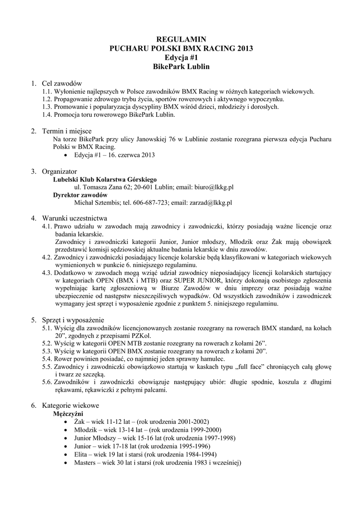 REGULAMIN PUCHARU POLSKI BMX RACING 2013 Edycja #1 BikePark Lublin 1. Cel zawodów 1.1. Wyłonienie najlepszych w Polsce zawodników BMX Racing w różnych kategoriach wiekowych. 1.2. Propagowanie zdrowego trybu życia, sportów rowerowych i aktywnego wypoczynku. 1.3. Promowanie i popularyzacja dyscypliny BMX wśród dzieci, młodzieży i dorosłych. 1.4. Promocja toru rowerowego BikePark Lublin. 2. Termin i miejsce Na torze BikePark przy ulicy Janowskiej 76 w Lublinie zostanie rozegrana pierwsza edycja Pucharu Polski w BMX Racing. Edycja #1 – 16. czerwca 2013 3. Organizator Lubelski Klub Kolarstwa Górskiego ul. Tomasza Zana 62; 20-601 Lublin; email: [email protected] Dyrektor zawodów Michał Sztembis; tel. 606-687-723; email: [email protected] 4. Warunki uczestnictwa 4.1. Prawo udziału w zawodach mają zawodnicy i zawodniczki, którzy posiadają ważne licencje oraz badania lekarskie. Zawodnicy i zawodniczki kategorii Junior, Junior młodszy, Młodzik oraz Żak mają obowiązek przedstawić komisji sędziowskiej aktualne badania lekarskie w dniu zawodów. 4.2. Zawodnicy i zawodniczki posiadający licencje kolarskie będą klasyfikowani w kategoriach wiekowych wymienionych w punkcie 6. niniejszego regulaminu. 4.3. Dodatkowo w zawodach mogą wziąć udział zawodnicy nieposiadający licencji kolarskich startujący w kategoriach OPEN (BMX i MTB) oraz SUPER JUNIOR, którzy dokonają osobistego zgłoszenia wypełniając kartę zgłoszeniową w Biurze Zawodów w dniu imprezy oraz posiadają ważne ubezpieczenie od następstw nieszczęśliwych wypadków. Od wszystkich zawodników i zawodniczek wymagany jest sprzęt i wyposażenie zgodnie z punktem 5. niniejszego regulaminu. 5. Sprzęt i wyposażenie 5.1. Wyścig dla zawodników licencjonowanych zostanie rozegrany na rowerach BMX standard, na kołach 20”, zgodnych z przepisami PZKol. 5.2. Wyścig w kategorii OPEN MTB zostanie rozegrany na rowerach z kołami 26”. 5.3. Wyścig w kategorii OPEN BMX zostanie rozegrany na rowerach z kołami 20”. 5.4. Rower powinien posiadać, co najmniej jeden sprawny hamulec. 5.5. Zawodnicy i zawodniczki obowiązkowo startują w kaskach typu „full face” chroniących całą głowę i twarz ze szczęką. 5.6. Zawodników i zawodniczki obowiązuje następujący ubiór: długie spodnie, koszula z długimi rękawami, rękawiczki z pełnymi palcami. 6. Kategorie wiekowe Mężczyźni Żak – wiek 11-12 lat – (rok urodzenia 2001-2002) Młodzik – wiek 13-14 lat – (rok urodzenia 1999-2000) Junior Młodszy – wiek 15-16 lat (rok urodzenia 1997-1998) Junior – wiek 17-18 lat (rok urodzenia 1995-1996) Elita – wiek 19 lat i starsi (rok urodzenia 1984-1994) Masters – wiek 30 lat i starsi (rok urodzenia 1983 i wcześniej) Kobiety OPEN Zawodniczki w wieku 11 lat i starsze (rok urodzenia 2002 i wcześniej). W przypadku zgłoszenia więcej niż 8 kobiet istnieje możliwość podziału na kategorie. OPEN BMX i MTB Zawodnicy i zawodniczki: którzy ukończyli 18 lat, w wieku 16-17 lat, którzy dostarczą podpisane przez rodzica lub opiekuna prawnego oświadczenie na karcie zgłoszeniowej mówiące, że ich stan zdrowia pozwala im na uczestnictwo w zawodach, startują na odpowiedzialność rodziców lub opiekunów prawnych oraz posiadają ważne ubezpieczenie od następstw nieszczęśliwych wypadków, poniżej 16 lat, za pisemną zgodą rodziców lub opiekunów prawnych na karcie zgłoszeniowej oraz ich stałą obecnością w miasteczku sportowym w czasie trwania zawodów, SUPER JUNIOR Zawodnicy i zawodniczki: poniżej 11 lat, za pisemną zgodą rodziców lub opiekunów prawnych na karcie zgłoszeniowej oraz ich stałą obecnością w miasteczku sportowym w czasie trwania. 7. Opłaty startowe Opłaty startowe będą pobierane zgodnie z przepisami PZKol: Żak 0 zł Młodzik 0 zł Junior mł. 0 zł Junior 10 zł Elita 16 zł Kobiety Open 10 zł Masters 30 zł oraz Super Junior 0 zł Open BMX 10 zł Open MTB 10 zł 8. Zasady rozgrywania zawodów 8.1. Zawody będą rozgrywane zgodnie z przepisami PZKol oraz niniejszym regulaminem. 8.2. Minimalna ilość zgłoszonych zawodników do rozegrania danej kategorii wynosi 5 (pięć). Jeśli zawodników jest mniej, przechodzą do wyższej kategorii, gdy jeszcze w sumie nie ma 5, wszyscy oni przechodzą do następnej, wyższej grupy itd. aż do elity. Jeśli po takich awansach lub w skutek zakończenia awansu w juniorach, w elicie nie będzie 5 zawodników, zawody i tak zostaną rozegrane i miejsca przyznane. 8.3. W wyścigu musi wystartować minimum 4 zawodników, aby przyznane zostały punkty w Pucharze Polski. 8.4. W wyścigach kategorii OPEN musi wystartować minimum 5 zawodników. 8.5. Punktacja zawodów Pucharu Polski zgodnie z odrębnym regulaminem zmieszczonym na stronie organizatora www.lkkg.pl oraz www.dh4x.pl 9. Protesty Protesty i apelacje mogą być zgłaszane do sędziego głównego przez kierownika ekipy w ciągu 15 minut od zaistnienia zdarzenia lub natychmiast po ogłoszeniu wyników danej rundy, ale zawsze przed rozpoczęciem rundy następnej. Po rozpatrzeniu protestu, decyzja Komisji Sędziowskiej w każdej sprawie jest ostateczna. 10. Kary W zakresie kar obowiązują Przepisy Sportowe PZKol. 11. Harmonogram zawodów 10:00 – 11:00 – przyjmowanie zgłoszeń w biurze zawodów 10:15 – otwarcie trasy 10:45 – 11:15 – obowiązkowy trening z bramką startową 11:20 – otwarcie zawodów, odprawa techniczna 11:30 – 12:30 – eliminacje czasowe 12:45 – 13:45 – wyścigi eliminacyjne 14:00 – 14:30 – wyścigi finałowe 15:00 – dekoracje, zamknięcie zawodów Organizator zastrzega możliwość zmiany programu w zależności od zaistniałych okoliczności. 12. Przepisy końcowe 12.1. Organizator nie ponosi odpowiedzialności za wypadki losowe zaistniałe podczas dojazdu uczestników na zawody i powrotu z nich. 12.2. Uczestnik przyjmuje do wiadomości, że należy przestrzegać zarządzeń służb porządkowych oraz warunków niniejszego Regulaminu