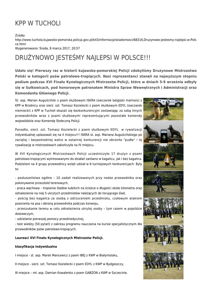 KPP W TUCHOLI Źródło: http://www.tuchola.kujawsko-pomorska.policja.gov.pl/k43/informacje/wiadomosci/68316,Druzynowo-jestesmy-najlepsi-w-Pols ce.html Wygenerowano: Środa, 8 marca 2017, 20:57 DRUŻYNOWO JESTEŚMY NAJLEPSI W POLSCE!!! Udało się! Pierwszy raz w historii kujawsko-pomorskiej Policji zdobyliśmy Drużynowe Mistrzostwo Polski w kategorii psów patrolowo-tropiących. Nasi reprezentanci stanęli na najwyższym stopniu podium podczas XVI Finału Kynologicznych Mistrzostw Policji, które w dniach 5-9 września odbyły się w Sułkowicach, pod honorowym patronatem Ministra Spraw Wewnętrznych i Administracji oraz Komendanta Głównego Policji. St. asp. Marian Auguściński z psem służbowym ISKRA (owczarek belgijski malinois) z KPP w Brodnicy oraz sierż. szt. Tomasz Kozielecki z psem służbowym EDYL (owczarek niemiecki) z KPP w Tucholi okazali się bezkonkurencyjni zostawiając za sobą innych przewodników wraz z psami służbowymi reprezentującymi pozostałe komendy wojewódzkie oraz Komendę Stołeczną Policji. Ponadto, sierż. szt. Tomasz Kozielecki z psem służbowym EDYL w rywalizacji indywidualnej uplasowali się na II miejscu!!! ISKRA st. asp. Mariana Auguścińskiego po zaciętej i bezpośredniej walce w ostatniej konkurencji nie obroniła "pudła" i tę rywalizację w mistrzostwach zakończyła na IV miejscu. W XVI Kynologicznych Mistrzostwach Policji uczestniczyło 17 drużyn z psami patrolowo-tropiącymi wytresowanymi do działań zarówno w kagańcu, jak i bez kagańca. Podzieleni na 4 grupy przewodnicy wzięli udział w 6 turniejowych konkurencjach. Były to: - posłuszeństwo ogólne – 10 zadań realizowanych przy nodze przewodnika oraz pokonywanie przeszkód terenowych, - praca węchowa – tropienie śladów ludzkich na ścieżce o długości około kilometra oraz odnalezienie na niej 5 ukrytych przedmiotów należących do torującego ślad, - pościg bez kagańca za osobą z odrzuceniem przedmiotu, czołowym atakiem pozoranta na psa i obroną przewodnika podczas konwoju, - przeszukanie terenu w celu odnalezienia ukrytej osoby – tym razem w pojeździe dostawczym, - udzielanie pierwszej pomocy przedmedycznej, - test wiedzy (50 pytań) z zakresu programu nauczania na kursie specjalistycznym dla przewodników psów patrolowo-tropiących. Laureaci XVI Finału Kynologicznych Mistrzostw Policji. klasyfikacja indywidualna I miejsce - st. asp. Marek Mancewicz z psem IBEJ z KWP w Białymstoku, II miejsce - sierż. szt. Tomasz Kozielecki z psem EDYL z KWP w Bydgoszczy, III miejsce – mł. asp. Damian Kowalenko z psem GABZON z KWP w Szczecinie. klasyfikacja drużynowa I miejsce drużyna z KWP w Bydgoszczy w składzie: - asp. szt. Dawid Ludkowski – kierownik drużyny, - st. asp. Marian Auguściński z psem służbowym ISKRA, - sierż. szt. Tomasz Kozielecki z psem służbowym EDYL. II miejsce drużyna z KWP w Białymstoku w składzie: - asp. szt. Grzegorz Bielawski – kierownik drużyny, - st. asp. Marek Mancewicz, - st. asp Krystian Chim. III miejsce drużyna z KWP w Gdańsku w składzie: - asp. szt. Witold Glinka – kierownik drużyny, - mł. asp. Rafał Zieliński, - st. sierż. Adam Jasnoch. Gratulujemy!!! Większość konkurencji zostało rozegranych na terenie Zakładu Kynologii Policyjnej w Sułkowicach. Jedynie tropienie śladów ludzkich odbyło się w miejscowościach przyległych do ośrodka szkolenia. Najwięcej niespodzianek było podczas wykonywania zadania z przeszukaniem terenu w celu odnalezienia ukrytej osoby. Pies musiał przeszukać ogrodzony metalowym płotem teren oraz zaparkowane tam samochody i w jednym z nich odnaleźć ukrytego, uzbrojonego w niebezpieczne narzędzie pozoranta. Była to bardzo emocjonująca konkurencja zarówno dla psa, jak i przewodnika, z uwagi na miejsce ukrycia pozoranta – 1,5 metra nad ziemią w chłodni wypełnionej różnymi przedmiotami wydającymi dźwięk. Nagrody dla zwycięzców wręczał obecny w tym dniu Zastępca Komendanta Głównego Policji nadinsp. Jan Lach. Podczas uroczystości obecni byli również przedstawiciele biur Komendy Głównej Policji, a także służb mundurowych, w tym jednostek szkoleniowych oraz lokalnych władz samorządowych, środowisk naukowych i instytucji współpracujących z Zakładem Kynologii Policyjnej. Obecni byli również poprzedni kierownicy ośrodka i reprezentanci Policji: czeskiej, estońskiej, litewskiej, niemieckiej i słowackiej. zdjęcia: asp. szt. Dawid Ludkowski KWP Bydgoszcz asp. Dariusz Ratajczak i Jerzy Lęcznar/ZKP Autor: opracowano na podstawie CSP Leginowo asp. szt. Dawid Lutkowski Publikacja: Kamila Ogonowska Ocena: 5/5 (1) Tweetnij