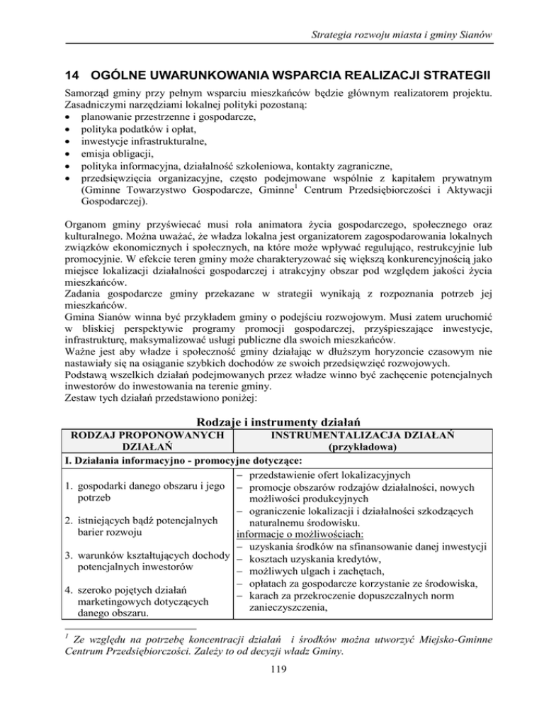 Strategia rozwoju miasta i gminy Sianów 14 OGÓLNE UWARUNKOWANIA WSPARCIA REALIZACJI STRATEGII Samorząd gminy przy pełnym wsparciu mieszkańców będzie głównym realizatorem projektu. Zasadniczymi narzędziami lokalnej polityki pozostaną: • planowanie przestrzenne i gospodarcze, • polityka podatków i opłat, • inwestycje infrastrukturalne, • emisja obligacji, • polityka informacyjna, działalność szkoleniowa, kontakty zagraniczne, • przedsięwzięcia organizacyjne, często podejmowane wspólnie z kapitałem prywatnym (Gminne Towarzystwo Gospodarcze, Gminne1 Centrum Przedsiębiorczości i Aktywacji Gospodarczej). Organom gminy przyświecać musi rola animatora życia gospodarczego, społecznego oraz kulturalnego. Można uważać, że władza lokalna jest organizatorem zagospodarowania lokalnych związków ekonomicznych i społecznych, na które może wpływać regulująco, restrukcyjnie lub promocyjnie. W efekcie teren gminy może charakteryzować się większą konkurencyjnością jako miejsce lokalizacji działalności gospodarczej i atrakcyjny obszar pod względem jakości życia mieszkańców. Zadania gospodarcze gminy przekazane w strategii wynikają z rozpoznania potrzeb jej mieszkańców. Gmina Sianów winna być przykładem gminy o podejściu rozwojowym. Musi zatem uruchomić w bliskiej perspektywie programy promocji gospodarczej, przyśpieszające inwestycje, infrastrukturę, maksymalizować usługi publiczne dla swoich mieszkańców. Ważne jest aby władze i społeczność gminy działając w dłuższym horyzoncie czasowym nie nastawiały się na osiąganie szybkich dochodów ze swoich przedsięwzięć rozwojowych. Podstawą wszelkich działań podejmowanych przez władze winno być zachęcenie potencjalnych inwestorów do inwestowania na terenie gminy. Zestaw tych działań przedstawiono poniżej: Rodzaje i instrumenty działań RODZAJ PROPONOWANYCH INSTRUMENTALIZACJA DZIAŁAŃ DZIAŁAŃ (przykładowa) I. Działania informacyjno - promocyjne dotyczące: − przedstawienie ofert lokalizacyjnych 1. gospodarki danego obszaru i jego − promocje obszarów rodzajów działalności, nowych potrzeb możliwości produkcyjnych − ograniczenie lokalizacji i działalności szkodzących 2. istniejących bądź potencjalnych naturalnemu środowisku. barier rozwoju informacje o możliwościach: − uzyskania środków na sfinansowanie danej inwestycji 3. warunków kształtujących dochody − kosztach uzyskania kredytów, potencjalnych inwestorów − możliwych ulgach i zachętach, − opłatach za gospodarcze korzystanie ze środowiska, 4. szeroko pojętych działań − karach za przekroczenie dopuszczalnych norm marketingowych dotyczących zanieczyszczenia, danego obszaru. 1 Ze względu na potrzebę koncentracji działań i środków można utworzyć Miejsko-Gminne Centrum Przedsiębiorczości. Zależy to od decyzji władz Gminy. 119 SKE Pomerania – Instytut Aktywizacji Społeczno-Gospodarczej Gmin i Regionu RODZAJ PROPONOWANYCH DZIAŁAŃ − − − − − INSTRUMENTALIZACJA DZIAŁAŃ (przykładowa) o cenach gruntów budowlanych itp. działalność publicystyczno -wydawnicza, dostarczająca informacji np. na temat zamierzeń władz lokalnych działalność szkoleniowa, (seminaria, szkolenia, kursy i sympozja), organizowanie wystaw gospodarczych, obrazujących szczególne osiągnięcia danego obszaru, targów, udział w nich podmiotów z danego obszaru, opracowanie i rozpowszechnianie w formie broszur, katalogów, materiałów reklamujących walory użytkowe i udogodnienia dotyczące inwestowania i funkcjonowania podmiotów. II. Działania organizatorskie z: 1. realizacją podstawowych zadań własnych gminy − budowa gminnych dróg, ulic, placów oraz organizacja ruchu drogowego, − budowa wodociągów, oczyszczalni, 2. kreowaniem przedsiębiorczości − uruchamianie inkubatorów przedsiębiorczości, prywatnej − organizowanie parków technologicznych, 3. tworzeniem związków wspólnot i − związki i porozumienia komunalne, innych przedsięwzięć w celu − stowarzyszenia gmin, wójtów, burmistrzów, realizacji określonych zadań − sejmik samorządowy, III. działania o charakterze administracyjno – prawnym 1. wydawanie przepisów gminnych − zasady zarządzania mieniem gminy, − statut gminy i organizacji urzędów i instytucji, − przepisy porządkowe, 2. ewidencjonowanie działalności − uproszczenie operacji w tym zakresie m.in. gospodarczej i udzielanie zezwoleń przeniesienie na najniższy szczebel administracji na prowadzenie działalności nie terenowej, wymagającej koncesji 3. utrudnienia i ułatwienia − uproszczenie trybu podejmowania decyzji lokalizacyjne lokalizacyjnych, − załatwianie spraw związanych z podjęciem decyzji lokalizacyjnych w jednym miejscu, − informacja o obszarach (strefach), gdzie zakazana jest wszelka działalność inwestycyjna, − określenie nieprzekraczalnego terminu załatwienia spraw, − wcześniejsze przygotowanie terenu, 4. gospodarka gruntami − uregulowanie spraw związanych z własnością, − dogodne formy udostępniania gruntów, − kompleksowe porządkowanie terenu i przygotowanie działek budowlanych, IV. Działania o charakterze ekonomiczno - finansowym 1. podatki i opłaty lokalne − obniżki stawek lokalnych np. od nieruchomości, − wprowadzenie ulg i zwolnień z podatków i opłat lokalnych, − określenie partycypacji nowego przedsiębiorstwa w 120 Strategia rozwoju miasta i gminy Sianów RODZAJ PROPONOWANYCH DZIAŁAŃ INSTRUMENTALIZACJA DZIAŁAŃ (przykładowa) nakładach na infrastrukturę, − udzielanie ulg lub zwolnień w ściśle określonych przypadkach np. gdy inwestorzy podejmują inwestycje dotyczące ochrony środowiska bądź produkcję określonych wyrobów opartą na nowoczesnych technologiach, 3. − udzielanie gwarancji przedsiębiorstwom, które opłaty za gospodarcze korzystanie ze zaciągają kredyty na inwestycje służące ochronie środowiska i kary z t