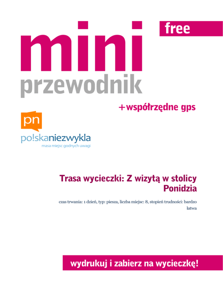 Trasa wycieczki: Z wizytą w stolicy Ponidzia czas trwania: 1 dzień, typ: piesza, liczba miejsc: 8, stopień trudności: bardzo łatwa Opis wycieczki Pińczów - stolica Ponidzia to miasto powiatowe, położone nad Nidą, będącą lewym dopływem Wisły. Miasteczko z dużym, prawie kwadratowym, średniowiecznym rynkiem w środku rozłożyło się pomiędzy rzeką, a niewysokimi wzgórzami Garbu Pińczowskiego. Zachowało się tu wiele cennych zabytków wkomponowanych w krajobraz nieskażonej cywilizacją przyrody: Sanktuarium Matki Boskiej Mirowskiej, gotycki popauliński zespół klasztorny, pałac Wielopolskich z jedną już tylko basztą ogrodową, drukarnia ariańska czy synagoga. Symbolem miasta i regionu jest kaplica św. Anny - warsztatu Santa Gucciego - górująca nad okolicą, skąd można oglądać wspaniałe widoki na rozległą dolinę Nidy. A na koniec podróż zabytkową kolejką wąskotorowącCiuchcią "Expres Ponidzia". To atrakcja turystyczna ziemi świętokrzyskiej i obowiązkowy punkt każdej wycieczki do Pińczowa. (Niestety tylko w sezonie, czyli od maja do września.) Atrakcji jest tutaj pod dostatkiem, dobrze rozwinięta baza noclegowa - wypoczynek na ziemi pińczowskiej stać się może dla Was niezapomnianym przeżyciem.Świętokrzyskie jest naprawdę piękne! Program wycieczki 2 Pińczów Kaplica św. Anny Kaplica św. Anny jest wytworem warsztatu Santi Gucciego, który prawdopodobnie ją projektował. Kapliczka powstała w 1600 r. Jej fundatorem był Zygmunt Myszkowski. Jest to budowla manierystyczna, zbudowana na rzucie kwadratu i przykryta kopułą z latarnią. W pobliżu na wzgórzu stoją kamienne figury z 1 poł. XIX w.: św. Pawła, św. Tekli oraz św. Michała Archanioła. 50°31'20"N 20°31'54"E | na mapie:A XVIII w. Wewnątrz stoi murowany kościół Nawiedzenia NMP, do którego od południa przylega piętrowy budynek klasztoru. Kościół jest budowlą późnorenesansową, jednonawową. Ołtarz główny i tabernakulum są barokowe. Po obu stronach kościoła znajdują się kwadratowe kaplice zwieńczone kopułami z latarniami: od północy św. Jana Nepomucena, od południa Pana Jezusa (dawniej św. Anny). Ołtarze boczne pochodzą z połowy XVII w. Obraz Matki Boskiej Mirowskiej jest najcenniejszym spośród wszystkich w kościele. Jest kopią obrazu Matki Boskiej Śnieżnej z rzymskiej bazyliki Santa Maria Maggiore. Przedstawia Matkę Bożą z Dzieciątkiem i unoszącym się Duchem Świętym. Klasztor barokowy (1686-1706), przylegający do kościoła od południa jest budowlą piętrową, czteroskrzydłową, z wirydarzem otoczonym krużgankami. Na ścianie przedsionka wisi barokowy krucyfiks z końca XVII w. W klasztorze przechowywana jest kolekcja drewnianych, XVIIwiecznych figurek jasełkowych, które są wielką atrakcją. Przy klasztorze znajduje się dziedziniec odpustowy, otoczony murem (1684-1688). 50°31'05"N 20°31'52"E | na mapie:C Pińczów Drukarnia ariańska (XVI/XVII w.) Drukarnia ariańska (XVI/XVII w.). 50°31'02"N 20°31'56"E | na mapie:B Pińczów Zespół klasztoru Reformatów Pińczów Klasztor ufundował w 1587 r. biskup krakowski Piotr Myszkowski. Rozległy teren klasztoru otacza mur z XVII- Synagoga Stara Synagoga późnorenesansowa, powstała na przełomie XVI i 3 XVII w. W przedsionku umieszczone są cenne malowidła z XVII w. Najstarsze inskrypcje datowane są na lata 16081609 r. Gruntowny remont synagogi i konserwację polichromii zakończono w 2002 r. W mur otaczający budynek wmurowano macewy pochodzące z nieistniejących już pińczowskich cmentarzy żydowskich. 50°31'08"N 20°31'36"E | na mapie:D Pińczów Późnorenesansowa baszta W ogrodzeniu pałacowym umieszczone były cztery baszty, z których jedna zachowała się do dziś i położona jest w południowej części przypałacowego parku. Jedyny pawilon ogrodowy ( baszta ogrodowa), który pozostał powstał w końcu XVI w. Pińczów Kościół św. św. Jana Apostoła i Ewangelisty Kościół manierystyczno-barokowy zbudowano w latach 1642-1655 z wykorzystaniem murów kościoła gotyckiego z poł. XV w. Wchodzi on w skład dawnego zespołu klasztornego oo. paulinów. Jest świątynią trójnawową, bazylikową, z gotycką kruchtą i barokową kaplicą kopułową, dobudowaną w latach 1720-1730, o bogatej stiukowej dekoracji sklepień. W samym kościele można obejrzeć bogatą dekorację malarską i geometryczną dekorację sztukatorską powstałą w 1642 i ok. 1682. Przez pewien czas był to kościół pauliński, pochowano w nim reformatora Jana Łaskiego. W latach 1647-1650 klasztorem mieszczącym się przy kościele kierował ks. Augustyn Kordecki, znana postać w dziejach Polski, późniejszy przeor klasztoru paulinów na Jasnej Górze. Jest budowlą późnorenesansową prawdopodobnie wzniósł ją Santi Gucci artysta z Florencji. Jest to niewielka jednopiętrowa budowla na planie pięciokąta, nakrywa ją namiotowy dach kryty gontem. Baszta jest zwieńczona konsolowym gzymsem z liśćmi akantu, prowadzi do niej portal z herbem Jastrzębiec Myszkowskich. Była kiedyś prawdopodobnie ozdobiona balkonem bądź gankiem, po którym pozostały kamienne wsporniki. Okrągło-łukowe w obramieniach okna na piętrze, na parterze podobne tylko dużo mniejsze. Stan obiektu wymagający remontu. 50°31'22"N 20°31'40"E | na mapie:F Obecnie pomieszczenia dawnego klasztoru zajmuje Muzeum Regionalne. Przed kościołem stoi imponujących rozmiarów barokowa dzwonnica, wzniesiona w końcu XVII w. Umieszczone są na niej stare dzwony; jeden z nich ufundował biskup Oleśnicki. 50°31'13"N 20°31'38"E | na mapie:E Pińczów Pałac Wielopolskich 4 Pałac Wielopolskich jest budowlą barokowo-klasycystyczną, został wzniesiony w latach 1773-1799. Jest piętrowy, ze skrzydłem przy narożu północnym, zakończonym manierystycznym pawilonem z końca XVI w. Wnętrze pałacu zostało przebudowane w XIX w. Front budynku przedziela kordonowy gzyms, obramienia okien zdobią stiukowe